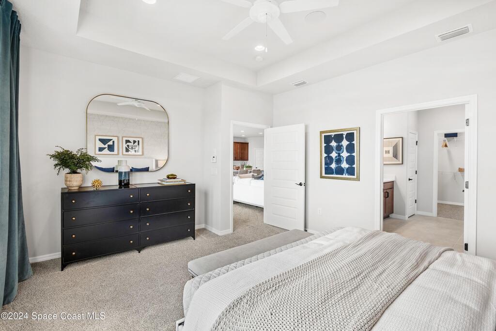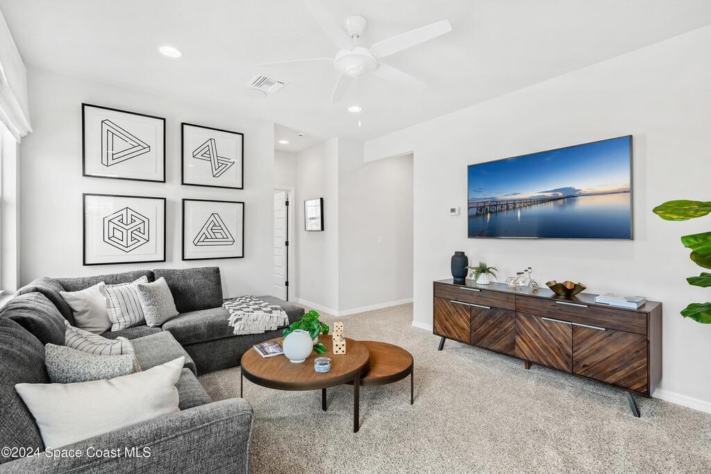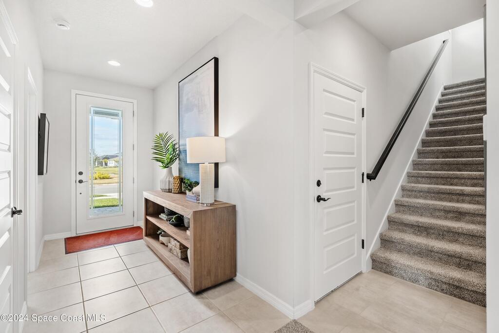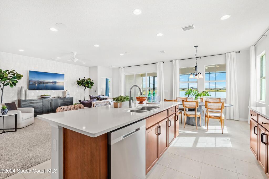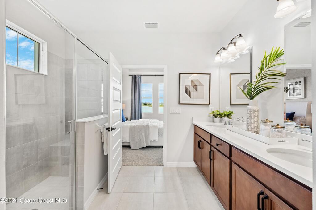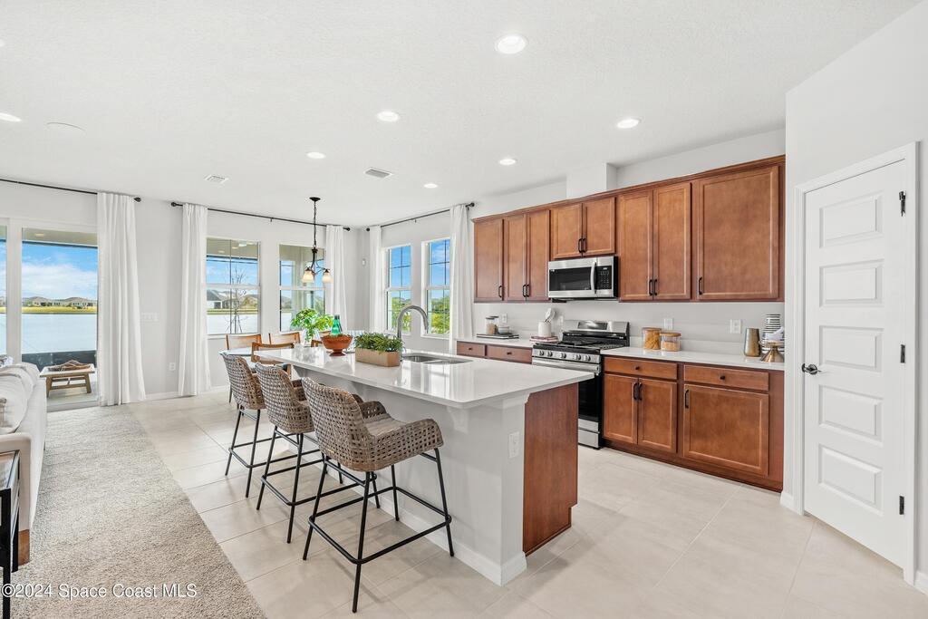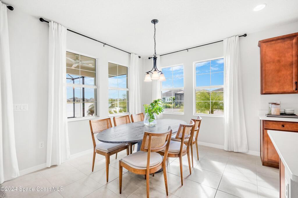 Lakefront Former Model Home in Viera where modern elegance meets an active, amenity-rich lifestyle. Built in 2023 and sited for long water views, this home welcomes you with brand new luxury vinyl plank flooring through the main living areas and an open floorplan with high ceilings that frame the lake from an oversized screened porch an ideal spot for morning coffee, sunset gatherings, or relaxed entertaining. The gourmet island kitchen features quartz countertops, stainless steel appliances, a pantry, and a large dining area overlooking the water, while a dedicated office with French doors provides a quiet workspace. The downstairs primary suite offers an expansive walk-in closet and a spa-like bath with double sinks, and two additional bedrooms plus two full baths on the main level ensure comfortable space for family and guests. Upstairs a spacious loft serves as a flexible family or recreation room accompanied by an additional bedroom and full bath. Located in Viera's award