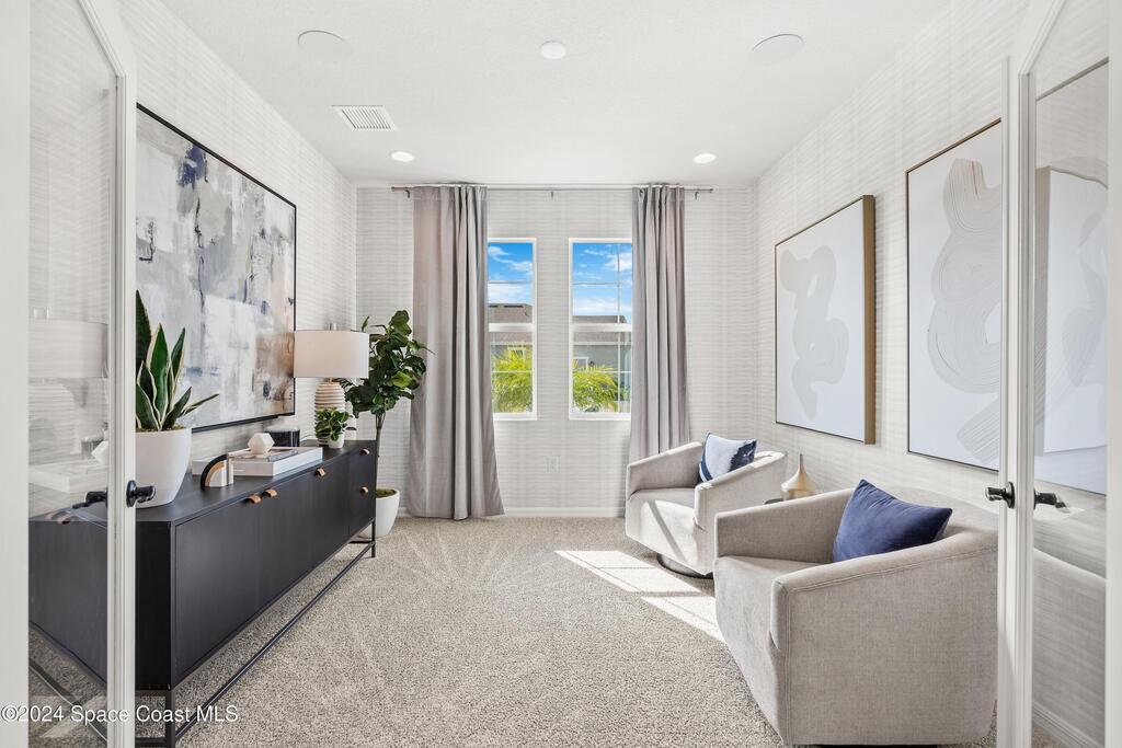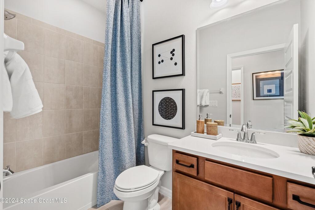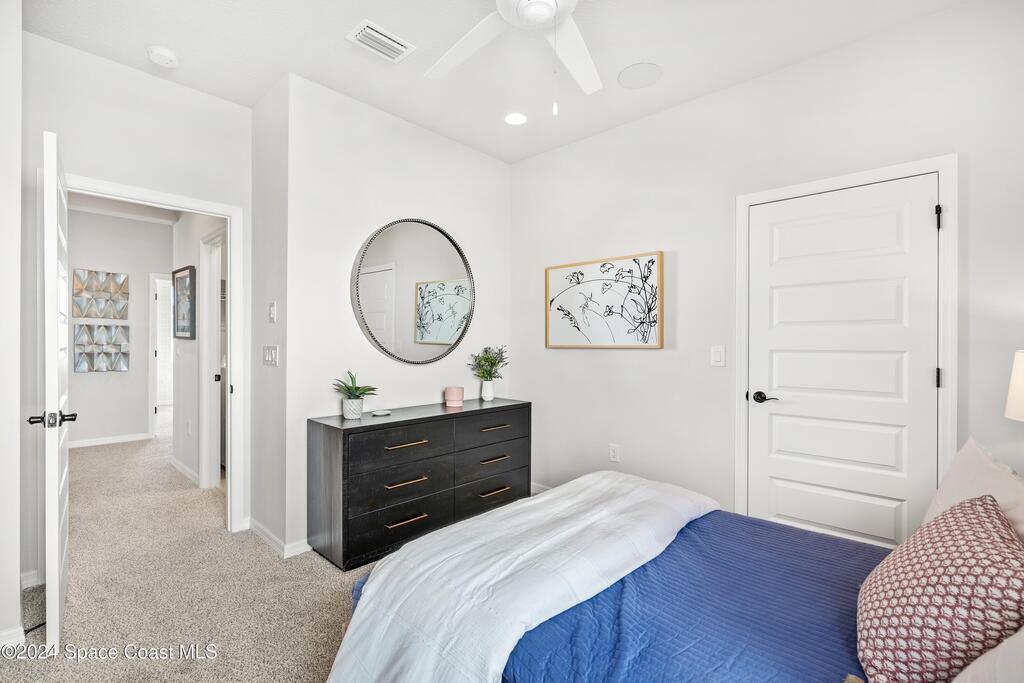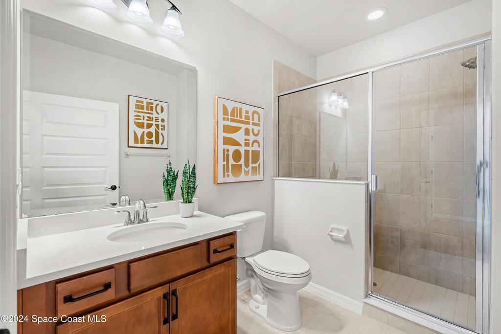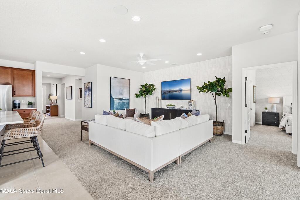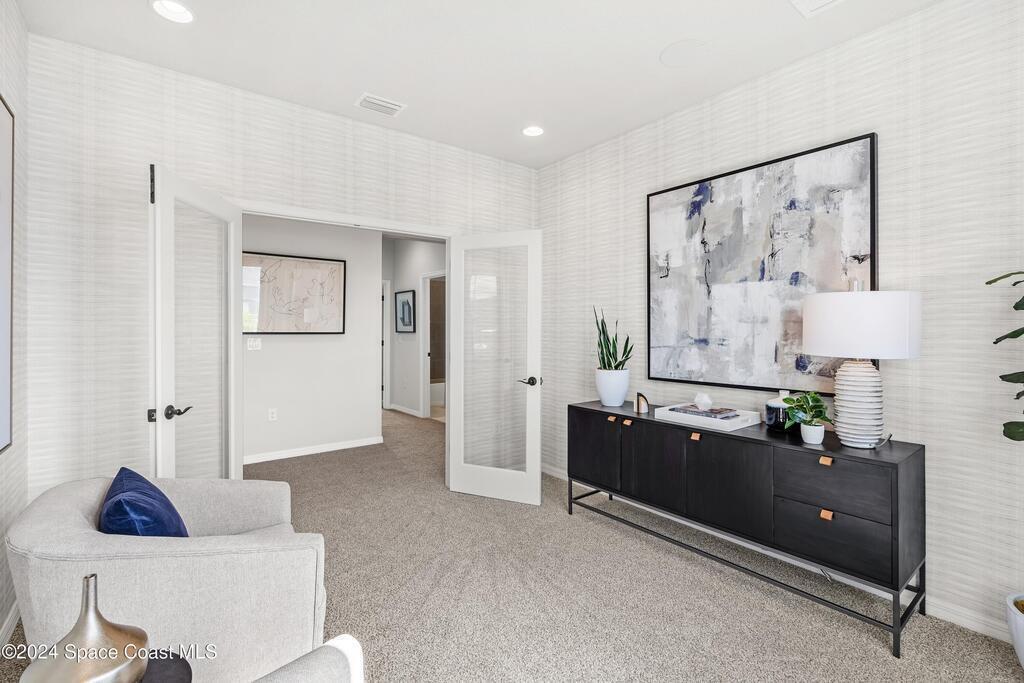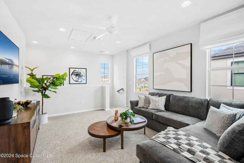 Lakefront Former Model Home in Viera where modern elegance meets an active, amenity-rich lifestyle. Built in 2023 and sited for long water views, this home welcomes you with brand new luxury vinyl plank flooring through the main living areas and an open floorplan with high ceilings that frame the lake from an oversized screened porch an ideal spot for morning coffee, sunset gatherings, or relaxed entertaining. The gourmet island kitchen features quartz countertops, stainless steel appliances, a pantry, and a large dining area overlooking the water, while a dedicated office with French doors provides a quiet workspace. The downstairs primary suite offers an expansive walk-in closet and a spa-like bath with double sinks, and two additional bedrooms plus two full baths on the main level ensure comfortable space for family and guests. Upstairs a spacious loft serves as a flexible family or recreation room accompanied by an additional bedroom and full bath. Located in Viera's award