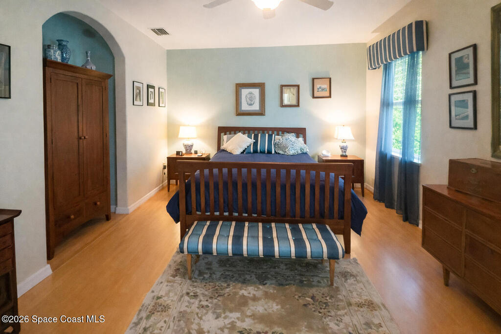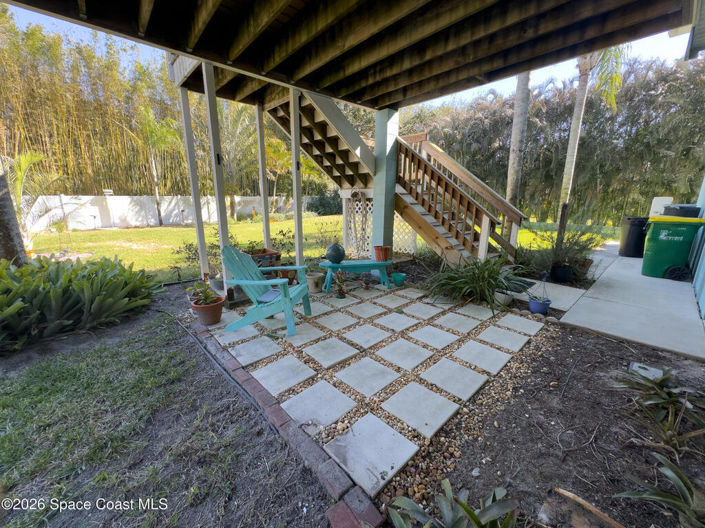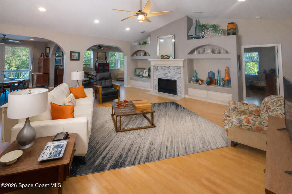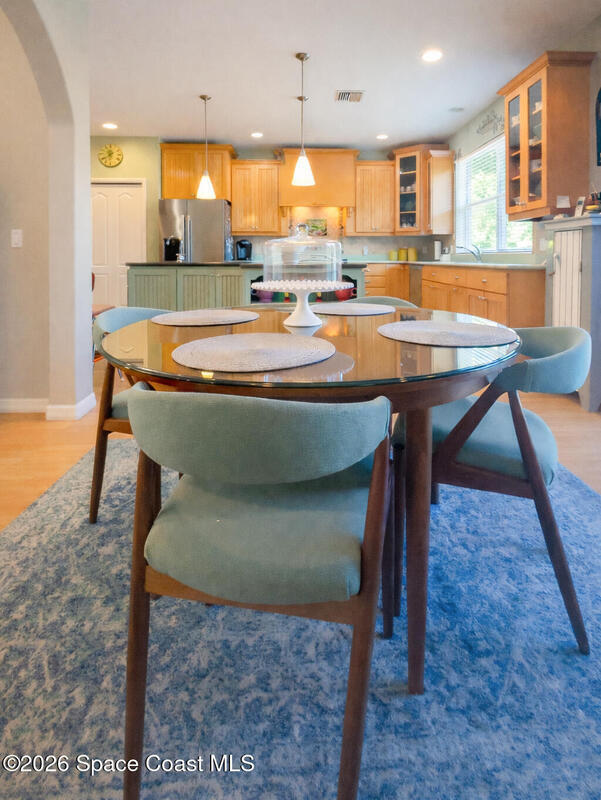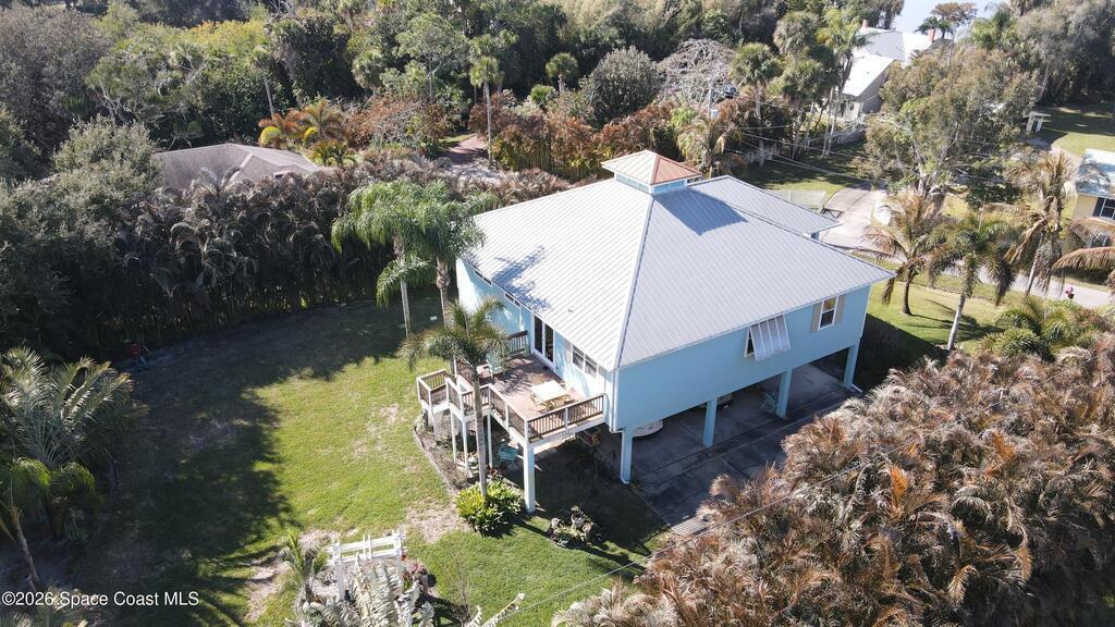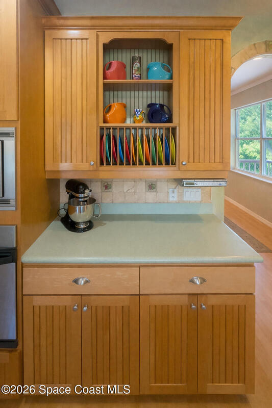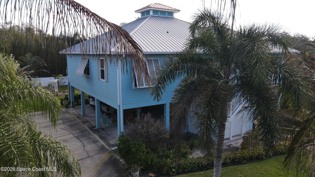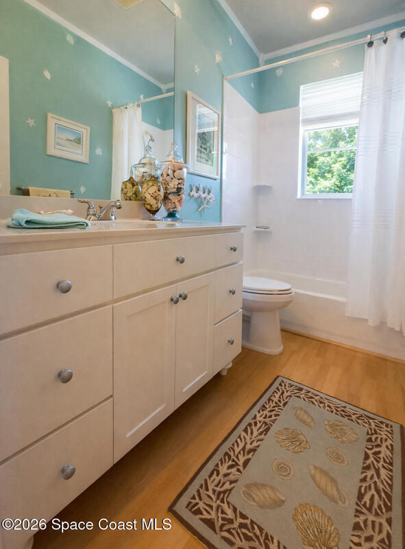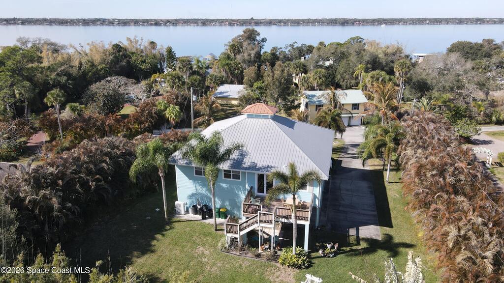 This custom home on .51 acre is available on market for the first time. Nestled on a secluded street in South Merritt Island this 3 bed 3 bath split floor plan home has many luxuries. The primary suite includes walk in closet & private en-suite with soaking tub, separate shower & double sink vanity. The second & third bedrooms have large closets w/high ceilings. Living room features include vaulted ceiling, built-ins, archways & decorative fireplace. Spacious den is flooded with natural light, eat in area off the kitchen gives extra space to entertain while the formal dining room can comfortably host larger gatherings. The kitchen features island, Silestone quartz countertops, solid wood cabinetry, stainless steel appliances & 2 sinks. Downstairs is an 800+ sqft under air & heat garage/workshop with 2 garage doors & a full bathroom. 2nd floor deck overlooks backyard, mature landscaping & sunrises. The 2nd floor porch as well as 4 car carport have beautiful views of the Indian River!