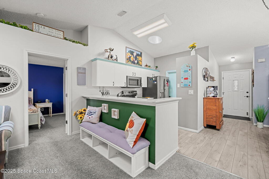 Pack a bag and escape the cold! This beautifully updated 3-bedroom, 2-bath, concrete block home is move-in ready! Nestled in a small, quiet cottage-style community with serene lake views, this cozy house is just 15 minutes from the ocean. Inside is all-new flooring, fresh interior & exterior paint, and plantation blinds throughout. The open-concept living area is filled with natural light, enhanced by new ceiling fans, solar tunnels and a fun, beach-inspired color palette. The updated kitchen features quartz countertops, newer stainless steel appliances, ample cabinet space and a pantry. A split floor plan offers privacy to guests. Enjoy peaceful mornings with coffee by the lake in your private back patio oasis.The 2019 roof adds peace of mind, and the entire home has been thoughtfully maintained and styled for low-maintenance, high-comfort living. Located minutes from top-rated schools, shopping centers, and local restaurants, this home truly has it all.