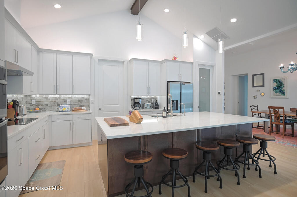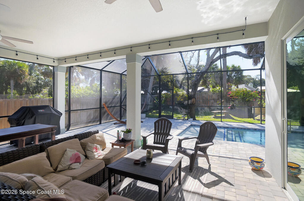Fall in love with this 2024 newly built Lifestyle home that is designed for effortless luxury. Quality built with concrete block and shows like brand new build. This five-bedroom, three-bath residence boasts continuous tile flooring, vaulted ceilings, quartz countertops gracing every surface, huge walk in pantry in kitchen, automated pool system and lighting. Open concept great room has high ceiling and lots of natural lighting. Huge dining space plus living room all open to gourmet kitchen with giant center island, S/S appliances and induction cook top. High-end wall microwave oven combo, recessed lighting, and counter-height bar seating elevate daily living. Outdoors enjoy a giant, impressive screened in pavered lanai with heated, salt pool and spa. Pool is perfect length for swimming laps. Big fenced in yard to play in has shed for extra storage. Huge 3 car garage with epoxy flooring. Driveway is pavered and has front porch to relax. Walk to ocean access w/clubhouse and playground