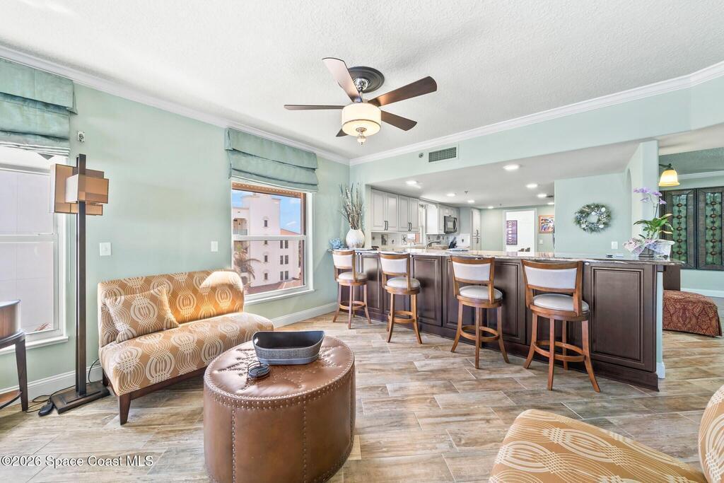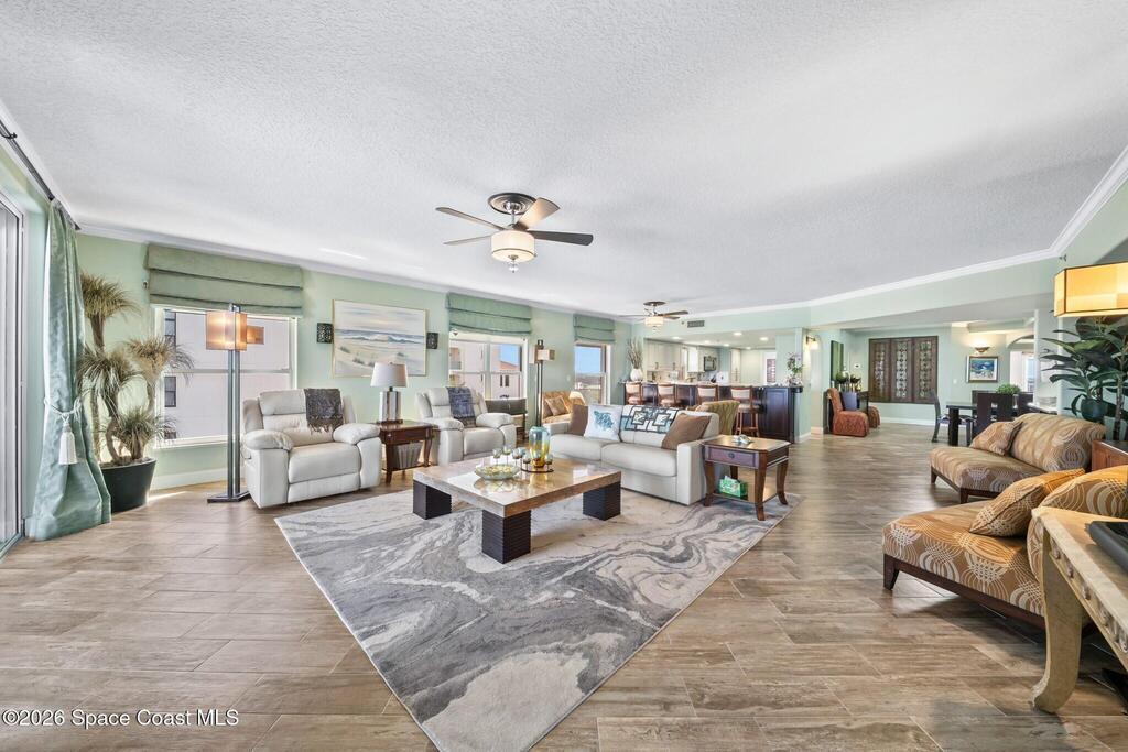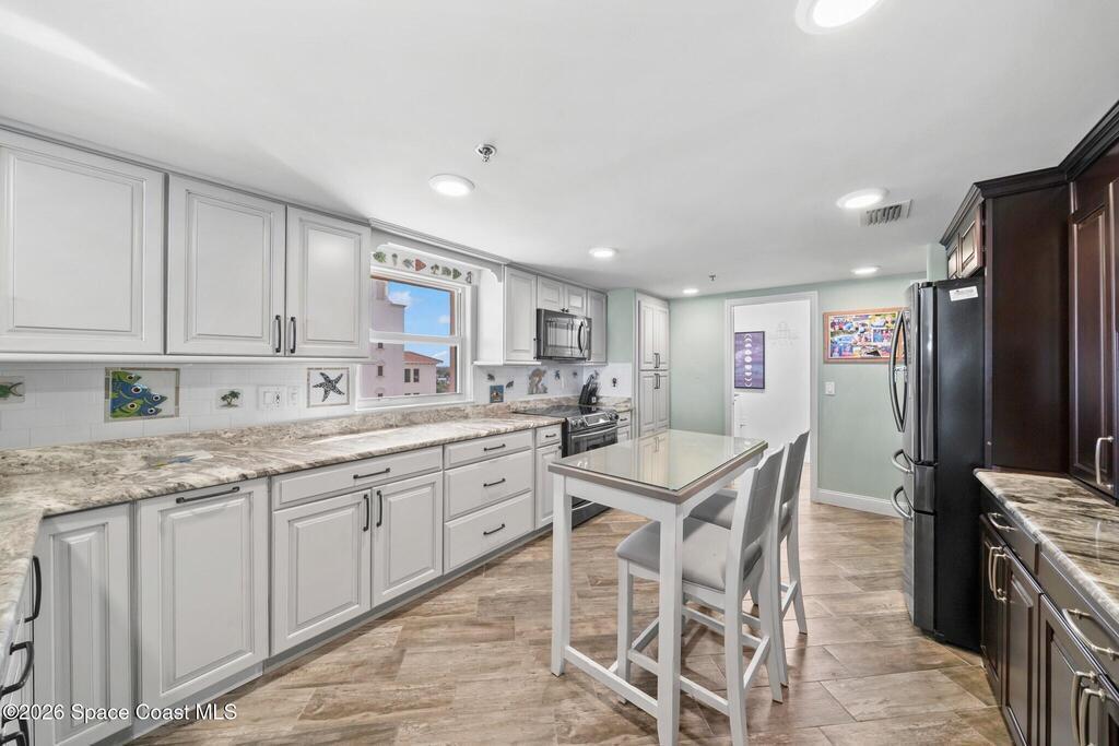 SE- corner unit on the 5th floor of the beautiful Barringer Condominium with stunning, direct ocean views! This spacious, updated residence offers over 2,600 sq. ft. of coastal living with angled wood-look tile throughout. The open kitchen features custom cabinetry, designer backsplash, and upgraded stainless steel appliances, including a double-oven range. Additional upgrades include an EcoSmart tankless water heater & water filter system. The primary suite enjoys breathtaking water views, two walk-in closets with professional organizers & a spa-like bath with soaking tub, custom cabinetry & large walk-in shower. Electric hurricane shutters, two garage parking spaces, and private storage are included. The exclusive, owner-occupied Barringer community offers a heated oceanfront pool, private beach access, secured lobby entry, and enclosed garage parking. Centrally located between the causeways!