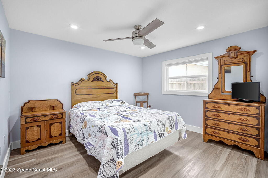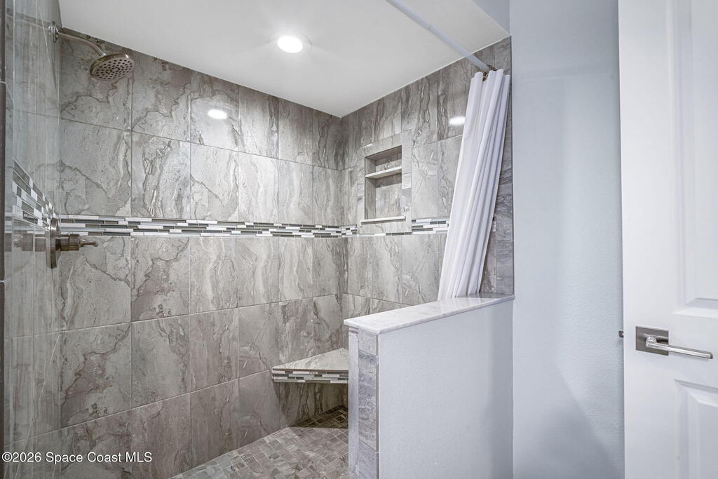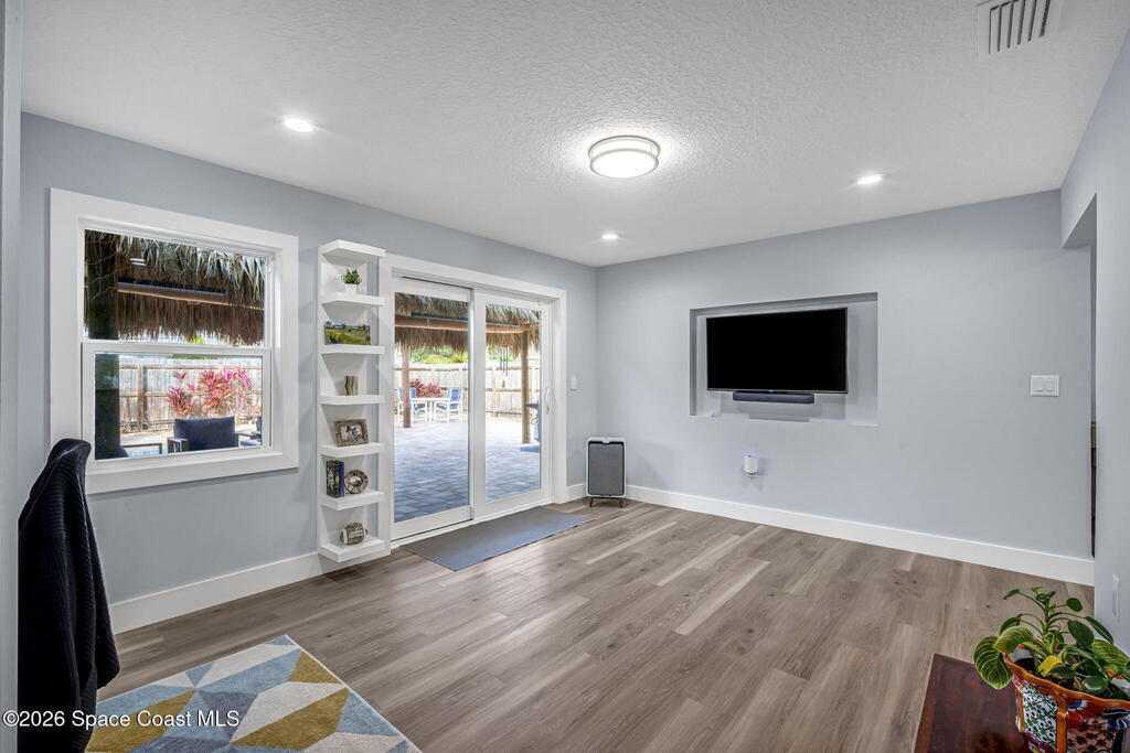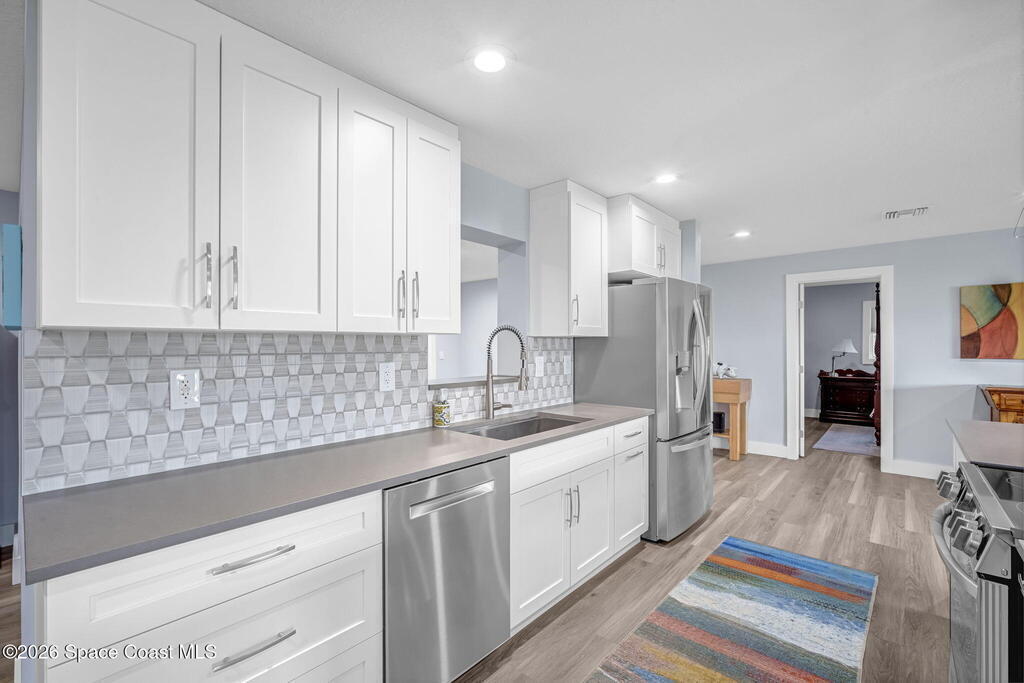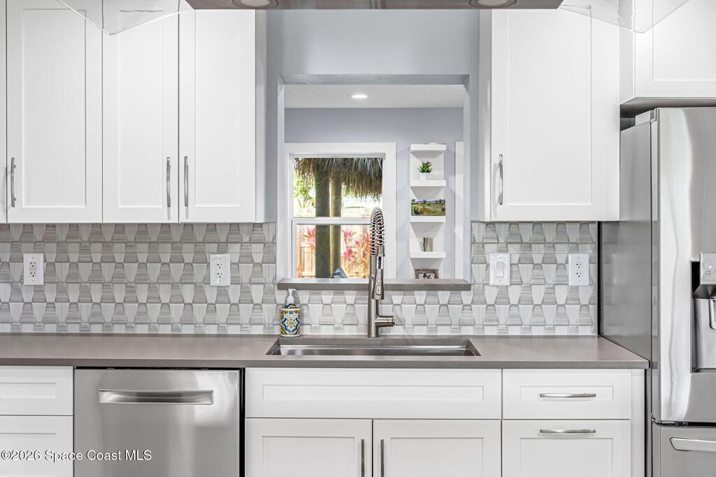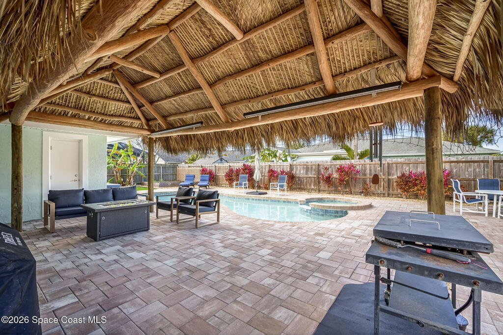 Turnkey coastal living in this beautifully updated Central Merritt Island home, tucked in a family-friendly neighborhood with sidewalk-lined streets. Inside, a bright open floor plan features luxury vinyl flooring and abundant natural light. The desirable Arthur Rutenberg split-bedroom design offers comfort and privacy. The kitchen shines with solid wood white shaker cabinets, soft-close drawers, quartz countertops, and generous storage. The primary suite is a true retreat with a walk-in closet with built-ins, double vanity, glass shower, and spa-like soaking tub. Two spacious guest bedrooms share a fully remodeled pool bath. Out back, enjoy a tiki hut, paver patio, and newly resurfaced pool and spa--perfect for relaxed island entertaining. Major updates include hurricane windows and doors, new electrical and lighting, trim and interior doors, new A/C with all ducts replaced, and indoor laundry with built-in pantry!