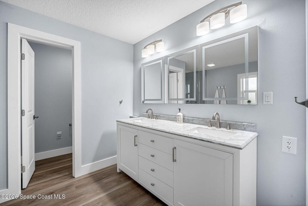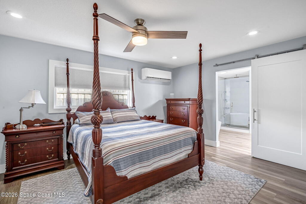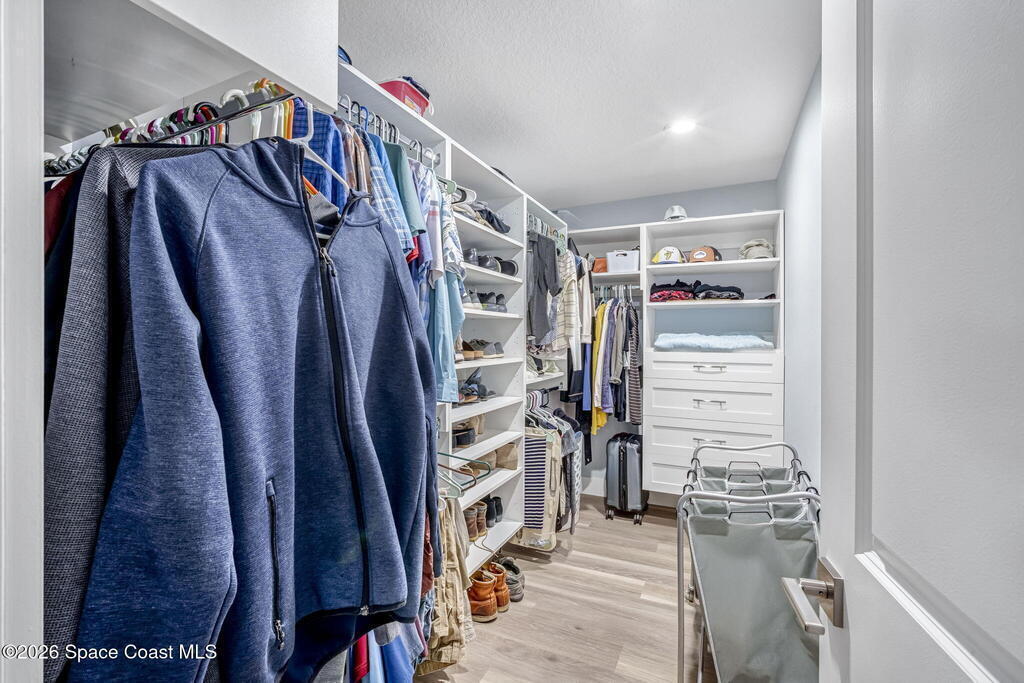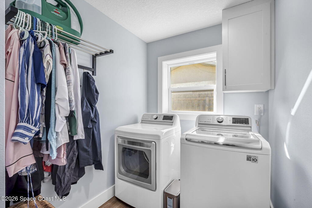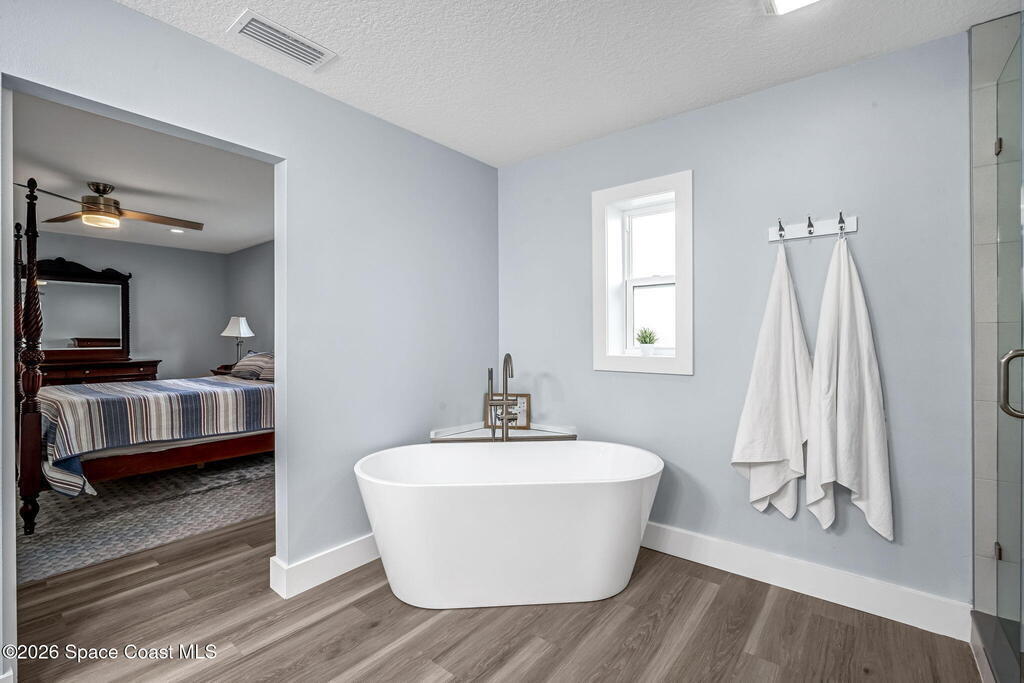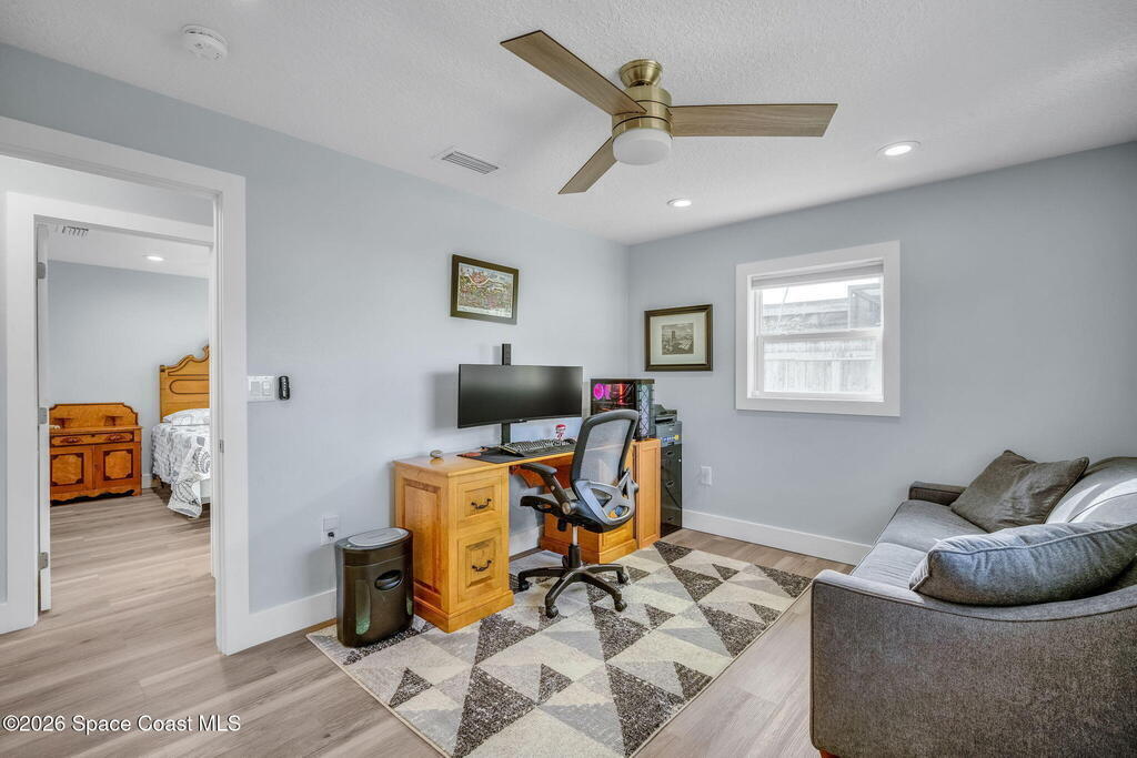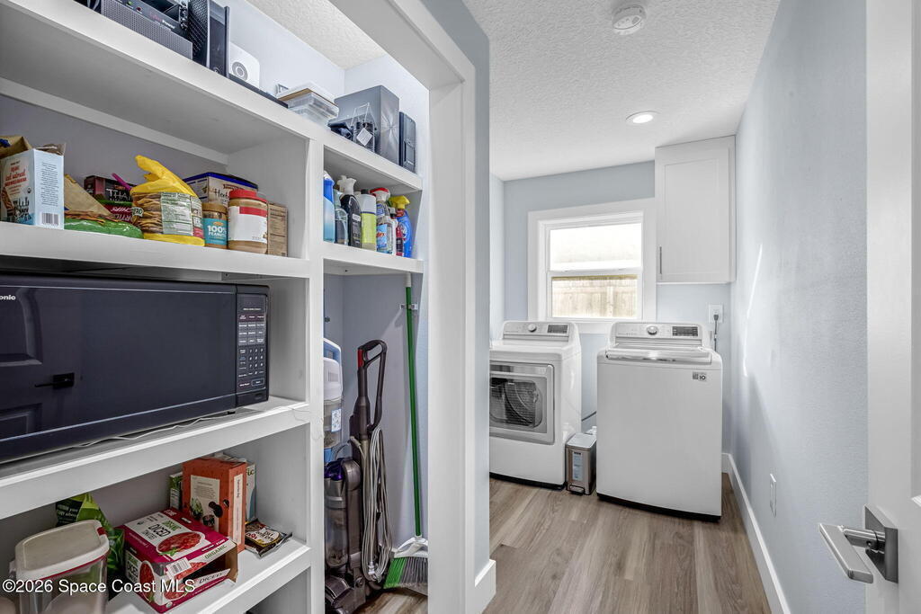 Turnkey coastal living in this beautifully updated Central Merritt Island home, tucked in a family-friendly neighborhood with sidewalk-lined streets. Inside, a bright open floor plan features luxury vinyl flooring and abundant natural light. The desirable Arthur Rutenberg split-bedroom design offers comfort and privacy. The kitchen shines with solid wood white shaker cabinets, soft-close drawers, quartz countertops, and generous storage. The primary suite is a true retreat with a walk-in closet with built-ins, double vanity, glass shower, and spa-like soaking tub. Two spacious guest bedrooms share a fully remodeled pool bath. Out back, enjoy a tiki hut, paver patio, and newly resurfaced pool and spa--perfect for relaxed island entertaining. Major updates include hurricane windows and doors, new electrical and lighting, trim and interior doors, new A/C with all ducts replaced, and indoor laundry with built-in pantry!