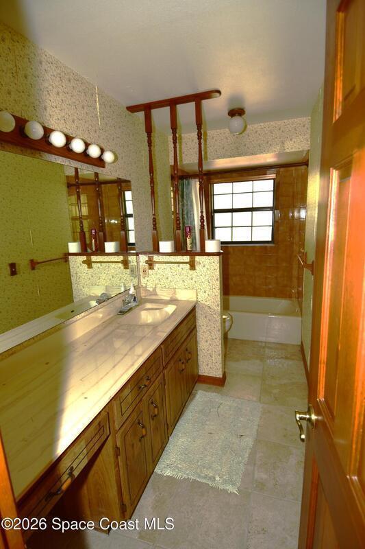 Check this house out! It is located just off of Carpenter Road area of Titusville with unusual (for Florida) rolling hillls. This 4 bedroom, 3 bathroom home is located on a one acre lot and overlooks a beautiful small lake. Tranquil is the best way to describe this setting. This spacious home has 3 bedrooms and 2 bathrooms on the upper floor and another bedroom and bathroom on the ground floor that could also be used as an office, a hobby room, or a mother in law suite. This home has plenty of room for entertaining. Large Family Room with an adjoining 11 foot by 41 foot enclosed air conditioned porch/sun room. The kitchen is massive with lots of built in cabinetry for plenty of storage. Formal Dining Room and Living Room provides Guests and Family plenty of room to spread out. This home needs some love but has endless potential.