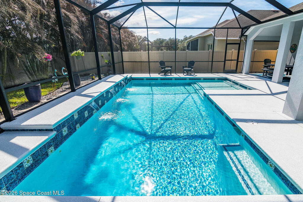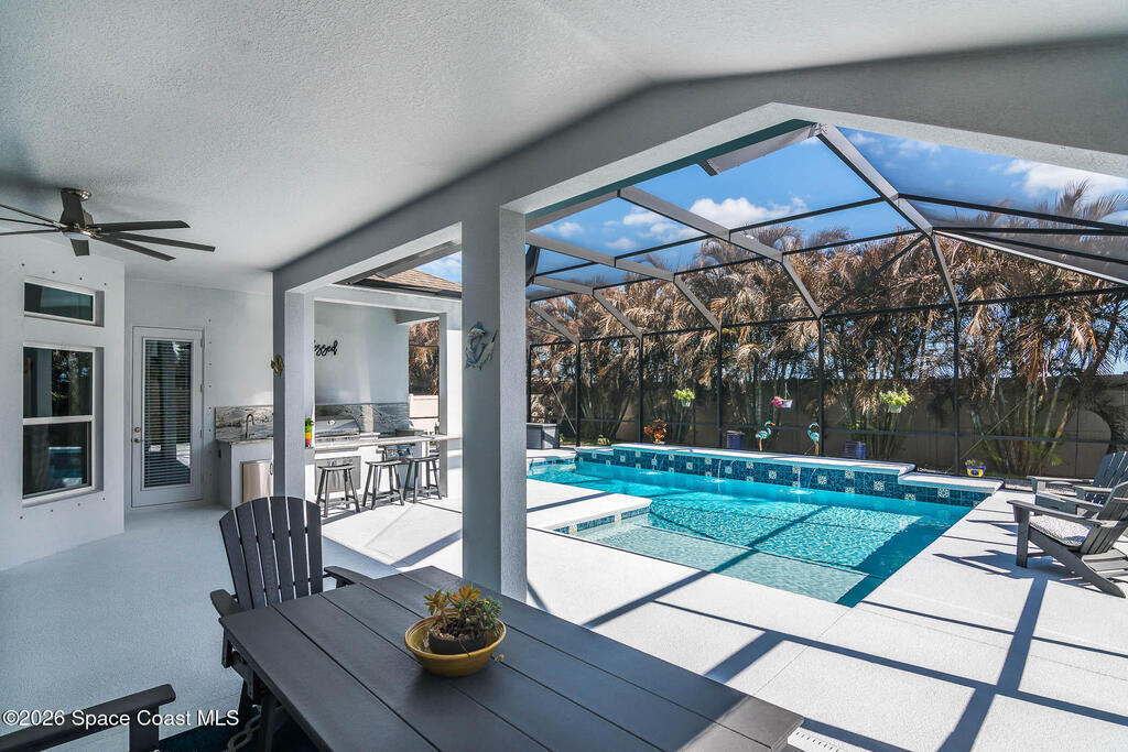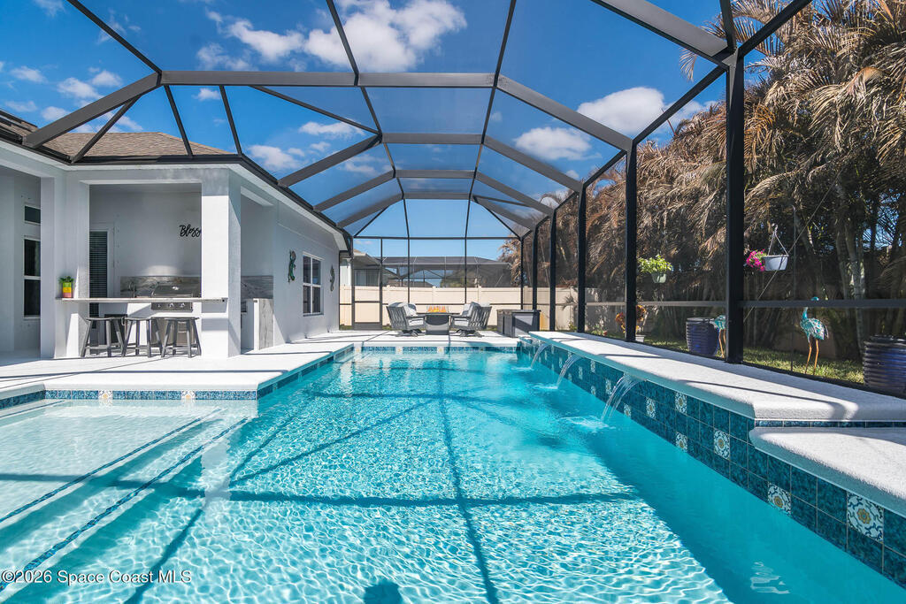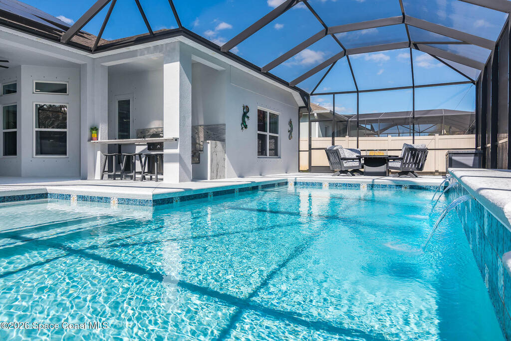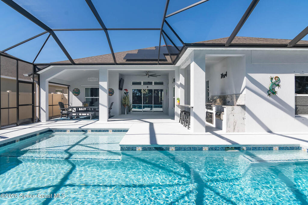 Immaculate home just 9 min. from the beach, close to shops, restaurants, grocery stores & A-rated schools. Designed for comfort & entertaining, this open-plan home features an exceptional outdoor living space with a summer kitchen, including a grill & gas burners, plus a gorgeous swimming pool with a waterfall & shallow entry, ideal for kids or in-pool seating. Fully fenced yard w/ two gates & outdoor TV. Inside, enjoy high ceilings & wood-look tile throughout, paired w/ white cabinets & granite counters. The kitchen is a standout w/ SS appliances, wall microwave & oven, vent hood, supersized island & casual dining area overlooking the large lanai. Additional upgrades include extended driveway, epoxy-painted garage, cabinets in the laundry room, tankless gas water heater, AC w/ UV light & overflow safety system, security camera system & solar panels to be paid in full at closing. Owner averages only $50/month electric bill. Loaded w/ upgrades & thoughtfully designed for Florida living