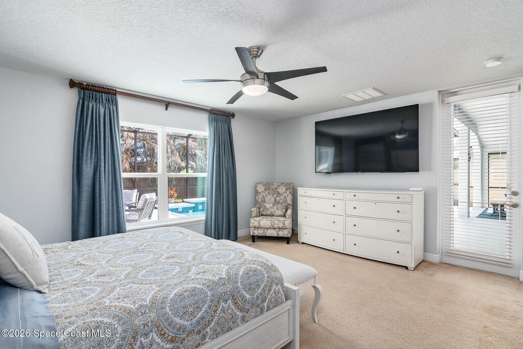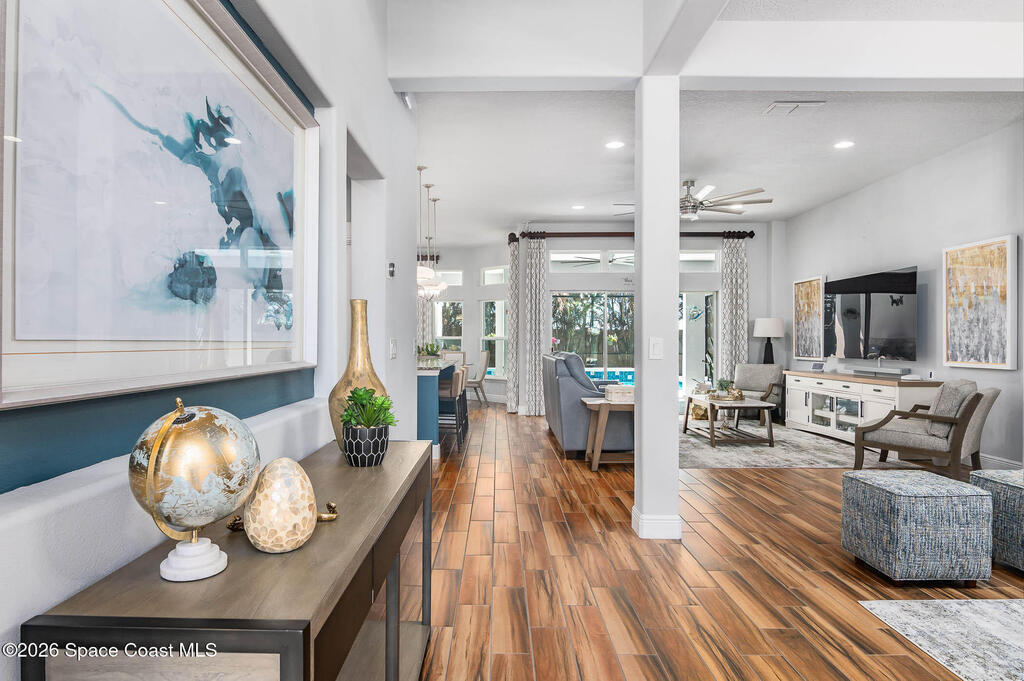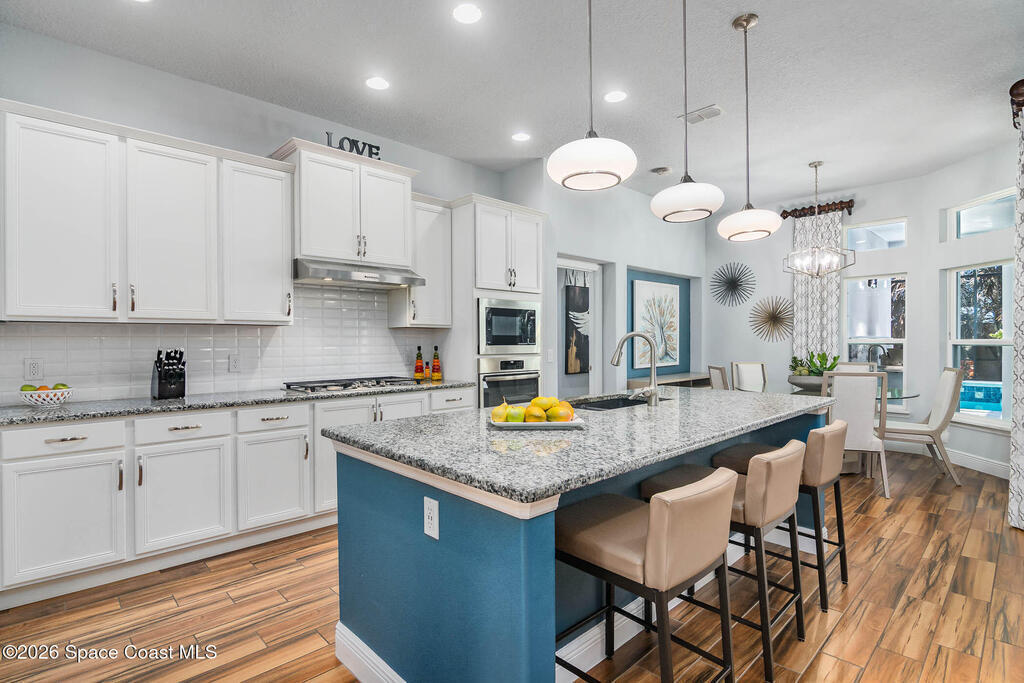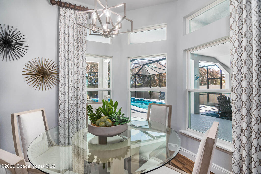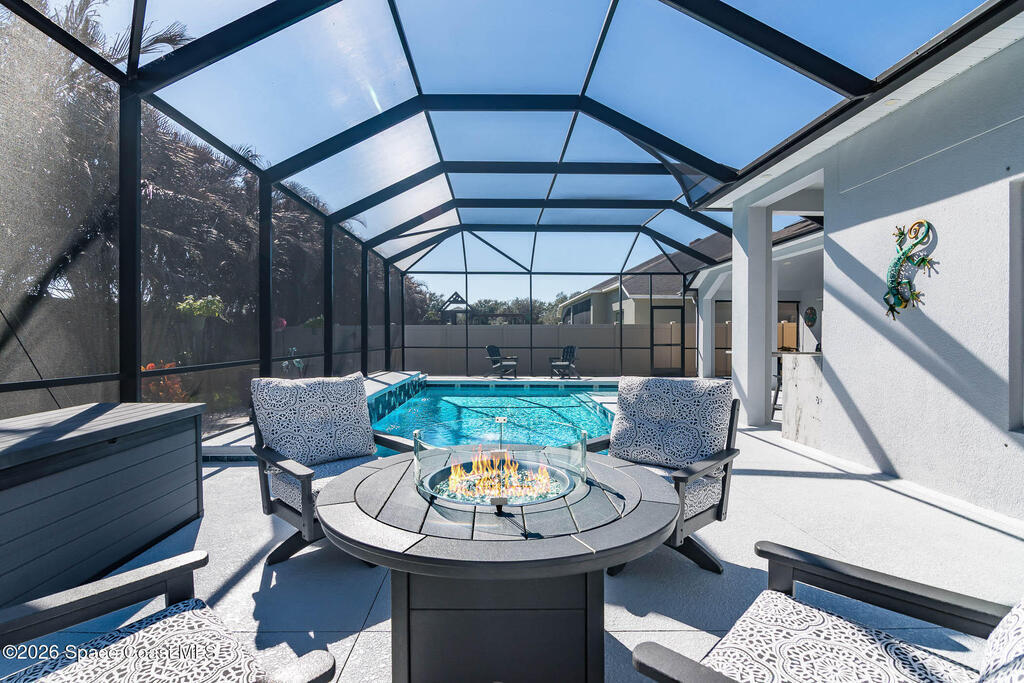 Immaculate home just 9 min. from the beach, close to shops, restaurants, grocery stores & A-rated schools. Designed for comfort & entertaining, this open-plan home features an exceptional outdoor living space with a summer kitchen, including a grill & gas burners, plus a gorgeous swimming pool with a waterfall & shallow entry, ideal for kids or in-pool seating. Fully fenced yard w/ two gates & outdoor TV. Inside, enjoy high ceilings & wood-look tile throughout, paired w/ white cabinets & granite counters. The kitchen is a standout w/ SS appliances, wall microwave & oven, vent hood, supersized island & casual dining area overlooking the large lanai. Additional upgrades include extended driveway, epoxy-painted garage, cabinets in the laundry room, tankless gas water heater, AC w/ UV light & overflow safety system, security camera system & solar panels to be paid in full at closing. Owner averages only $50/month electric bill. Loaded w/ upgrades & thoughtfully designed for Florida living