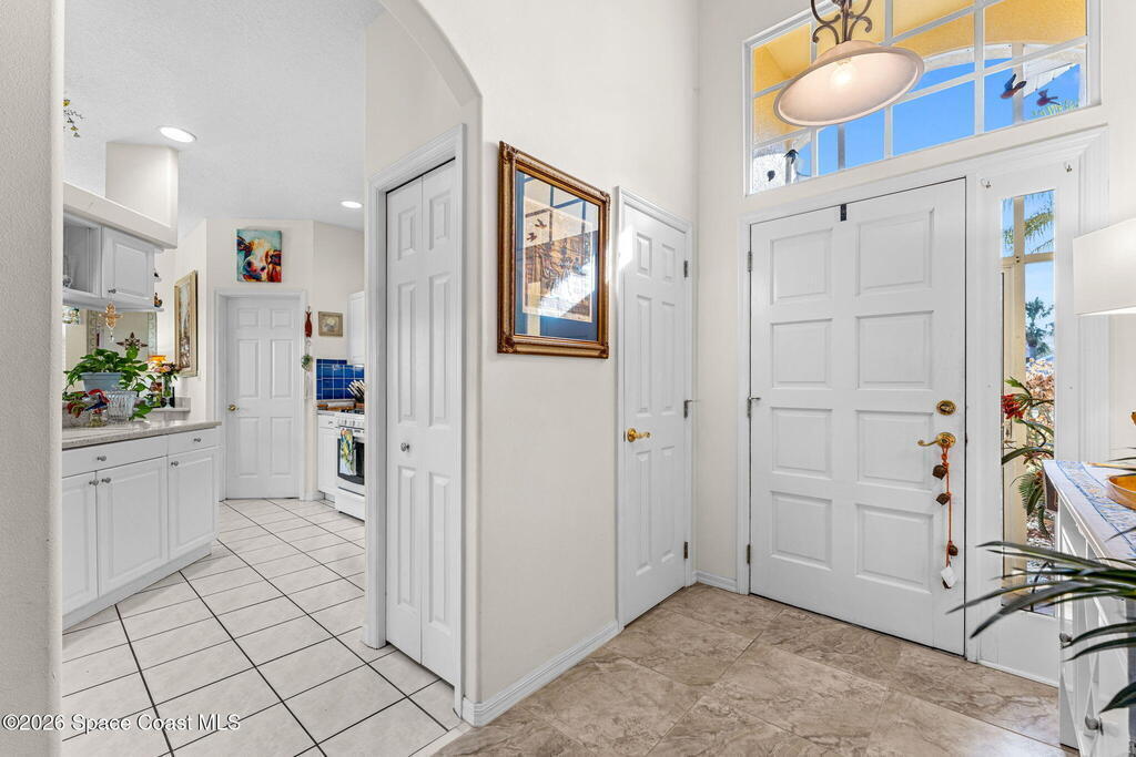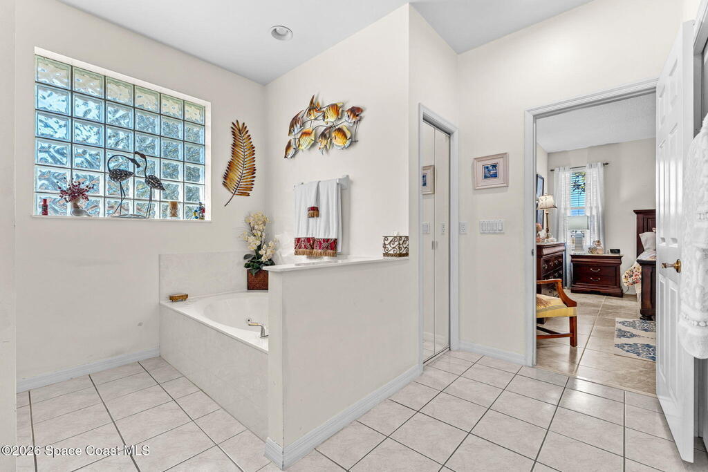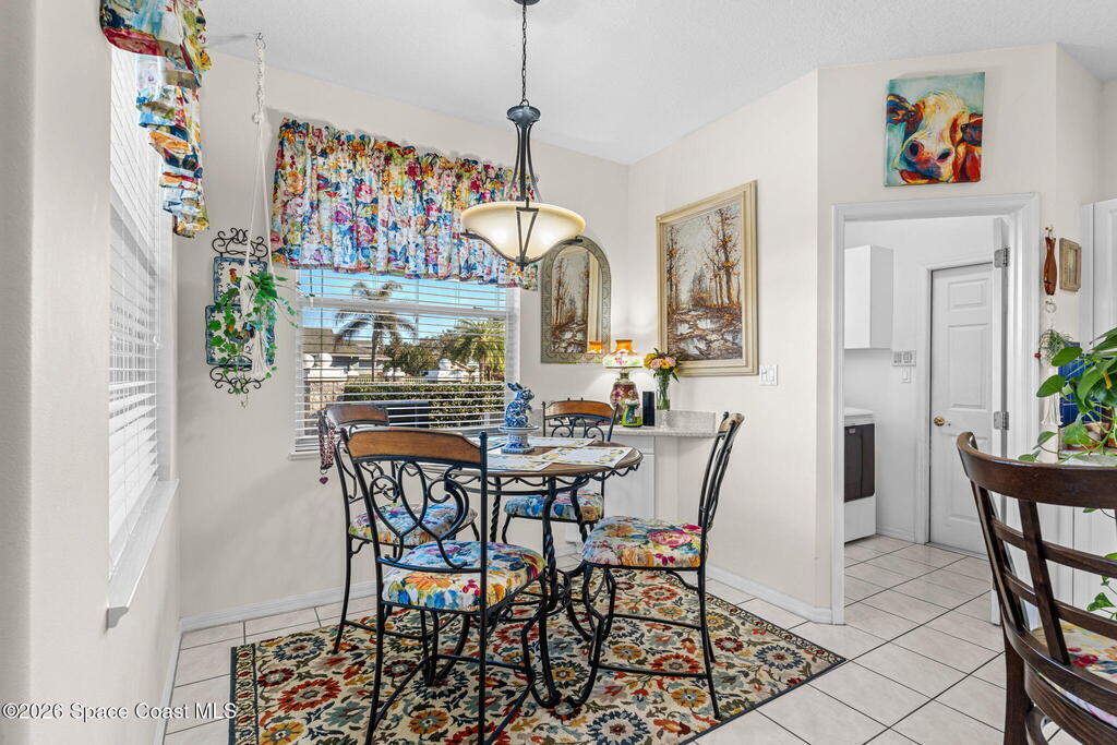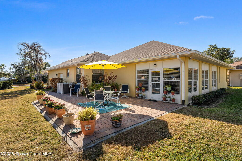 Beautiful 3BR/2BA home on a premium corner lot with water views in sought-after Viera East. Light and bright with abundant windows and tall ceilings. Spacious living and dining room combo opens to a large enclosed lanai with stunning lake and golf course views. Kitchen features a breakfast bar and a breakfast nook. Tile flooring throughout the main living areas. Generous primary suite with shower, tub, and 2 walk-in closets. Indoor laundry. Oversized garage has a separate golf cart entrance! Charming patio area perfect for outdoor dining and entertaining, complete with a gas outlet for a grill. Community amenities include a pool, a clubhouse, a fitness room, and a yummy on-site restaurant. Enjoy relaxed Florida living in this beautiful golf course setting!