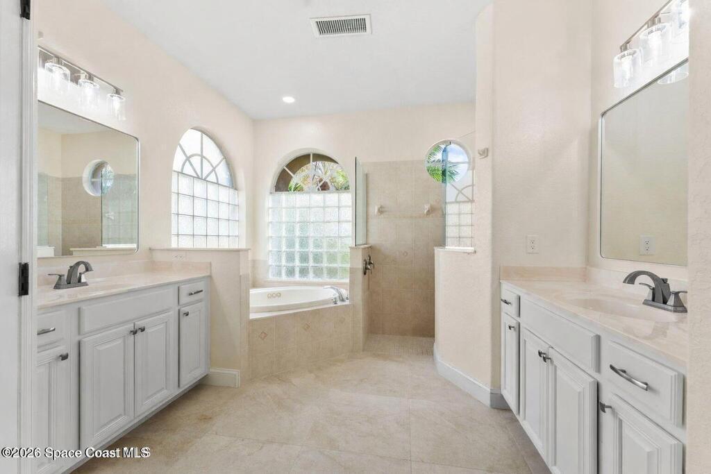 Bring an offer! Renovated in Ravencliffe at West Viera, this gated lakefront residence offers 2,913 sq ft of refined living with 5 bedrooms, 3 baths, & a flexible split floor plan designed for multi-generational living. The fifth bedroom can easily serve as a private office, den, or additional guest room to fit your needs. Primary suites on both levels provide privacy and versatility, with four bedrooms & two full baths on the main floor, while upstairs features a private retreat with its own bedroom, bath, and living area--ideal for guests or in-laws. The redesigned kitchen showcases custom cabinetry, quartz countertops, and premium appliances, flowing into a bright breakfast nook framed by panoramic lake views and a spacious backyard with room for a future pool. The guest bathroom has been beautifully remodeled, and the home features a blend of laminate, tile, and carpet flooring throughout. Additional upgrades include energy-efficient windows w/ automatic blinds, dual 2024 A/C units