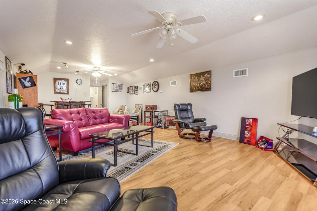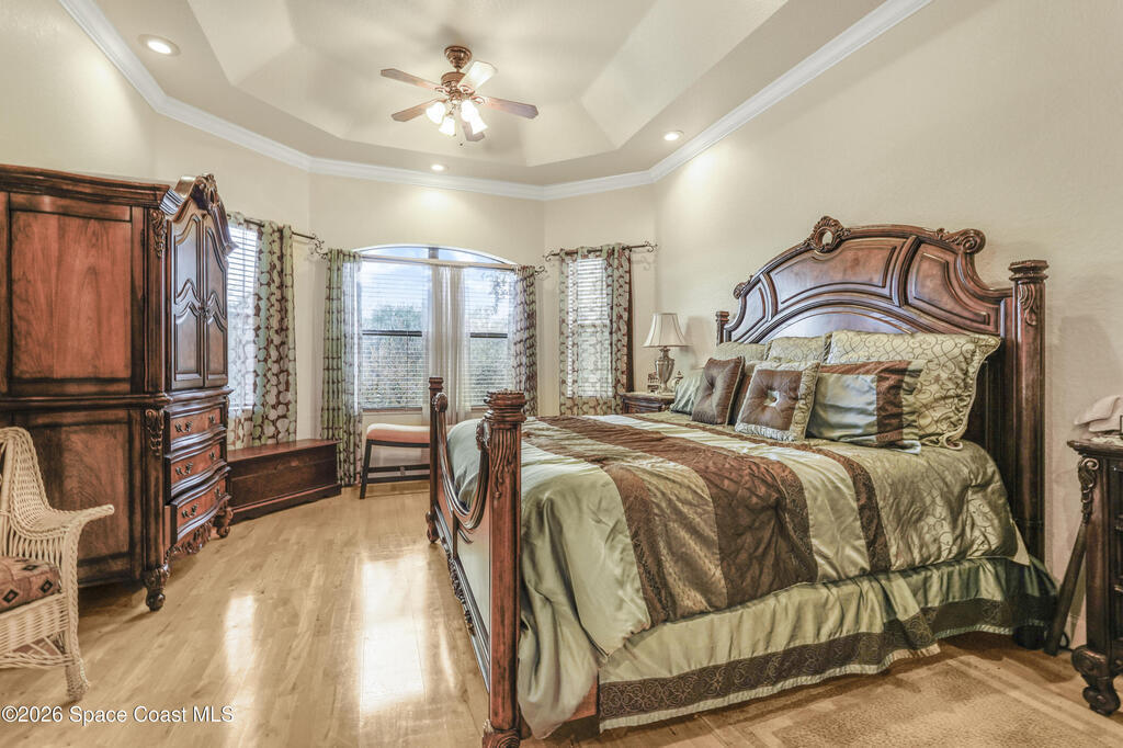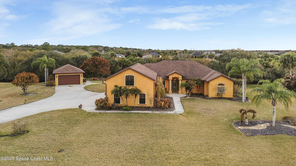 Situated on a full acre in the gated community of Rockledge Acres Estates, this 5-bedroom, 3-bathroom home offers space, privacy, and long-term pride of ownership, with only one owner in over 20 years.The home features tile flooring throughout the main living areas and wood flooring in the guest bedrooms and primary suite. A spacious kitchen opens to a separate dining area, ideal for holiday gatherings and entertaining. An upstairs loft with its own bathroom and closet provides flexible space for an entertainment room, guest suite, or home office.The primary suite includes his-and-her walk-in closets, dual tiled showers, and a jetted jacuzzi tub. Additional highlights include a three-car garage and a detached garage perfect for boat storage or extra vehicles.This rare property combines acreage, functionality, and gated community living in a highly desirable Rockledge location.