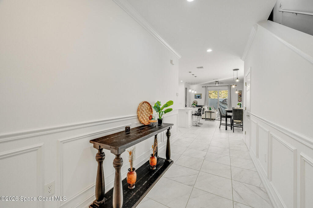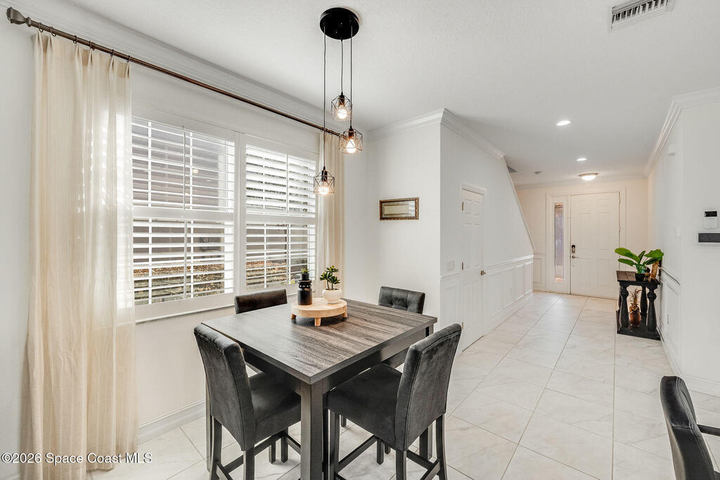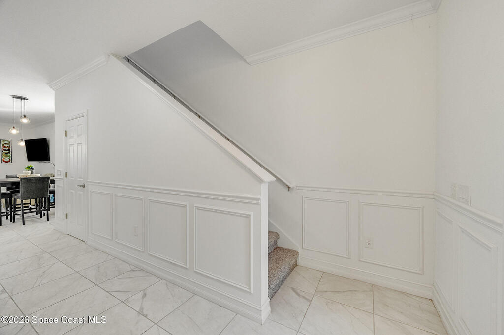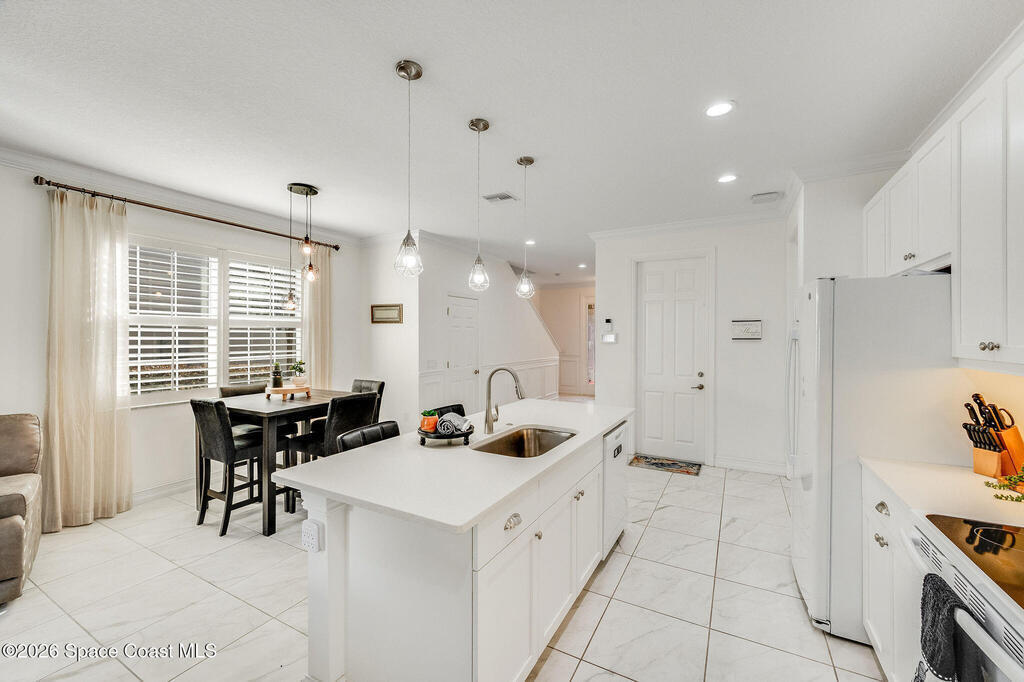 Built in 2020 and formerly the model home in Riverwalk of Melbourne, this end-unit townhome is filled with natural light and upscale finishes throughout. Featuring crisp white cabinetry, quartz countertops, marble-look tile flooring, crown molding, and custom woodwork accents, every detail was thoughtfully selected to showcase the builder's best design. While some homes in the community date back to 2007, this newer construction stands apart with modern style and energy efficiency. The open-concept layout flows beautifully for everyday living and entertaining. Enjoy a small fenced yard for added privacy and a finished garage with upgraded flooring -- a signature model home feature. Very lightly lived in and impeccably maintained, this move-in-ready home offers low-maintenance living in an ideal Melbourne location close to shopping, dining, major roadways, and the beaches.