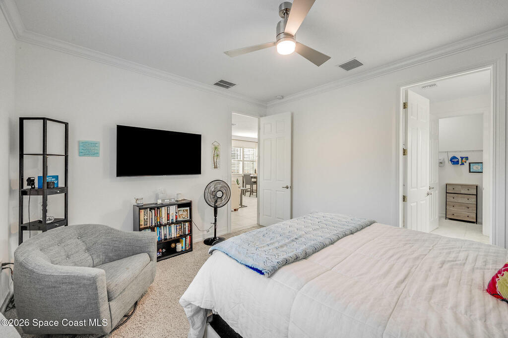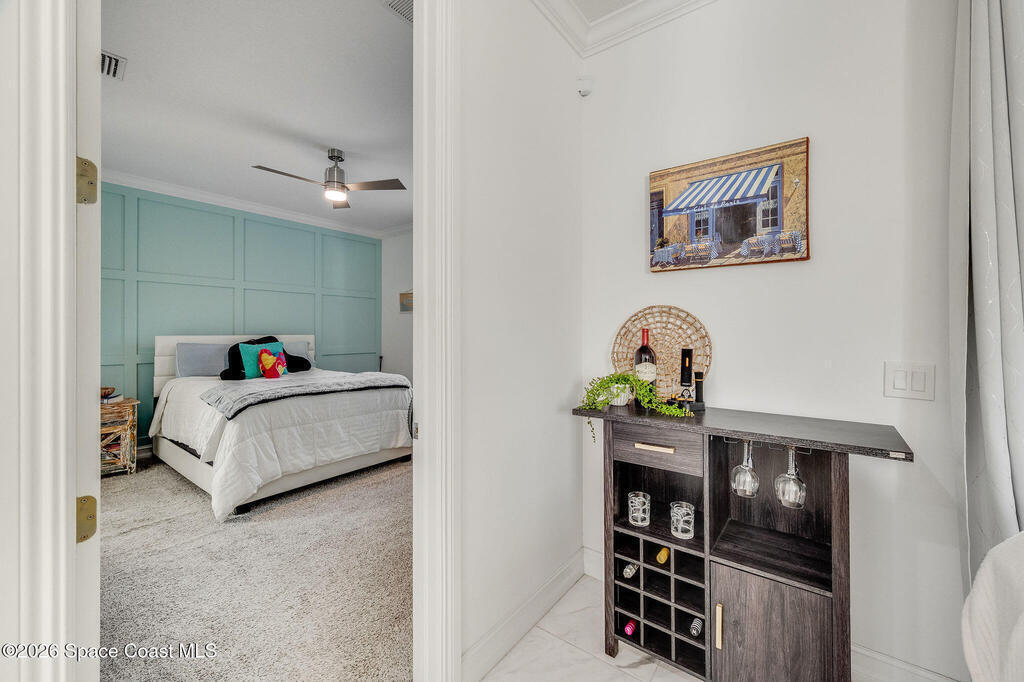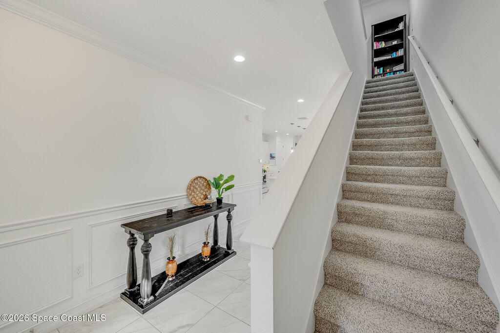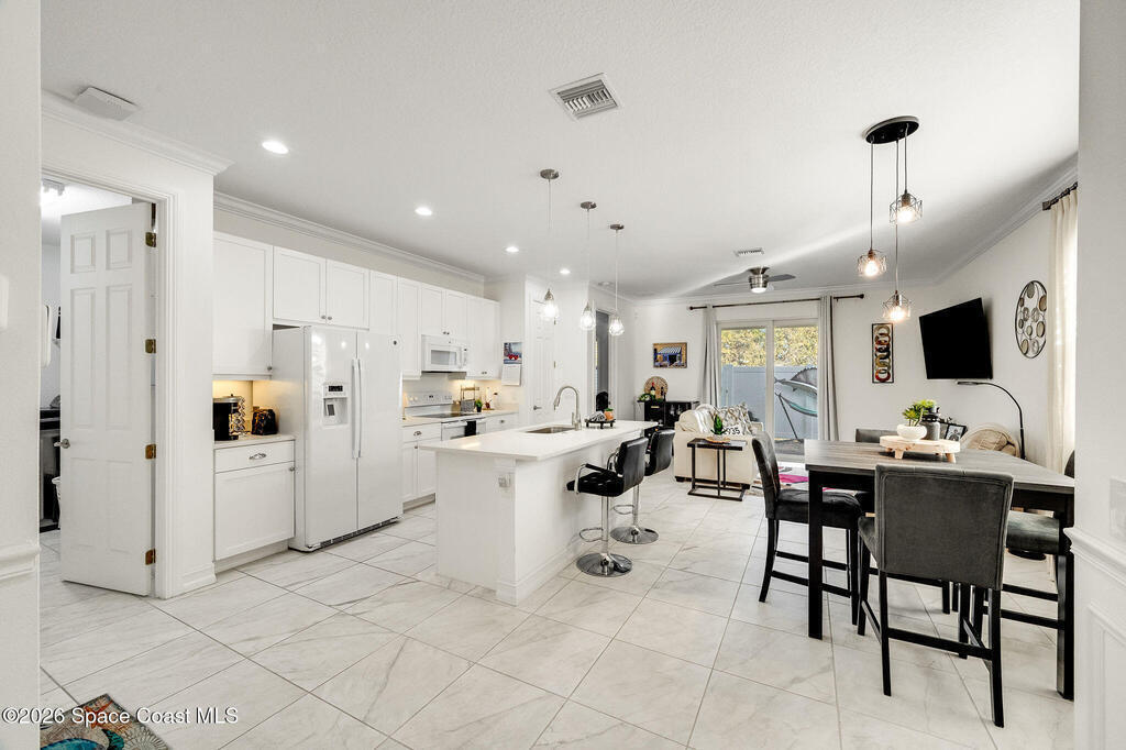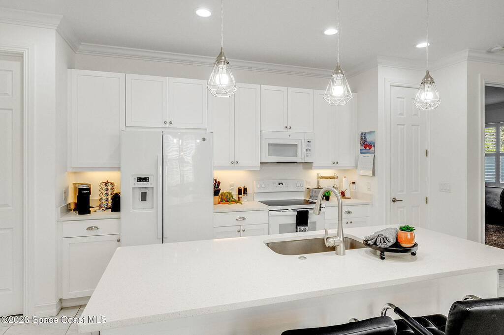 Built in 2020 and formerly the model home in Riverwalk of Melbourne, this end-unit townhome is filled with natural light and upscale finishes throughout. Featuring crisp white cabinetry, quartz countertops, marble-look tile flooring, crown molding, and custom woodwork accents, every detail was thoughtfully selected to showcase the builder's best design. While some homes in the community date back to 2007, this newer construction stands apart with modern style and energy efficiency. The open-concept layout flows beautifully for everyday living and entertaining. Enjoy a small fenced yard for added privacy and a finished garage with upgraded flooring -- a signature model home feature. Very lightly lived in and impeccably maintained, this move-in-ready home offers low-maintenance living in an ideal Melbourne location close to shopping, dining, major roadways, and the beaches.