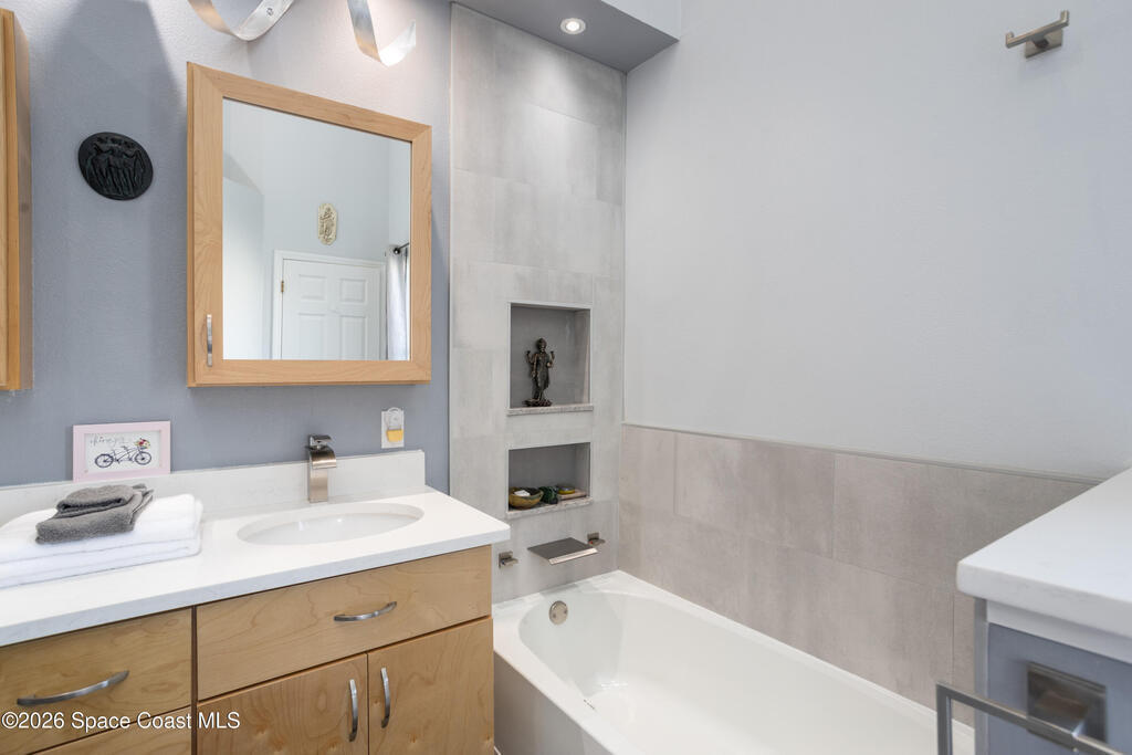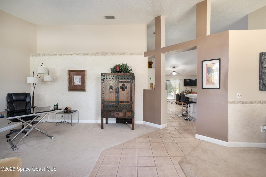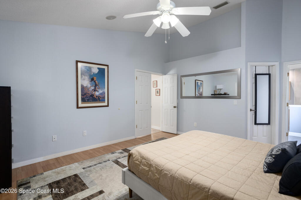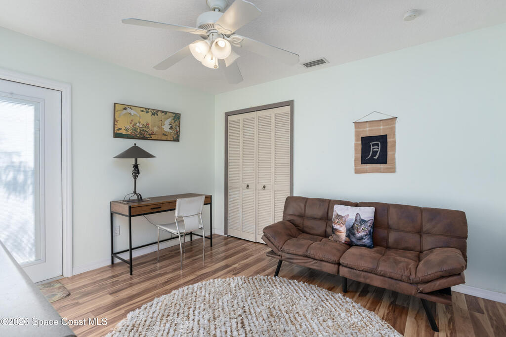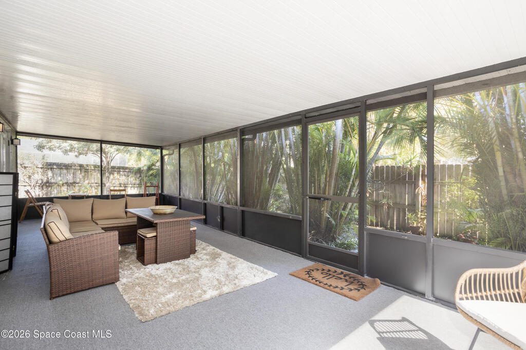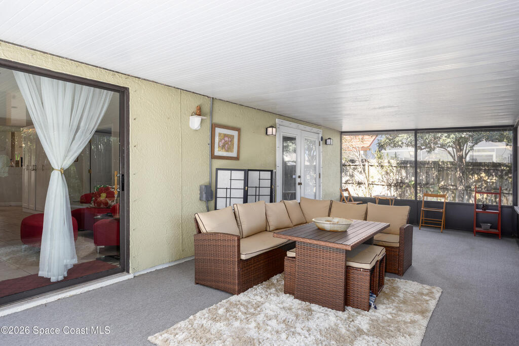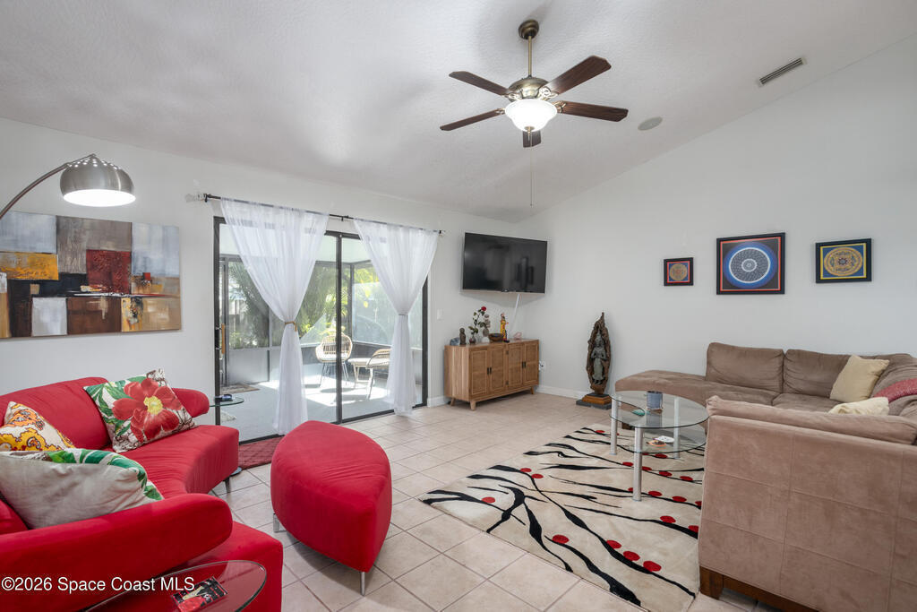 Tucked in Bel Aire Palms in Melbourne, this well-maintained 3-bedroom, 2.5-bath home offers light-filled space and thoughtful upgrades. Vaulted ceilings create an open feel throughout the main living areas. The spacious kitchen features smooth-top appliances, pull-out drawer cabinetry, and durable tile flooring, making it ideal for everyday living and entertaining.The primary suite includes a walk-in closet and walk-in shower, while two guest bedrooms provide flexible space for family, visitors, or a home office. One guest room features a private kitchenette, perfect for extended stays or multigenerational living.French doors lead to a screened back porch for easy indoor-outdoor living, overlooking a privacy-fenced yard. Added value includes hurricane shutters, city water and sewer, an indoor laundry room, a 2024 AC system, and a 2019 water heater.