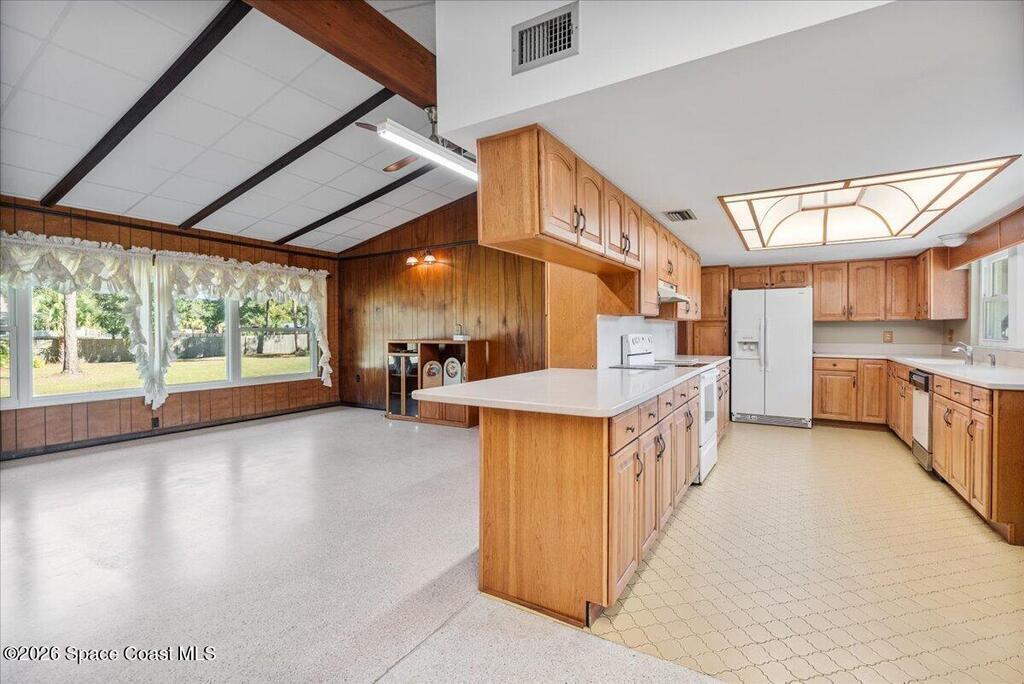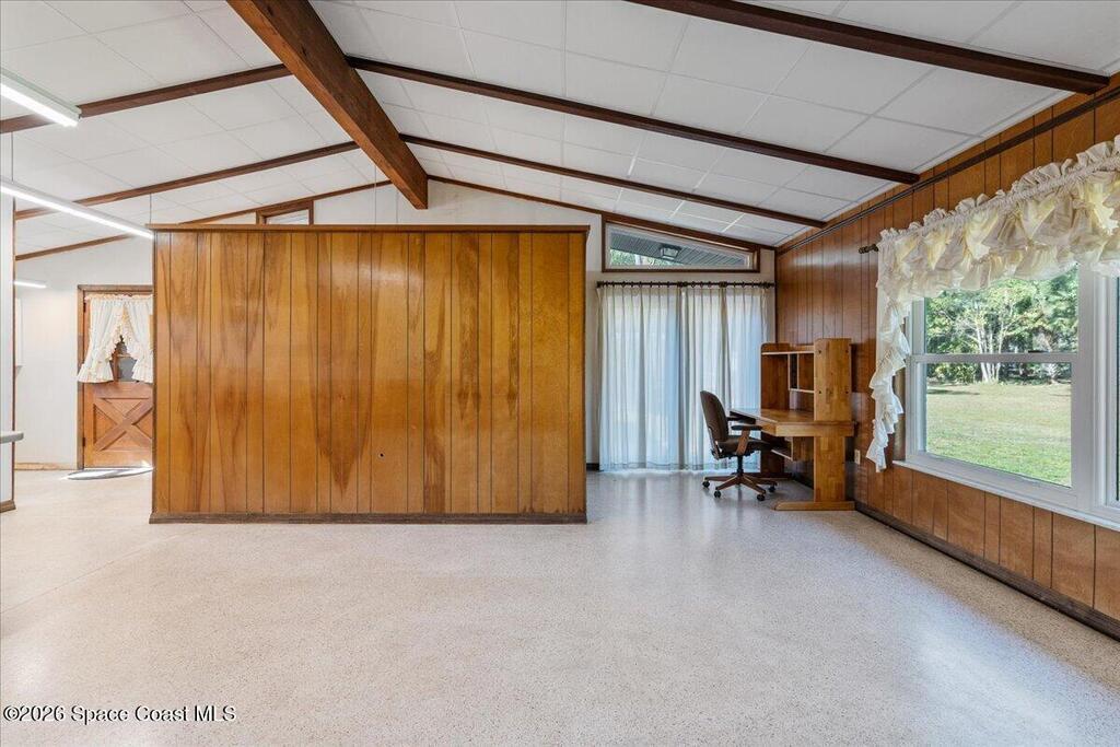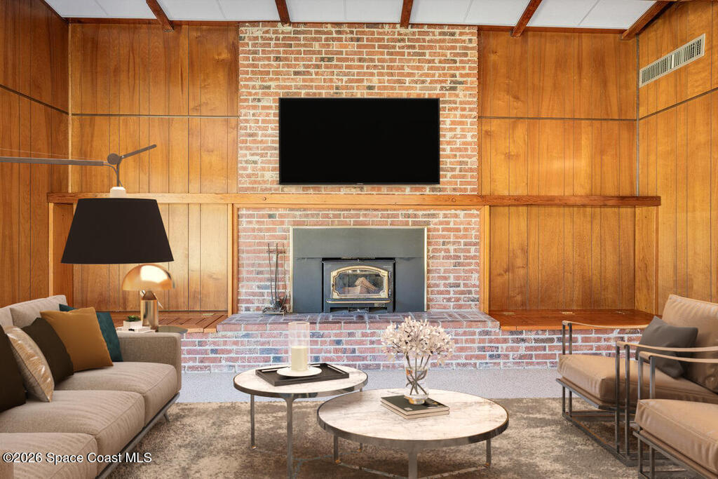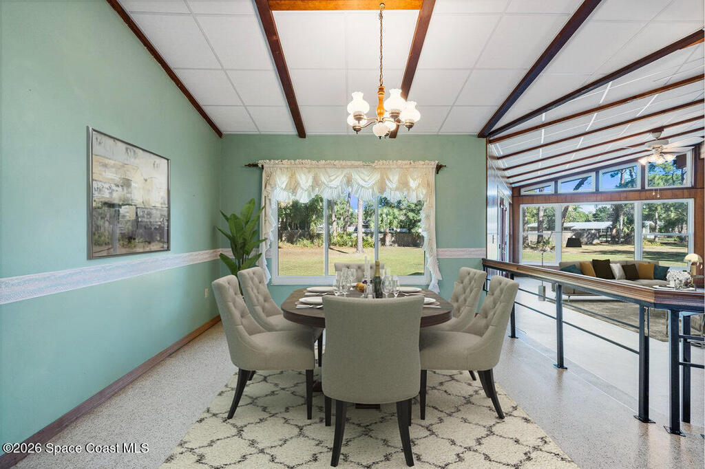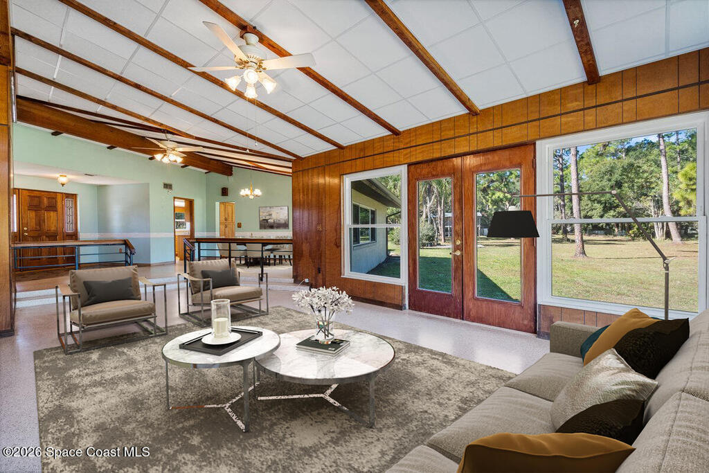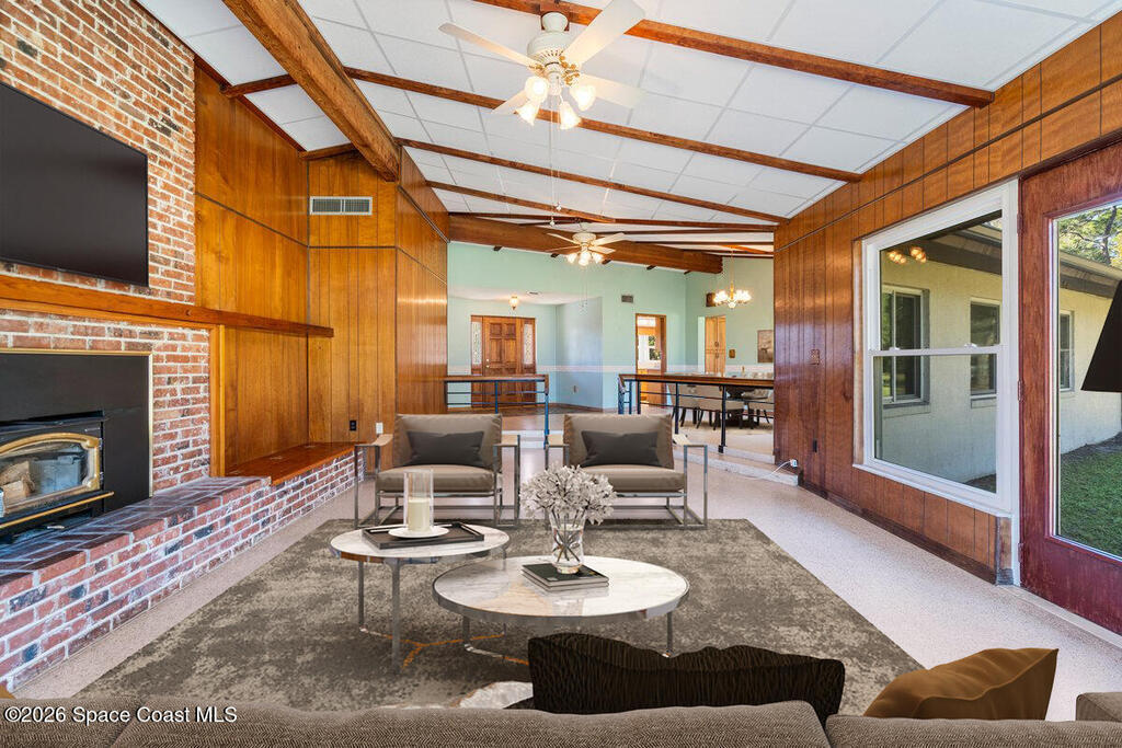 Set on over two private acres, this mid-century modern ranch-style estate is a rare blend of architectural authenticity, thoughtful updates, and future potential. With over 2,700 square feet of single-story living, the home offers expansive spaces designed to feel both grounded and open, exactly as mid-century design was meant to be. Inside, original details steal the show. Exposed wood beams stretch across vaulted ceilings, adding warmth and character, while original terrazzo floors run throughout, delivering durability, style, and a timeless nod to the home's roots. Anchoring the main living area is a striking brick fireplace that serves as both a focal point and a gathering place, equal parts cozy and architectural. Walls of windows bring the outdoors in, flooding the space with natural light and framing peaceful views of the surrounding acreage. The layout flows effortlessly into an updated kitchen where modern functionality meets classic design, making everyday living and enter-