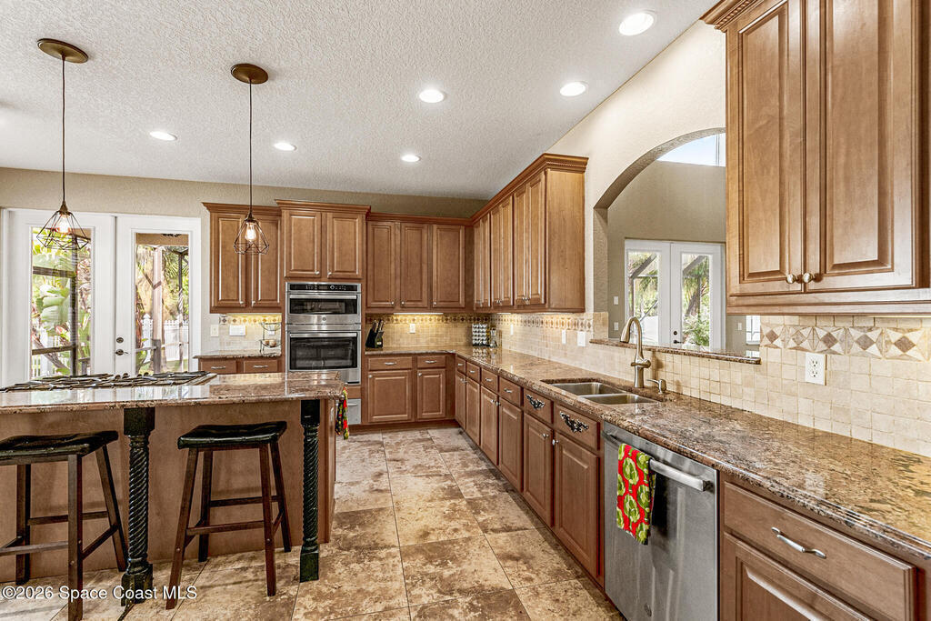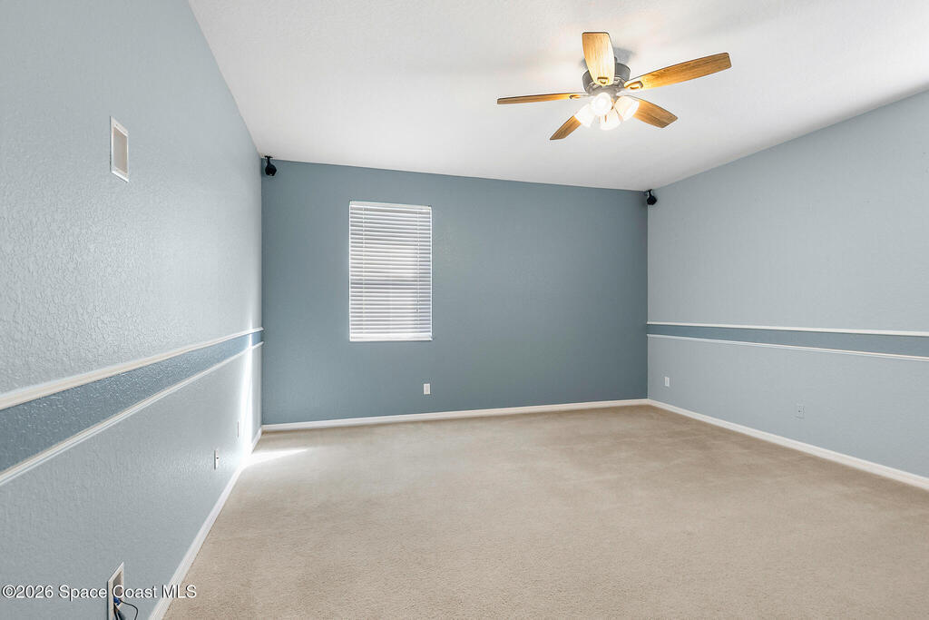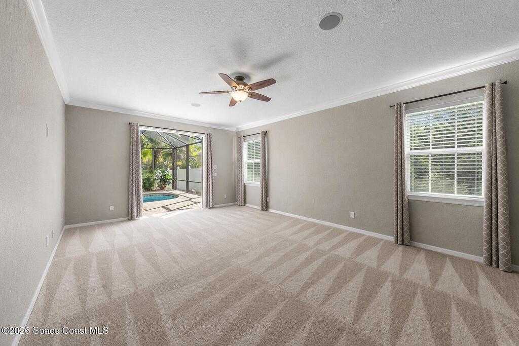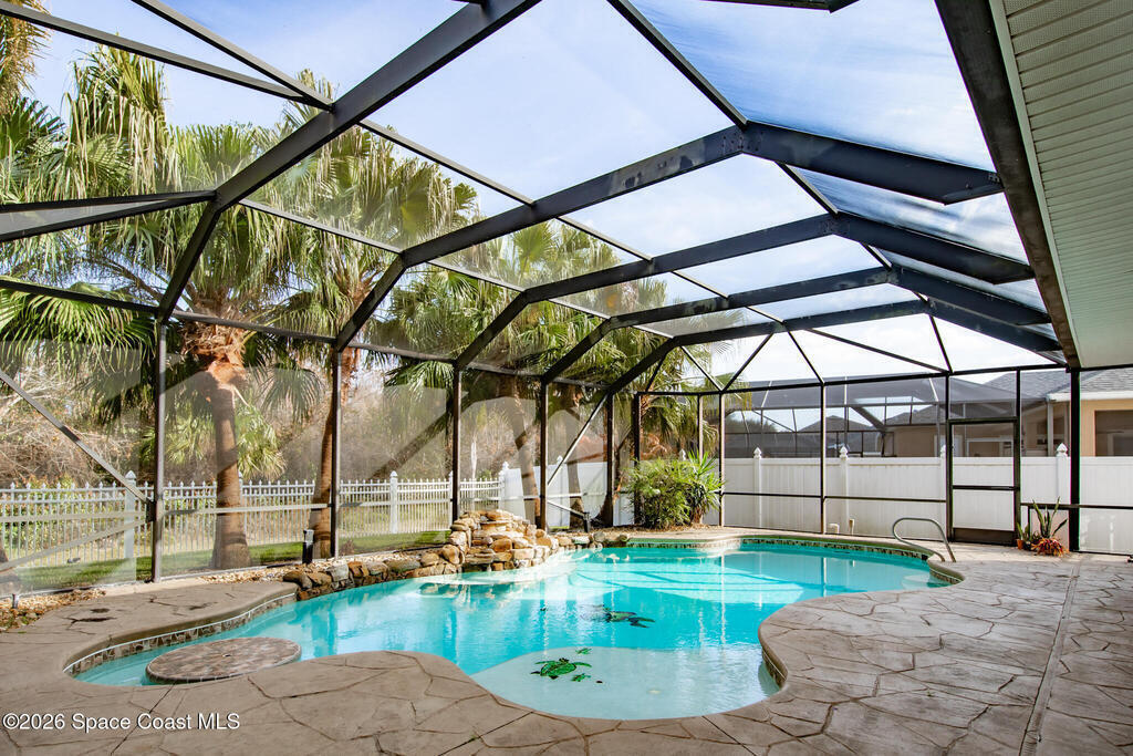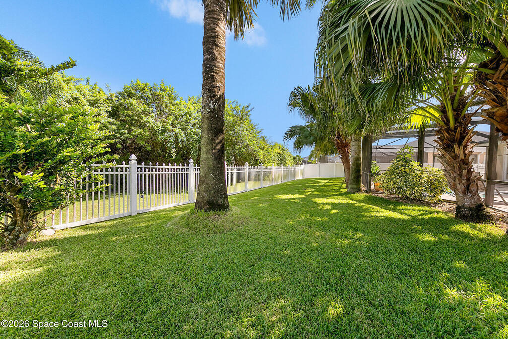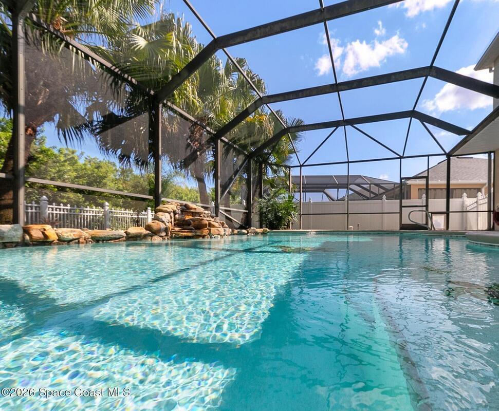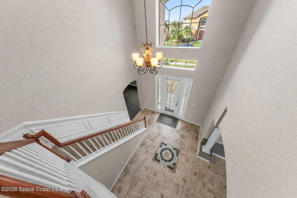 Exceptional space, comfort, and privacy define this stunning 5 bedroom, 3.5 bathroom pool home in the gated community of Chastain Manor. Offering just over 4,000 square feet of living space, the thoughtfully designed layout includes a private office and spacious primary suite on the main level, plus an upstairs loft, four secondary bedrooms, and three full baths. The updated kitchen features 42'' cabinets, granite countertops, and a gas cooktop. Vaulted 20-foot ceilings, crown molding, custom tile, and a gas fireplace add elegance throughout. Enjoy rocket launches all year round from your screened heated saltwater pool, large patio and fenced yard backing to protected wetlands. Oversized 3-car garage for added storage. Minutes to I-95, 5 minutes to The Indian River, 12 minutes to The Brevard Zoo, 15 minutes to the beach and Patrick's Space Force Base.