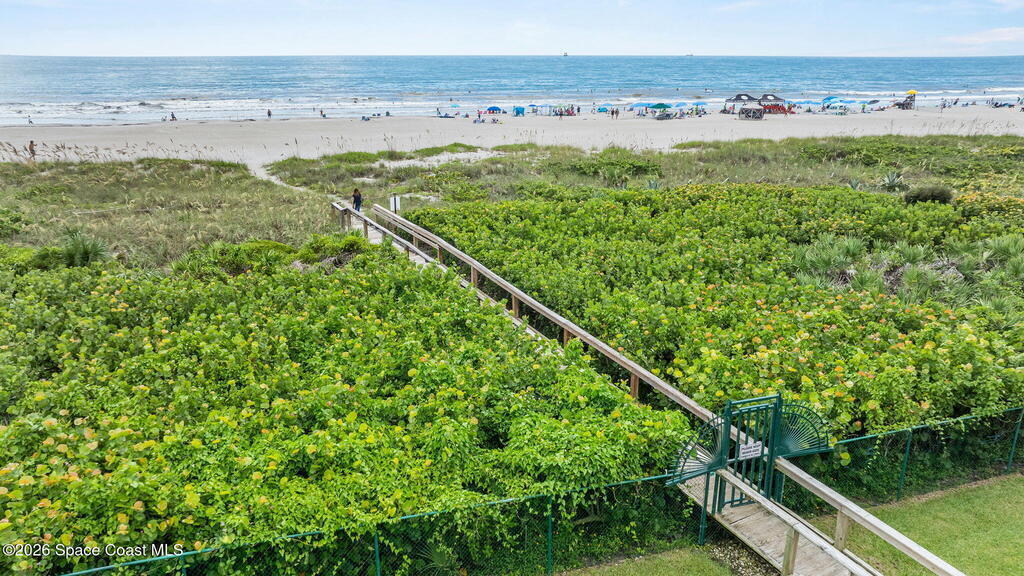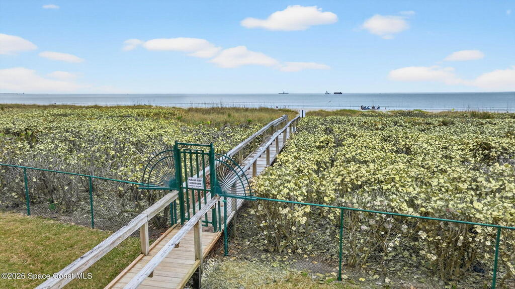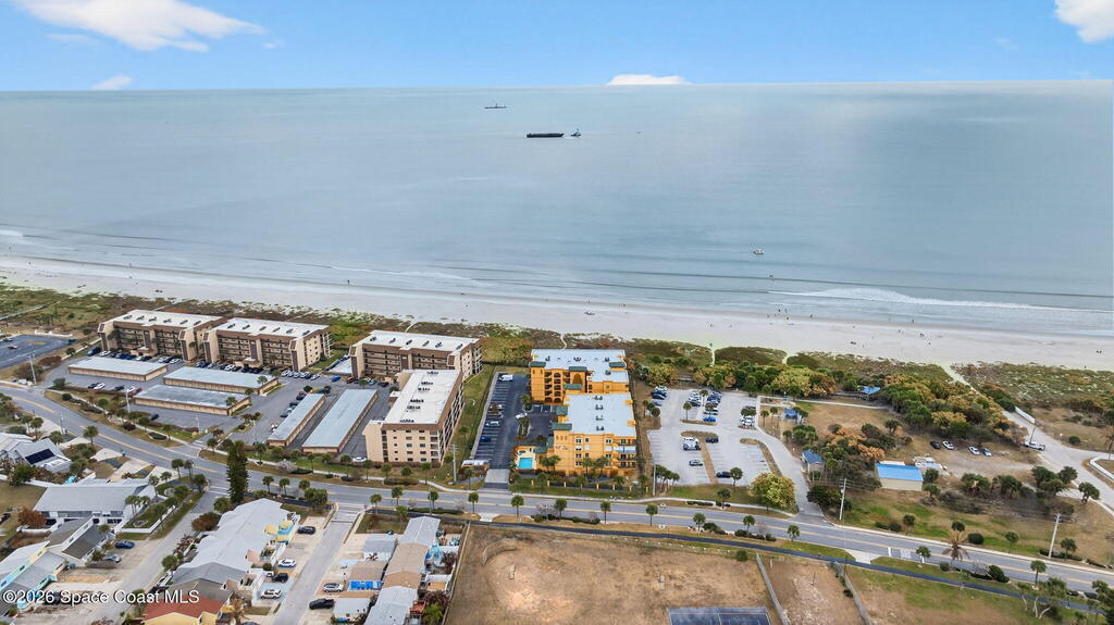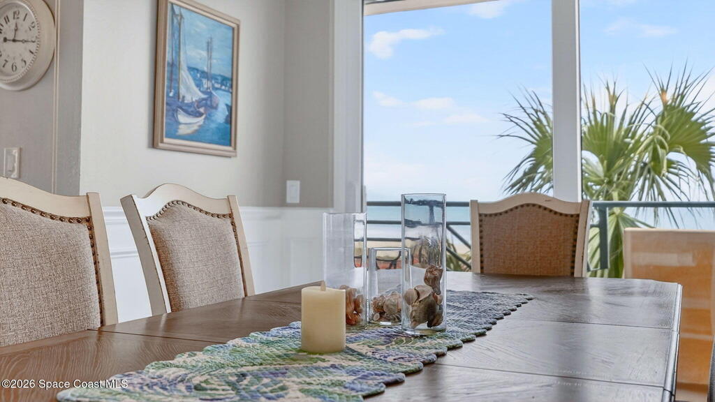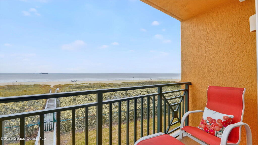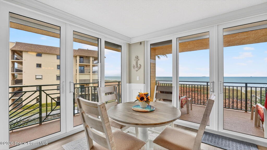 Gated stunning beachfront corner-unit condo fully remodeled and offering 4 bedrooms, 3 full baths, plus a private den. Enjoy sweeping ocean views from the spacious family room and dining area, both overlooking the beach. The luxurious primary suite features its own private balcony with gorgeous ocean views, a newly updated spa-style bath with double vanities, shaker cabinetry, quartz countertops,pedestal, soaking tub with shiplap accent wall, and large walk in closets. The updated kitchen offers shaker cabinets with soft-close hardware, quartz countertops, and a farmhouse sink. Guest baths are beautifully updated.Second primary with updated bathroom and private balcony. New Hurricane-rated sliding glass doors and new storm shutters provide peace of mind. Located in a gated community with heated pool, hot tub, fitness center with spa.New Luxury Vinyl thru out.Garage space and open parking. New roof.A/c 2022.Watch rocket launches from your balcony!Private beach boardwalk.