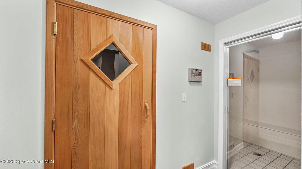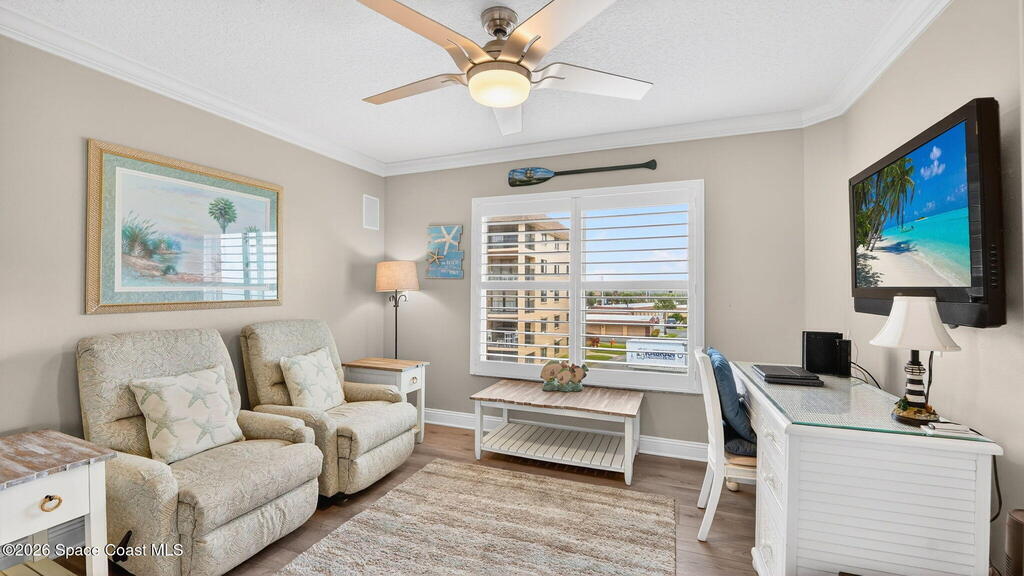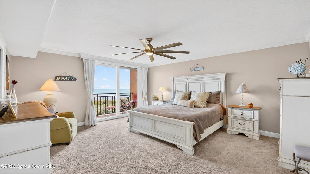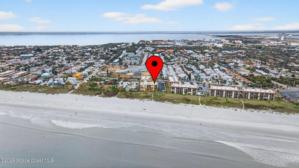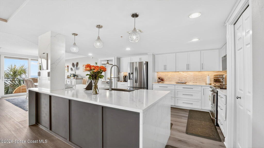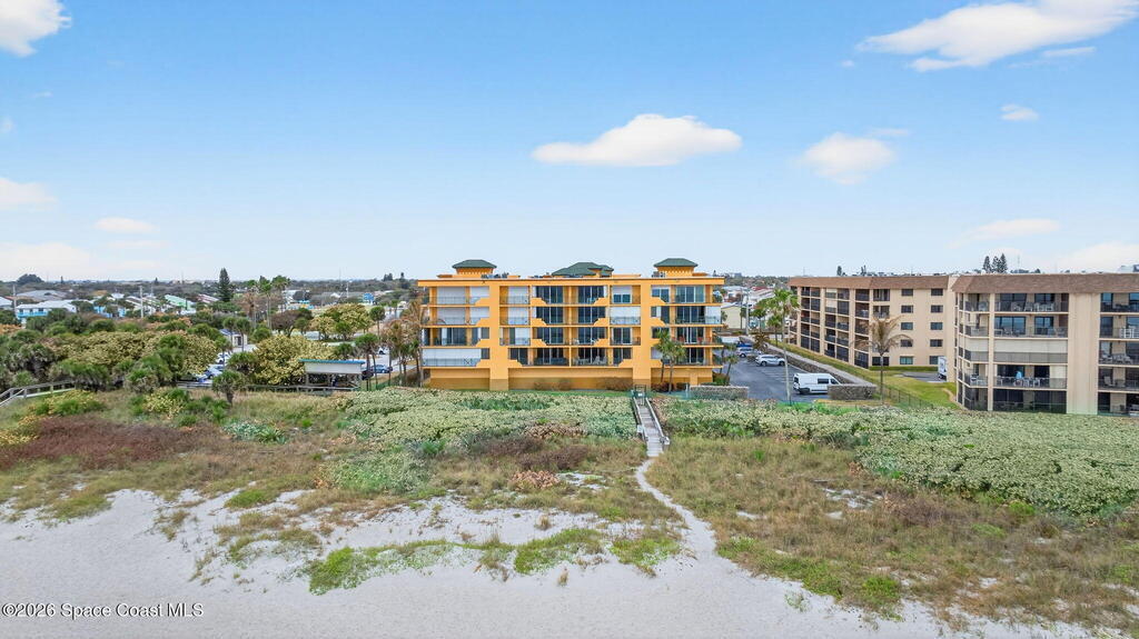 Gated stunning beachfront corner-unit condo fully remodeled and offering 4 bedrooms, 3 full baths, plus a private den. Enjoy sweeping ocean views from the spacious family room and dining area, both overlooking the beach. The luxurious primary suite features its own private balcony with gorgeous ocean views, a newly updated spa-style bath with double vanities, shaker cabinetry, quartz countertops,pedestal, soaking tub with shiplap accent wall, and large walk in closets. The updated kitchen offers shaker cabinets with soft-close hardware, quartz countertops, and a farmhouse sink. Guest baths are beautifully updated.Second primary with updated bathroom and private balcony. New Hurricane-rated sliding glass doors and new storm shutters provide peace of mind. Located in a gated community with heated pool, hot tub, fitness center with spa.New Luxury Vinyl thru out.Garage space and open parking. New roof.A/c 2022.Watch rocket launches from your balcony!Private beach boardwalk.