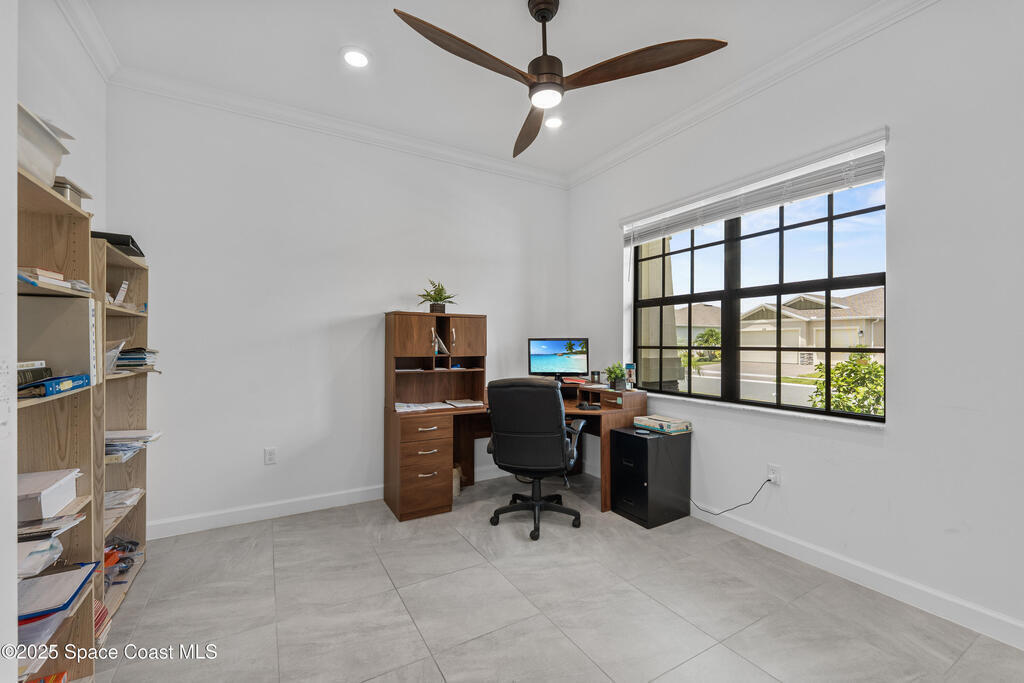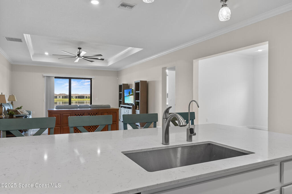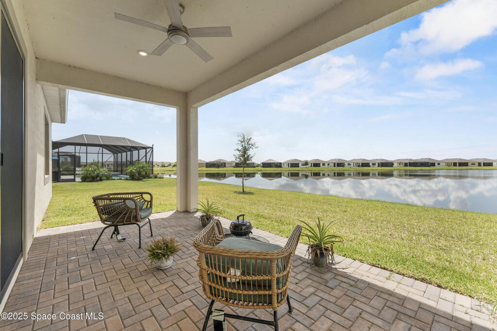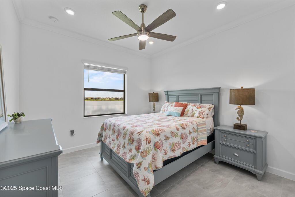 Rare TREVISO floor plan complete with many upgrades including IMPACT WINDOWS and wide waterfront lot with a south facing direction. You will love the views! 3 well separated bedrooms PLUS a generous sized office PLUS a 12 x 12 FLEX ROOM. ! Beautiful tile throughout/no carpet. High ceilings, upgraded kitchen backsplash, lighting, ceiling fans, crown moulding, blinds, and more. Primary bedroom , bath and closet are very spacious and on one side of the home while 2nd and 3rd bedrooms (one is en- suite) plus office /flex room are on the opposite side of the home. Utility room is off the kitchen and opens into very spacious 3 car garage. Come enjoy all that Bridgewater has to offer, from a world class pool to pickleball courts, bocce, billiards, movie theater, coffee lounge to gathering rooms to enjoy community activities with friends. Love the lifestyle; love your new home!