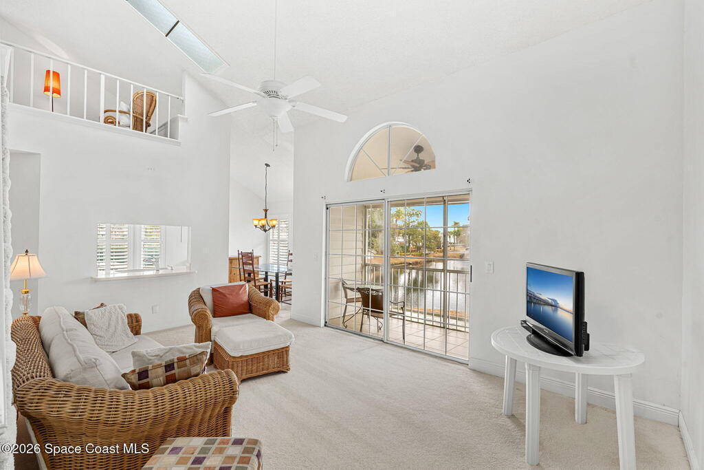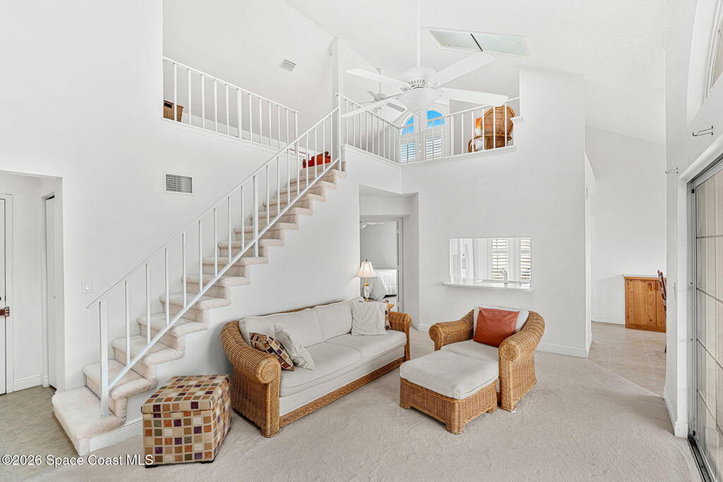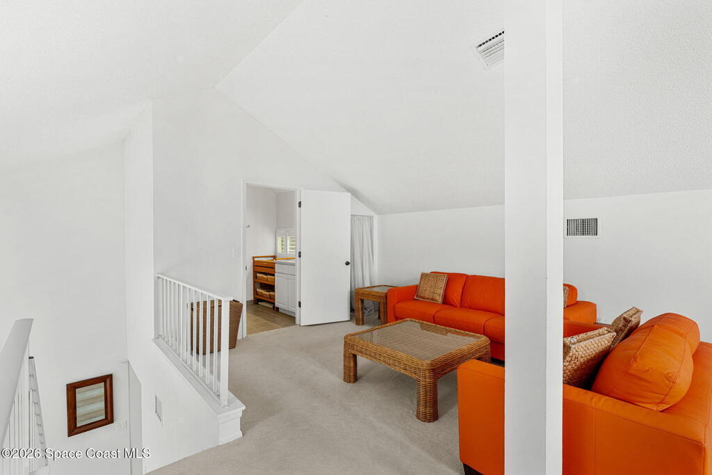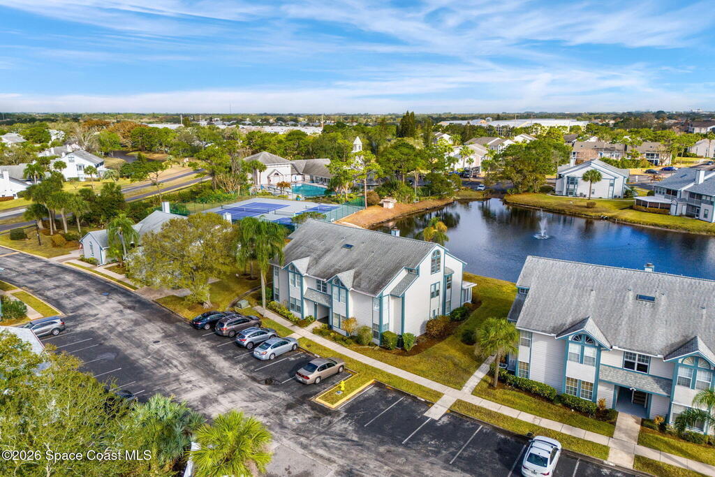 This second floor, two-story unit offers flexible living with main floor primary bedroom/bathroom and additional bedroom/bathroom, an upstairs loft and another full bath -- ideal for additional bedroom, a home office, or secondary living space. Enjoy peaceful pond views from your private balcony and the comfort of newer carpet throughout. The kitchen opens to the main living area for easy everyday living or entertaining. A 1-car garage adds convenience, and the washer and dryer convey (located in the porch storage room). HOA includes basic cable and internet as well as exterior maintenance with optional access to the community pool for an additional fee. A stair lift is already installed for added accessibility. Perfect for downsizers or investors seeking low-maintenance living in a centrally located Melbourne community near shopping, dining, and major roadways.