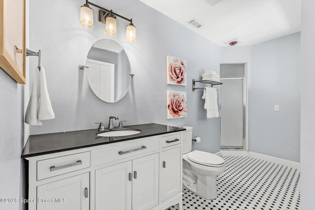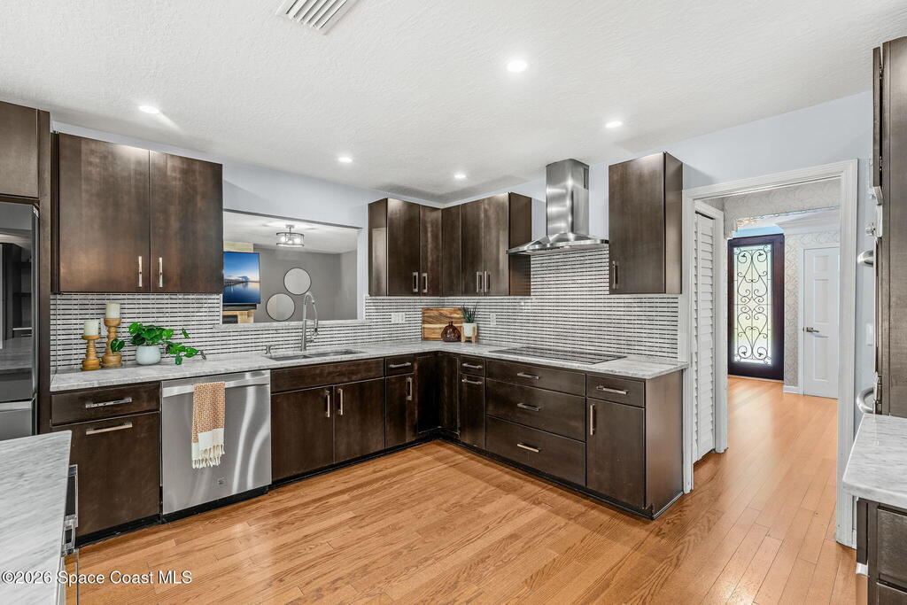 Located on a quiet cul-de-sac in Woodbridge at Suntree, this two-story brick French Provincial home sits directly adjacent to the 18th hole of Suntree Country Club. Offering 3,487 square feet, 5 bedrooms, and 5 full baths, the home blends timeless architecture with extensive 2022 updates throughout.Designed with family living and entertaining in mind, the home features hardwood floors, a wood-burning fireplace, and multiple gathering spaces that flow seamlessly to the expansive covered lanai and screened pool with gas-heated spa. The fully modernized kitchen showcases marble countertops, double wall ovens, an induction cooktop, butler's pantry, and an impressive entertainment extension complete with a 200-bottle wine refrigerator and keg fridge.Upstairs, the primary suite offers four custom closets and direct access to a private rooftop deck with panoramic views.