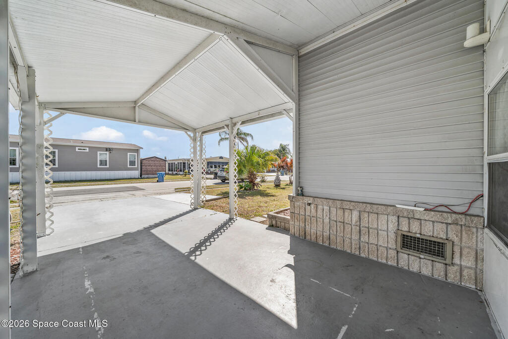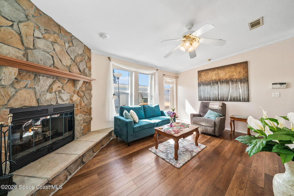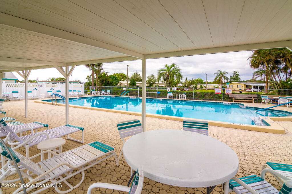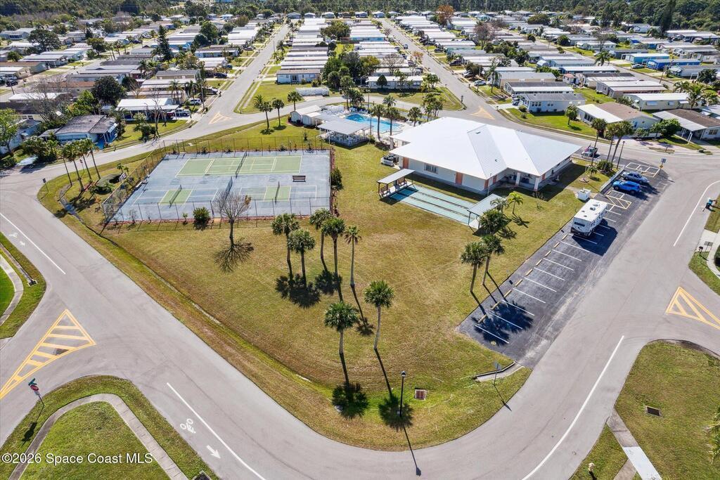 Palm Bay Colony is a 55+ community offering an active clubhouse, heated pool, pickleball, shuffleboard, tennis, and fitness center, and here, you don't just own the home, you own the land. This well-kept 2-bedroom, 2-bath home features vaulted ceilings, laminate flooring in the main living areas, and a stone wood-burning fireplace that anchors the space. The beautiful, updated kitchen offers solid wood cabinetry and opens comfortably to the dining and living areas. An in-home laundry closet is tucked into the second bathroom, and the washer & dryer stay. The primary suite includes a walk-in shower and generous counter space. Outside, enjoy a FL room, covered carport, storage shed, and a fully fenced backyard with mature trees and patio space - easy to maintain and enjoy Florida living. Conveniently located near shopping, dining, and the beaches. The $1,500 Palm Bay Colony membership has already been paid by the current owner and transfers to you, and the ongoing fee is just $45/month.