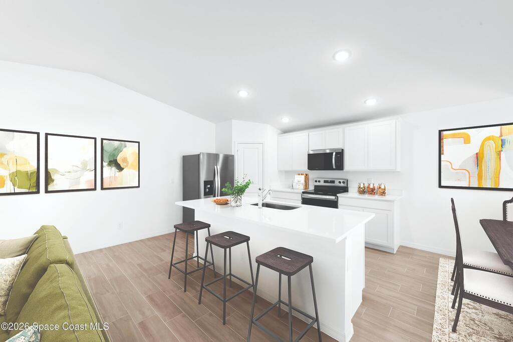 The Gasparilla offers the perfect blend of comfort & functionality with 1,810 sq ft of thoughtfully designed living space. This open-concept home features 4 bedrooms, 2 baths, and a spacious Great Room under a vaulted ceiling that seamlessly connects to the kitchen, dining area, and covered lanai -- ideal for entertaining or relaxing. The modern kitchen is beautifully appointed with quartz countertops, a complete stainless steel appliance package, and a large island that provides additional seating and prep space. Elegant plank tile flooring flows throughout the main living areas, adding both warmth and durability. The private Primary Suite offers a walk-in closet & a luxurious bath with double sink quartz vanity and a walk-in shower. Three additional bedrooms provide flexibility for family, guests, or a home office. A dedicated laundry room and a spacious 2-car garage complete this home. Pictures, renderings, & virtual tour are of similar home & are used for display purposes only.