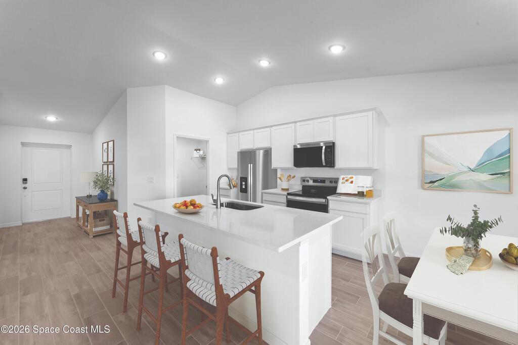 NEW CONSTRUCTION WITH WARRANTY! City water homesite! The Cayo Costa combines open-concept living with a split-bedroom layout, offering 3 bedrooms plus a den & 2 bathrooms. Designed for entertaining, the main living area showcases a vaulted ceiling that connects the kitchen, dining area, & Great Room. A large freestanding island provides the ideal centerpiece for both meals & social gatherings, while sliding glass doors extend the living space to a covered lanai for indoor-outdoor living. The Primary Suite features 2 spacious walk-in closets and an en-suite bathroom. On the other side of the home, 2 comfortable guest bedrooms share a full bath. A den with French doors offers the perfect space for a home office. Quartz countertops, designer cabinetry, tainless steel kitchen appliance package, upgraded plank tile flooring in main living areas, hurricane-impact windows and doors & more! Pictures, renderings, & virtual tour are of similar home & are used for display purposes only