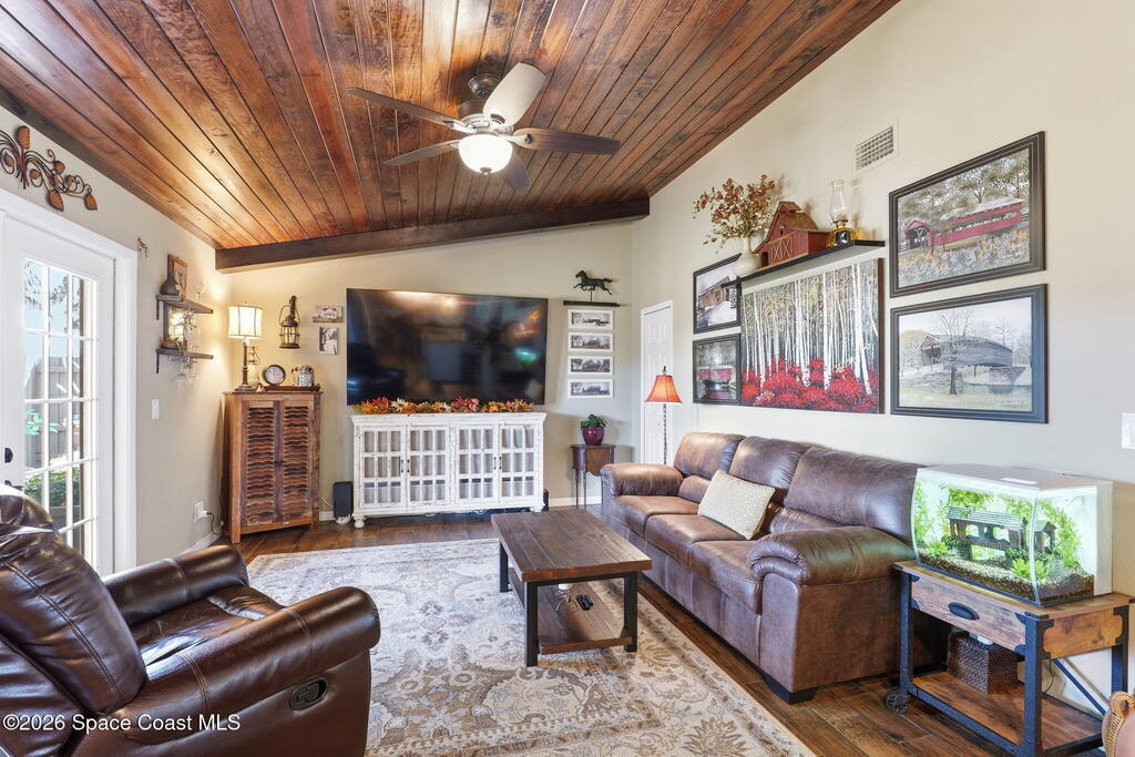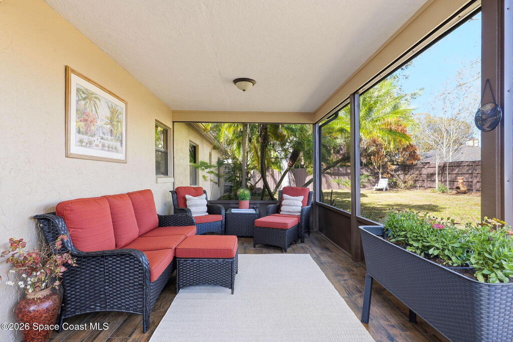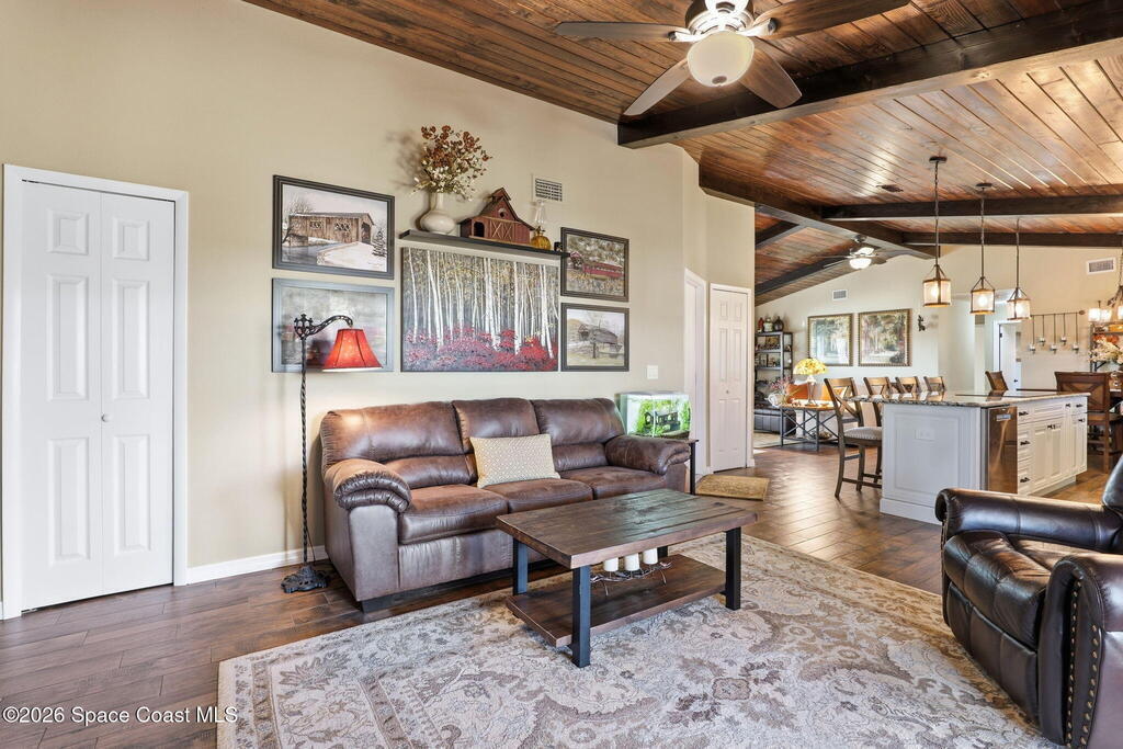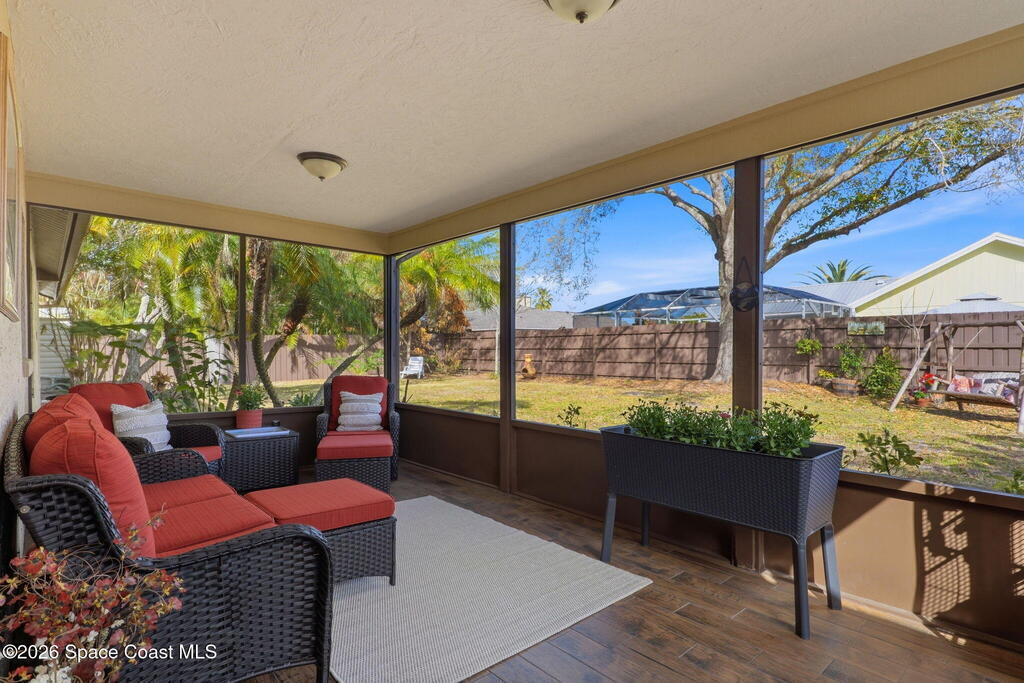 This home exudes thoughtful style and design from the very moment you arrive. Vaulted tongue-and-groove ceilings with exposed beams create warmth, complemented by wood-look tile flowing seamlessly throughout the entire home. The impressive kitchen features 15-inch deep soft-close cabinetry, sleek induction cooktop, GE Profile appliances, and Waterdrop reverse osmosis filtration system that even filters water for ice cubes. Impact windows provide peace of mind, along with a 2024 roof, 2018 gas water heater, and a variable-speed AC system (2014) which is known for its longer-than-average lifespan. Screened porch and private fully fenced backyard offers premium cedar fencing (resistant to rot and insects), storage sheds, and double-gate yard access with potential to store a small trailer or boat. Ideally located near Publix, the Eau Gallie Arts District, and I-95. Schedule a showing today!