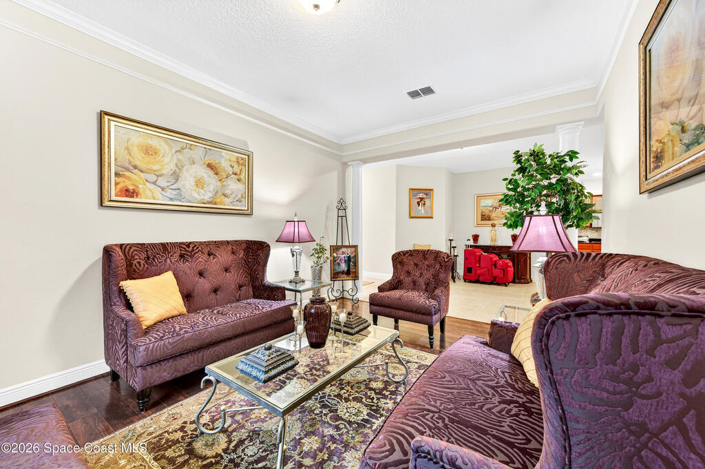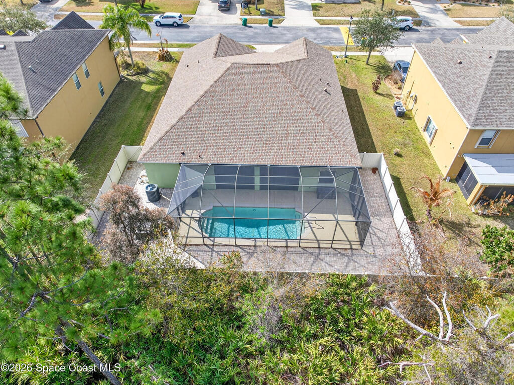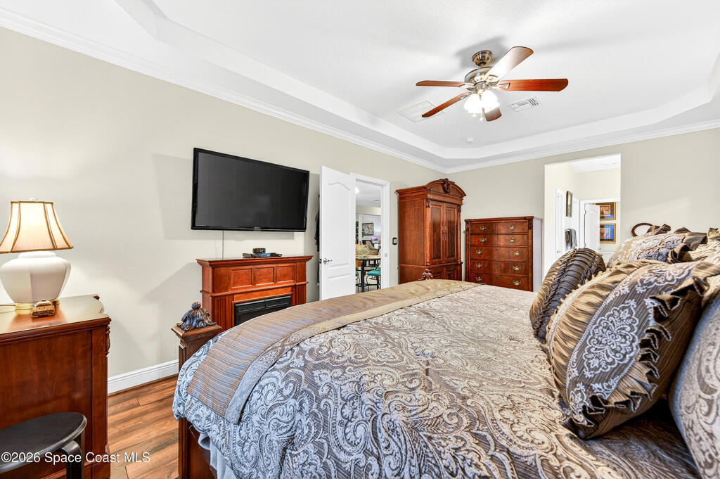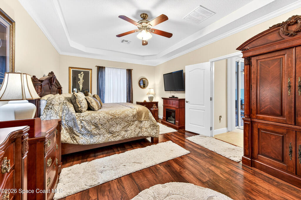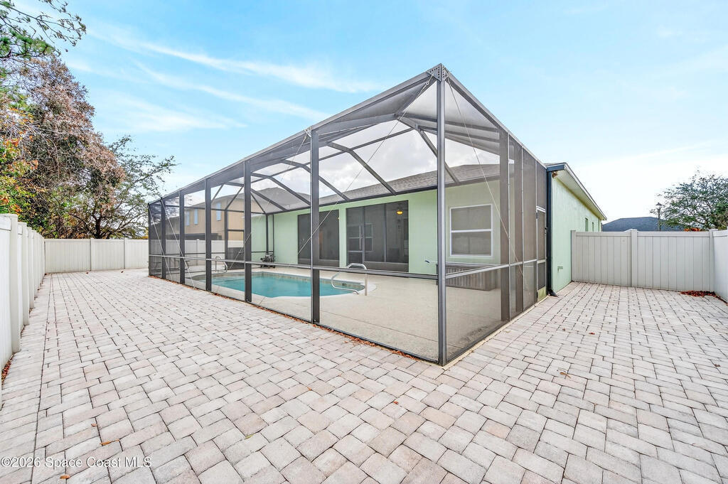 POOL HOME fenced on .21 acres is 1 of 4 unique floorplans labeled the ''PRESIDENTIAL SERIES'' within this gated community. Showcases decorative columns, tray ceiling in Master, crown molding, 5'25'' baseboards, massive laundry rm w/sink, window & large countertop, gourmet kitchen w/double ovens & 5 burner 36'' cooktop. PERFECT Mother/Father-in-law Suite & Bath w/walk in shower w/seat. Elegant laminate, 18x18 tile, 2023 roof & 2020 Trane A/C. Oversized & private owner's suite offers 2 HUGE walk in closets, double vanities, relaxing garden tub, window for natural light & tiled shower w/glass enclosure. Enjoy entertaining on your 10x23 covered/trussed porch, a 2024 screen enclosure covering your crystal clear pool. Hurricane shutters & 2nd refrig. in garage which has soaring 9'4'' ceilings just like the inside of home - perfect for hanging large storage racks. Close to SUPERIOR SCHOOLS, beaches, major employers, shopping, dining, hospitals, I-95, Melb. Airport & less than 1 hr to Orlando.