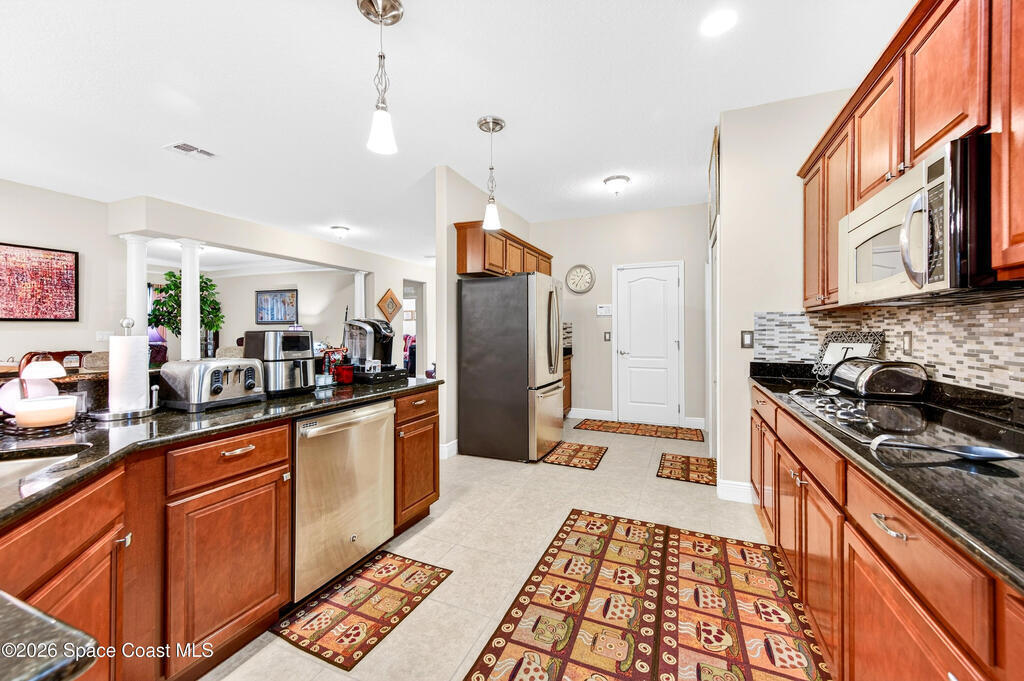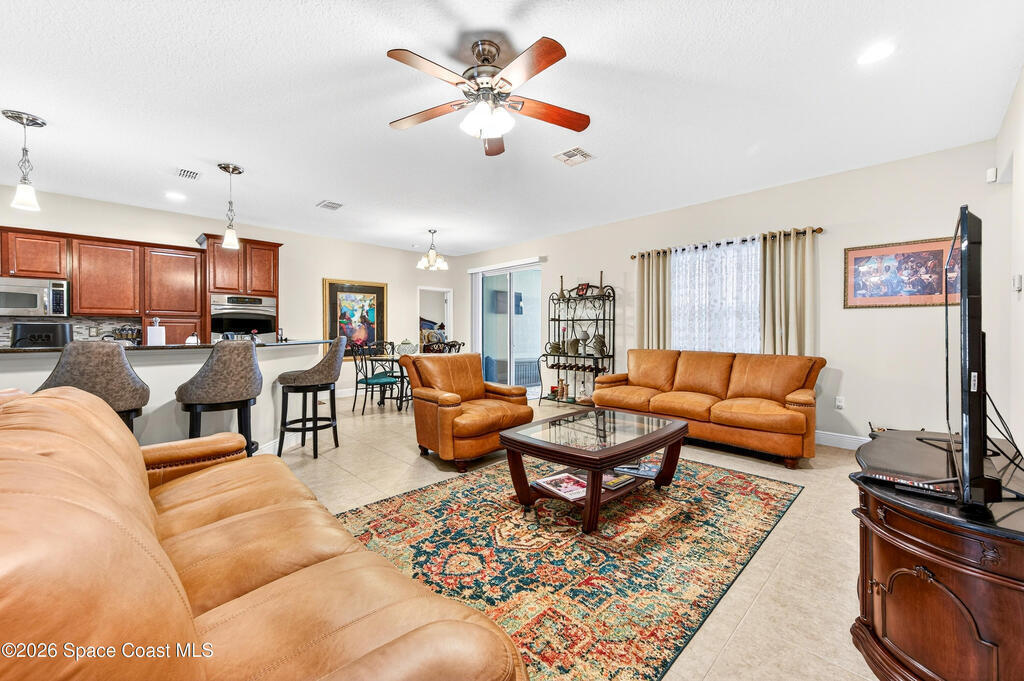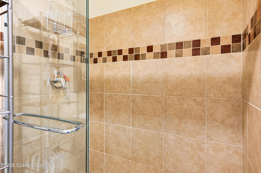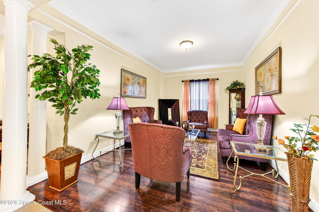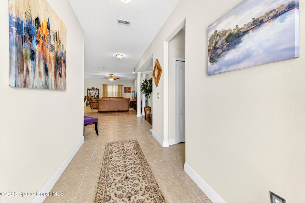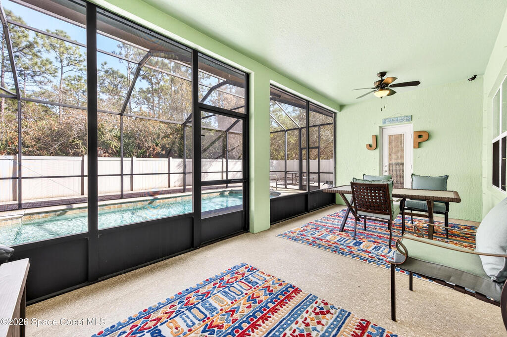 POOL HOME fenced on .21 acres is 1 of 4 unique floorplans labeled the ''PRESIDENTIAL SERIES'' within this gated community. Showcases decorative columns, tray ceiling in Master, crown molding, 5'25'' baseboards, massive laundry rm w/sink, window & large countertop, gourmet kitchen w/double ovens & 5 burner 36'' cooktop. PERFECT Mother/Father-in-law Suite & Bath w/walk in shower w/seat. Elegant laminate, 18x18 tile, 2023 roof & 2020 Trane A/C. Oversized & private owner's suite offers 2 HUGE walk in closets, double vanities, relaxing garden tub, window for natural light & tiled shower w/glass enclosure. Enjoy entertaining on your 10x23 covered/trussed porch, a 2024 screen enclosure covering your crystal clear pool. Hurricane shutters & 2nd refrig. in garage which has soaring 9'4'' ceilings just like the inside of home - perfect for hanging large storage racks. Close to SUPERIOR SCHOOLS, beaches, major employers, shopping, dining, hospitals, I-95, Melb. Airport & less than 1 hr to Orlando.