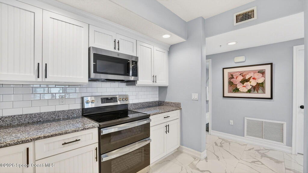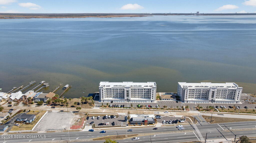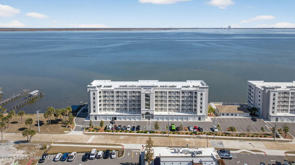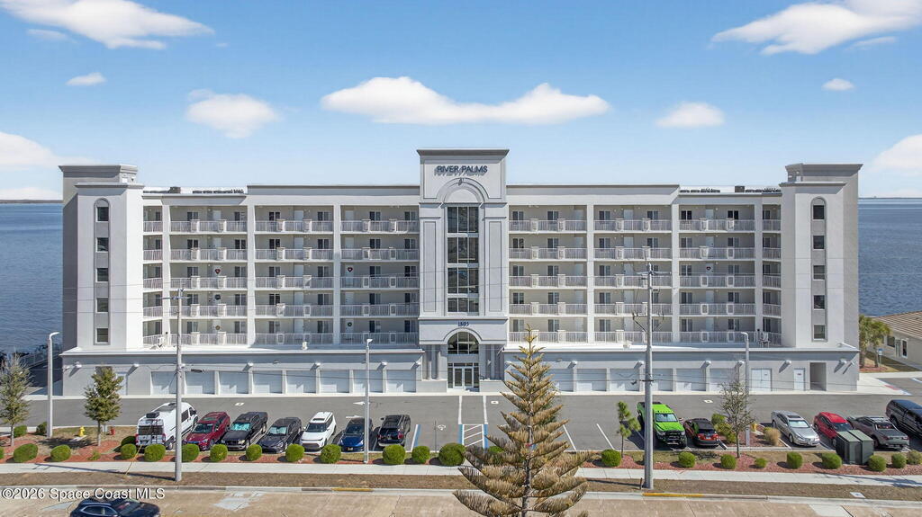 Built in 2023 & offering the 2nd Largest Floor Plan in River Palms, this Waterfront Condo delivers iconic Space Coast Views. Enjoy Impact Windows & a Private Balcony overlooking the Indian River & Kennedy Space Center for front row seats to Rocket Launches from the Living Room or the Primary. Inside, oversized Porcelain Tile runs throughout, paired w/ Granite Counters in the Kitchen & Baths. The Kitchen shines w/ SS Appliances, an Upgraded Double Oven, Farmhouse Sink, & Classic Subway Tile. A dedicated Laundry Room includes a Smart Front Load Washer/Dryer + Pedestals & Utility Sink. The Living & Dining areas are enhanced w/ Crown Molding. The Primary Suite features a Walk-in Closet & En Suite w/ Dual Sinks. Spot Manatees, Dolphins & Stingrays daily! Resort Style Amenities include a Waterfront Heated Pool, Clubhouse, Fitness Center, & Garage Parking. Maintenance Fee includes Water, Sewer, Trash, Internet & Cable. Minutes to Beaches, Dining, Shopping & SR 528.