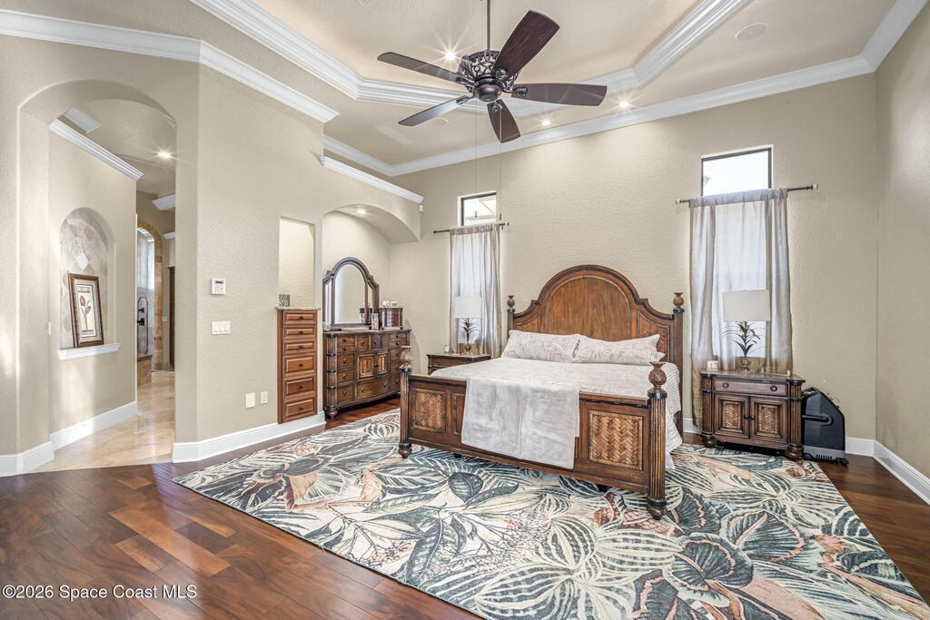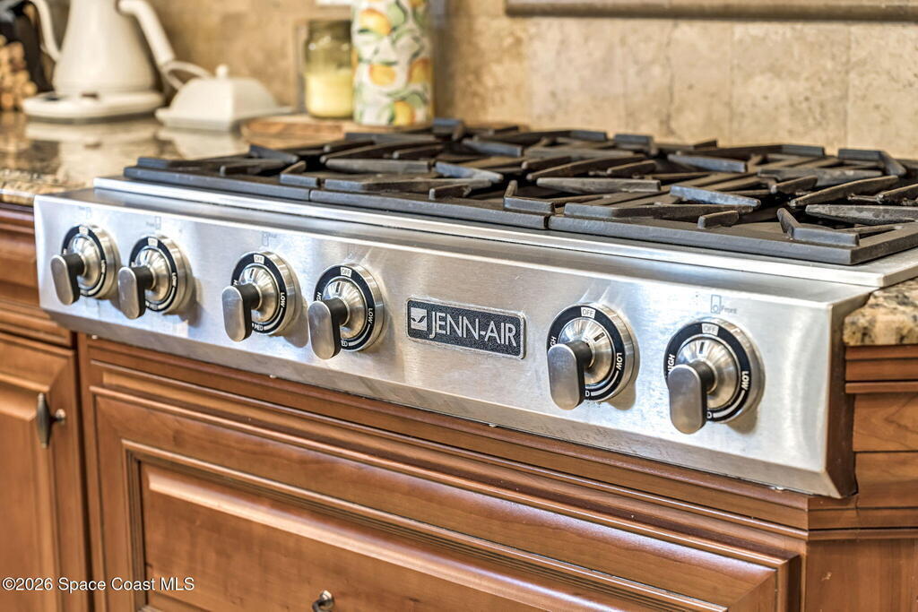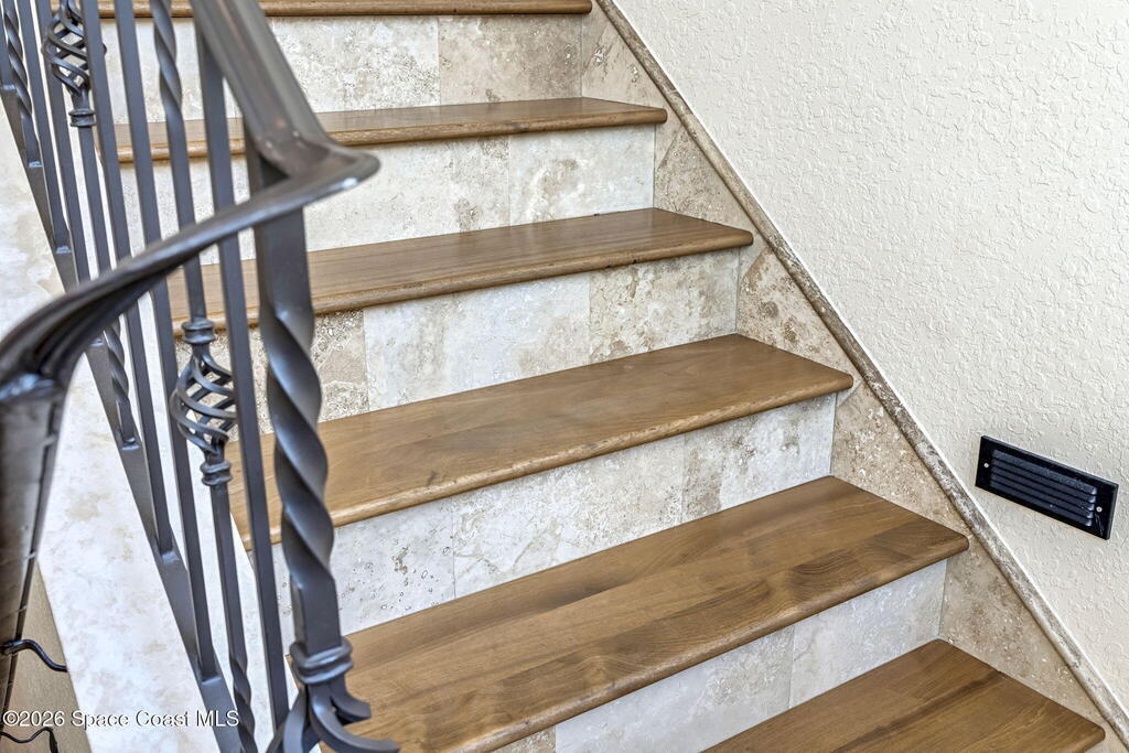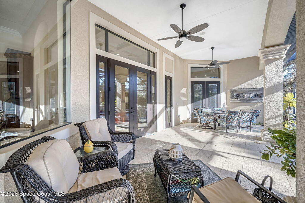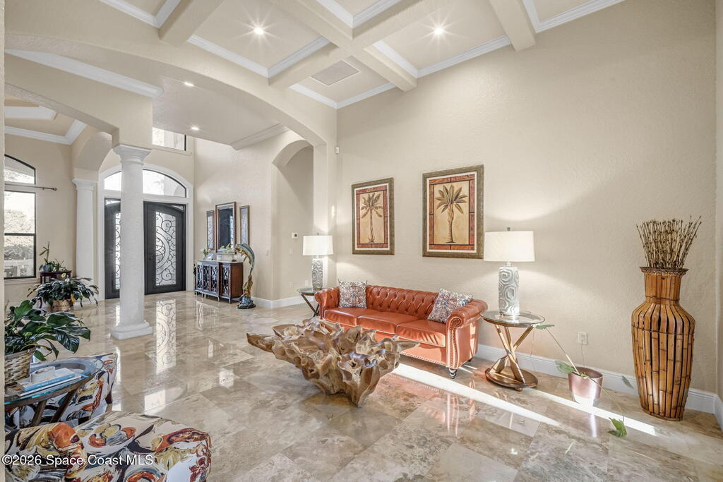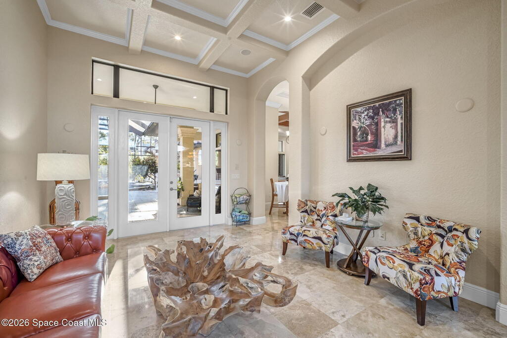 Custom-designed luxury pool home featuring a saltwater pool and spa with waterfall, fire bowls, and color-changing LED lighting. Equipped with PGT impact-rated windows, soaring tray and coffered ceilings, summer kitchen, and energy-efficient spray foam insulation. Expansive 90-degree pocket sliders create a seamless indoor-outdoor living space, ideal for entertaining. Spacious family room with fireplace. The chef's kitchen offers a large center island, granite counters, solid wood cabinetry, premium appliances, and a butler's pantry. Travertine and Brazilian cherry floors run throughout. Four private bedroom suites, each with its own bath. First-floor primary suite includes an elegant bath with dual vanities. Upstairs features a theater/entertainment room with kitchenette. Enjoy private access to a 200' dock across the street. Exceptional curb appeal and meticulous craftsmanship throughout. Located in the gated Hidden Creek community on the Space Coast, just steps from the Indian River