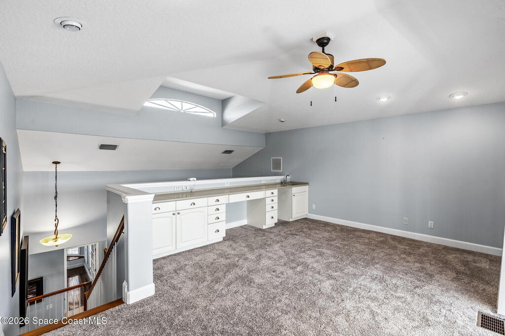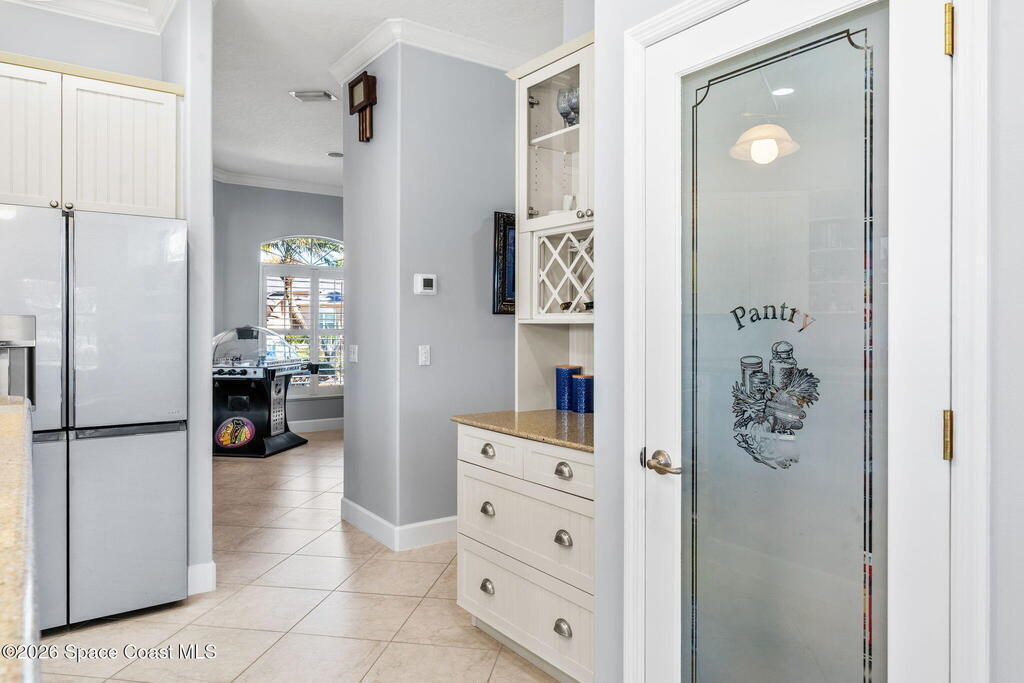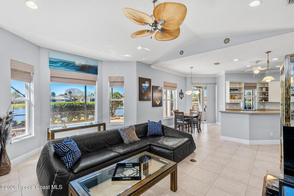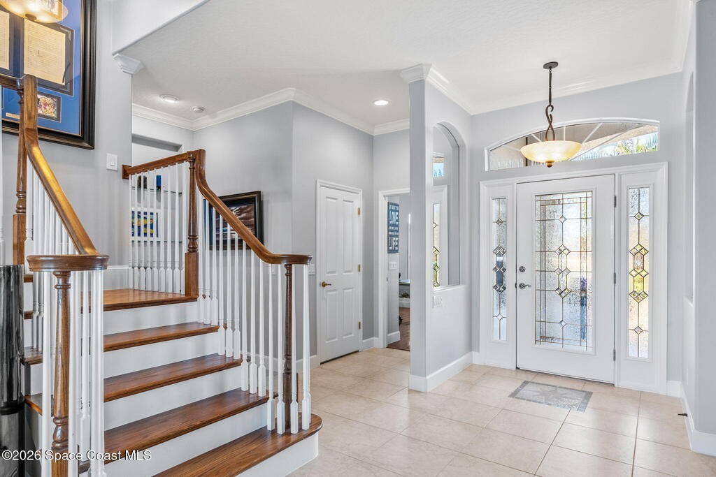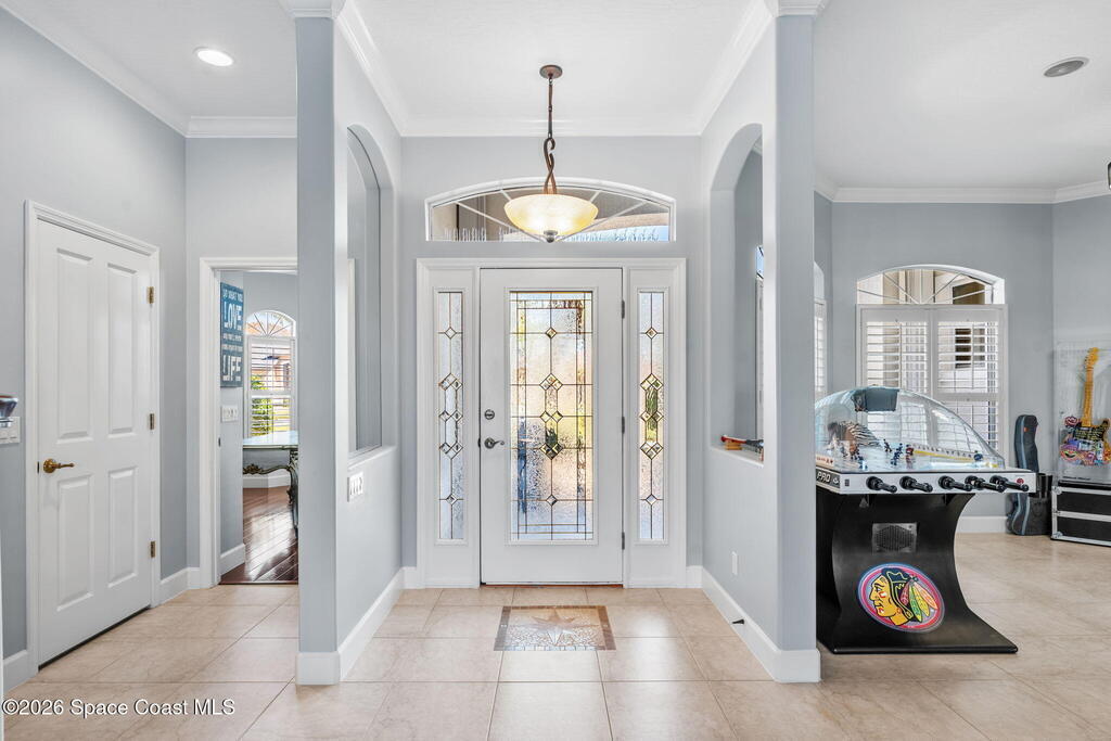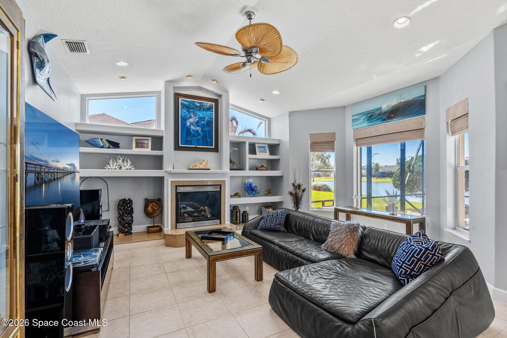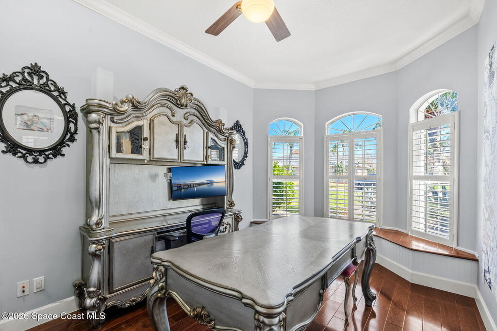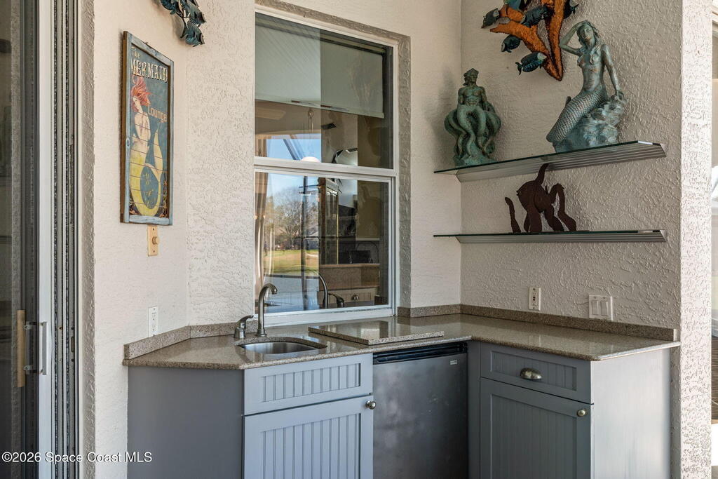 WELCOME to this STUNNING Merritt Island Golf Course Residence! A custom-built home that encompasses the best of impressive upgrades & builder touches. Tour this elegant 3 BED 2.5 BATH PLUS a private Office home that is beautifully appointed with soaring ceilings, a Chef's Kitchen, grand primary bedroom with 2 walk in closets with one transformed to a safe room. The spacious floor-plan also allows a separate upstairs OFFICE LOFT, complete with MILLION DOLLAR VIEWS from the covered balcony, perfect for the family that may be working remotely from home! The three car garage boosts oversized garage doors and a split entrance. Bask in the Florida sunshine as you swim laps in the INFINITY POOL, complete with fountains & a stone waterfall. After enjoying dinner at the summer kitchen, end the evening by relaxing by the cozy fire. Perfect proximity to NASA, the Space Coast Beaches & Orlando. This gorgeous home is not to be missed!