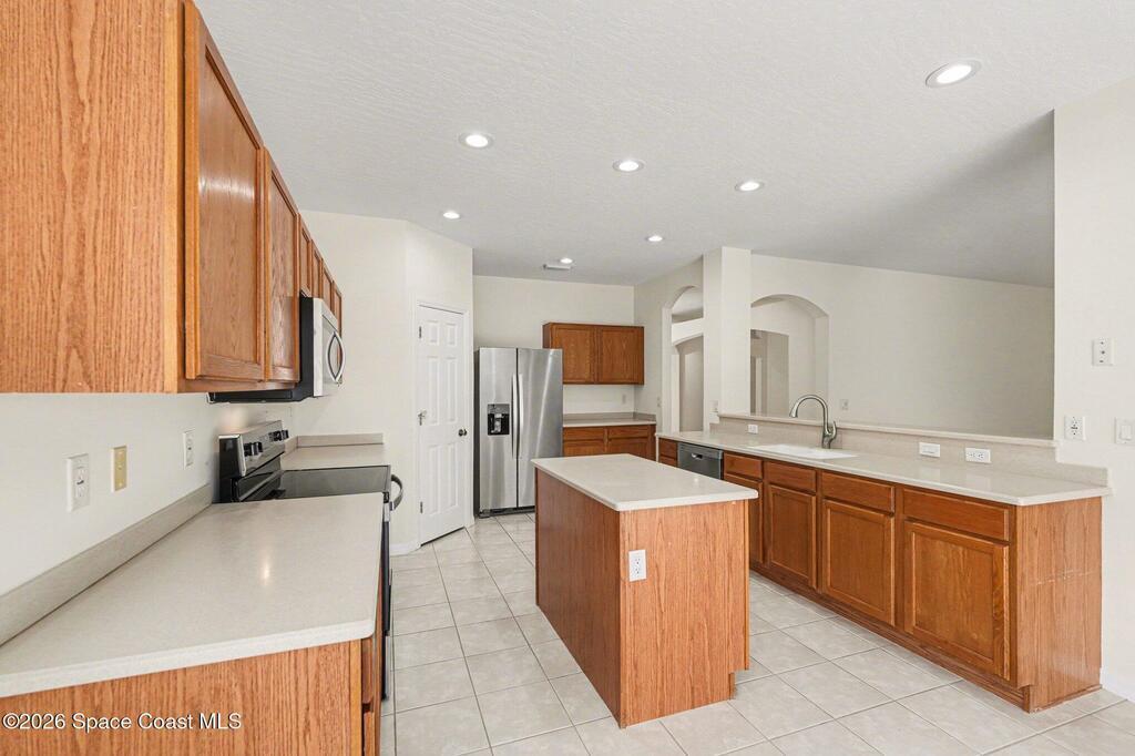 Beautifully maintained home with low annual HOA fees and numerous recent updates! Freshly painted inside and out -- including garage walls and floor -- this move-in ready property features new LVP flooring in the formal dining room, ceiling fans in every room, and a convenient inside laundry room. The open family room flows seamlessly from the kitchen, showcasing stainless steel appliances, Corian countertops, oak cabinetry with an island, abundant storage, recessed lighting, and a walk-in pantry. The spacious owner's suite offers dual sinks, a walk-in closet, glass shower, and relaxing Roman tub. Step outside to a large screened and covered lanai overlooking a tranquil neighborhood pond with fresh mulch and beautiful Oak tree. Major systems -- roof, HVAC, and water heater -- are all newer than fall of 2024. This home is located in Sandhill Trace in desirable Grand Haven off the Pineda Extension and perfect for I-95 travel, the new Costco, grocery markets, and other daily conveniences.