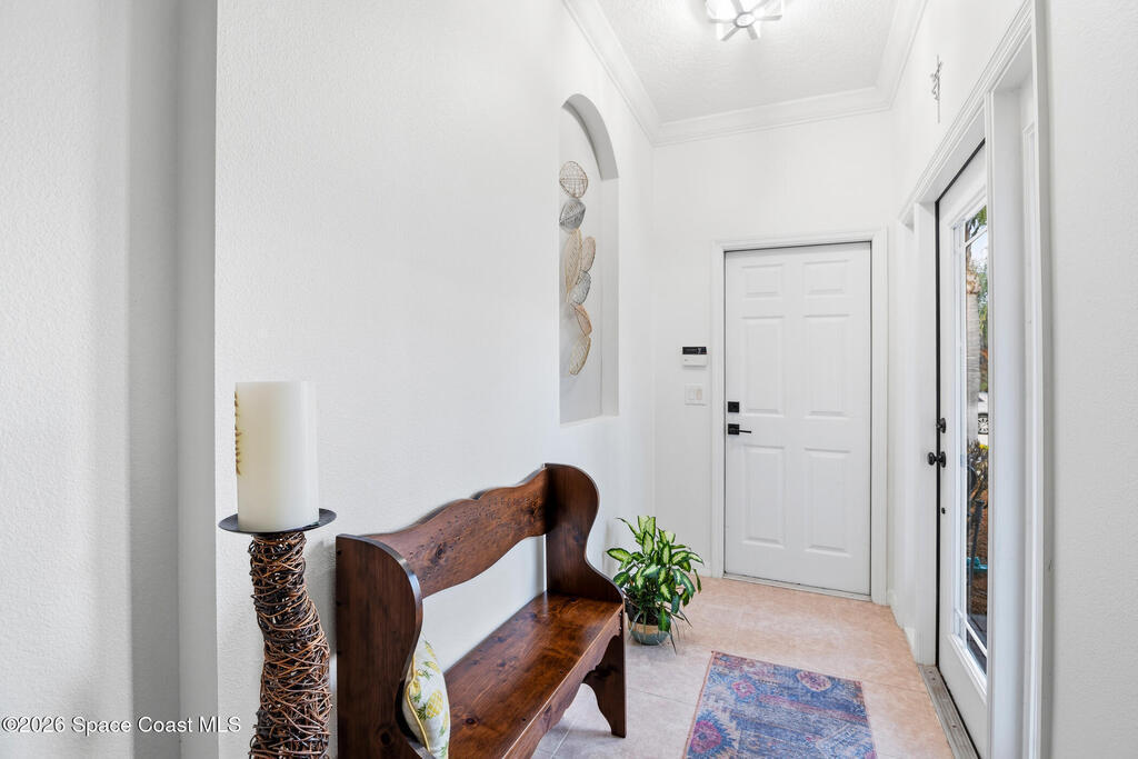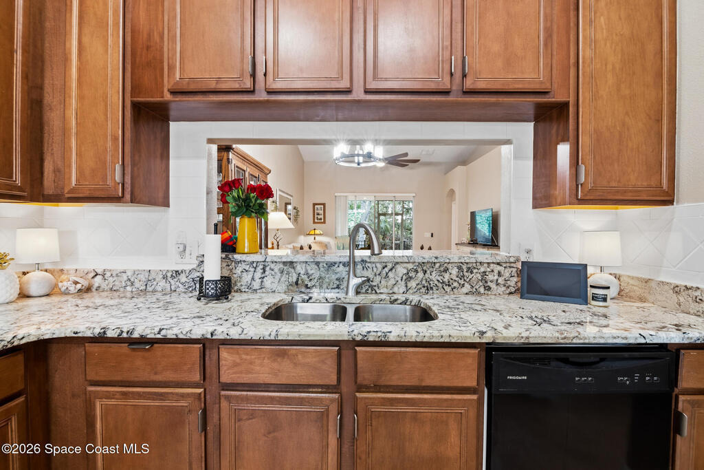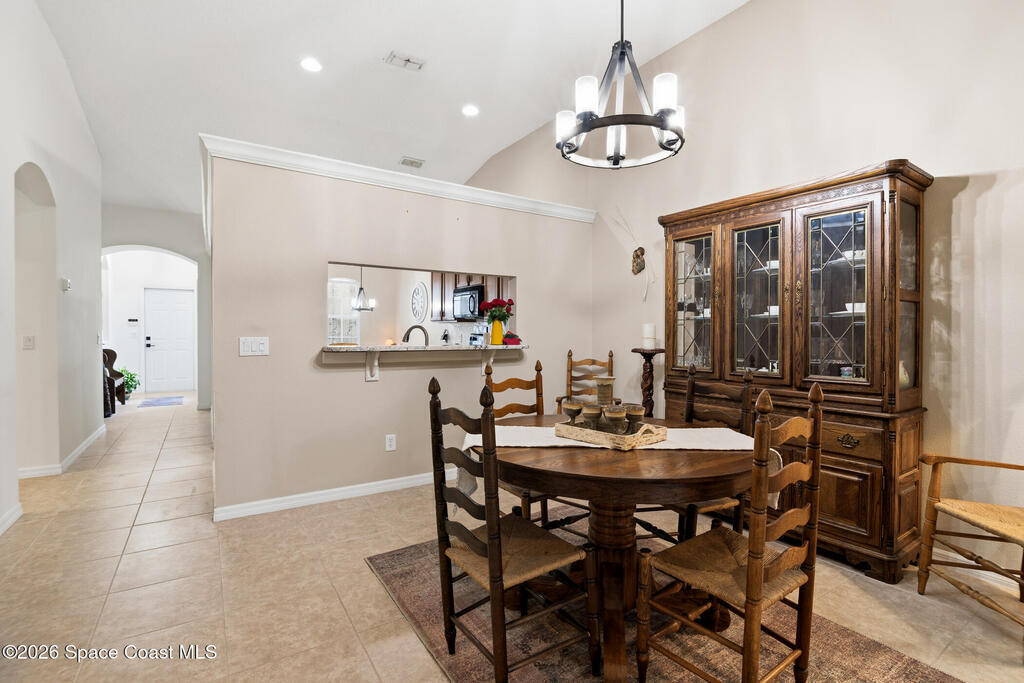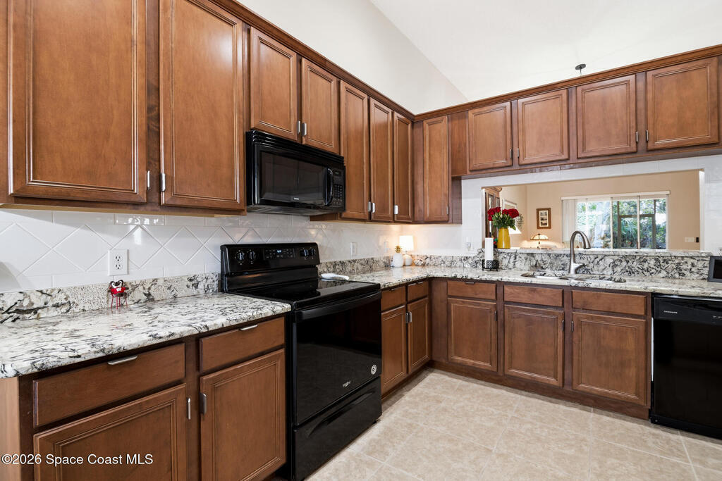 Nestled within the desirable gated community of Capron Ridge, this meticulously maintained and tastefully updated villa delivers comfort, style, and a true sense of retreat. A pavered driveway and entry, framed by tidy planting beds and lush tropical landscaping, create standout curb appeal from the moment you arrive.Inside, fresh interior paint, neutral colors, and large-scale tile flooring throughout the living areas and bathrooms, set a clean, cohesive tone. The truly open floor plan is enhanced by high, soaring ceilings that make the home feel exceptionally airy and bright. A lovely glass front door welcomes you into a space where every detail feels intentional.The kitchen is a highlight, offering gorgeous solid wood cabinetry, updated high-end granite countertops, and a sunny bay-window breakfast nook. Overlooking both the dining area and great room, it's designed for effortless everyday living and entertaining. Modern ceiling fans and lighting add a contemporary touch through
