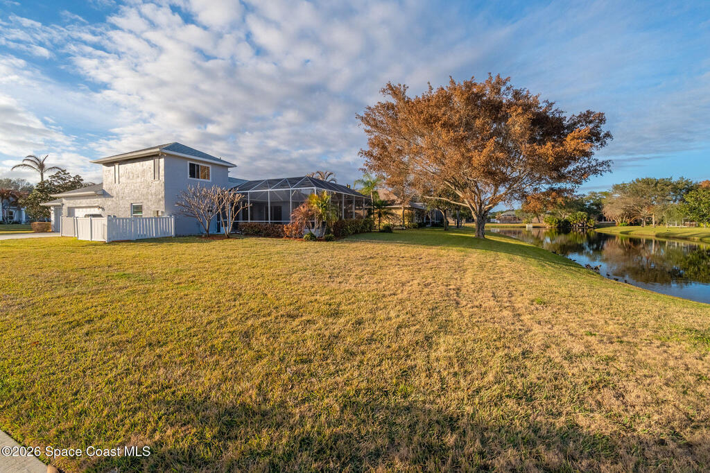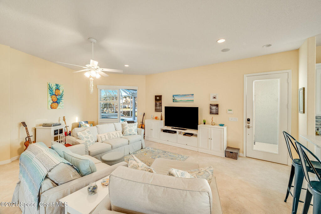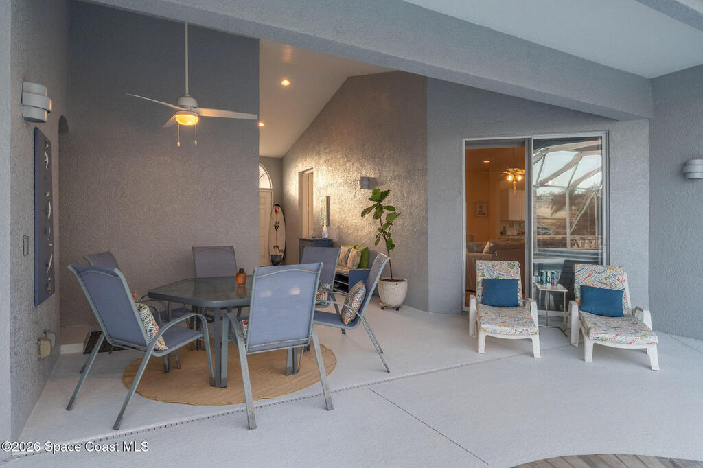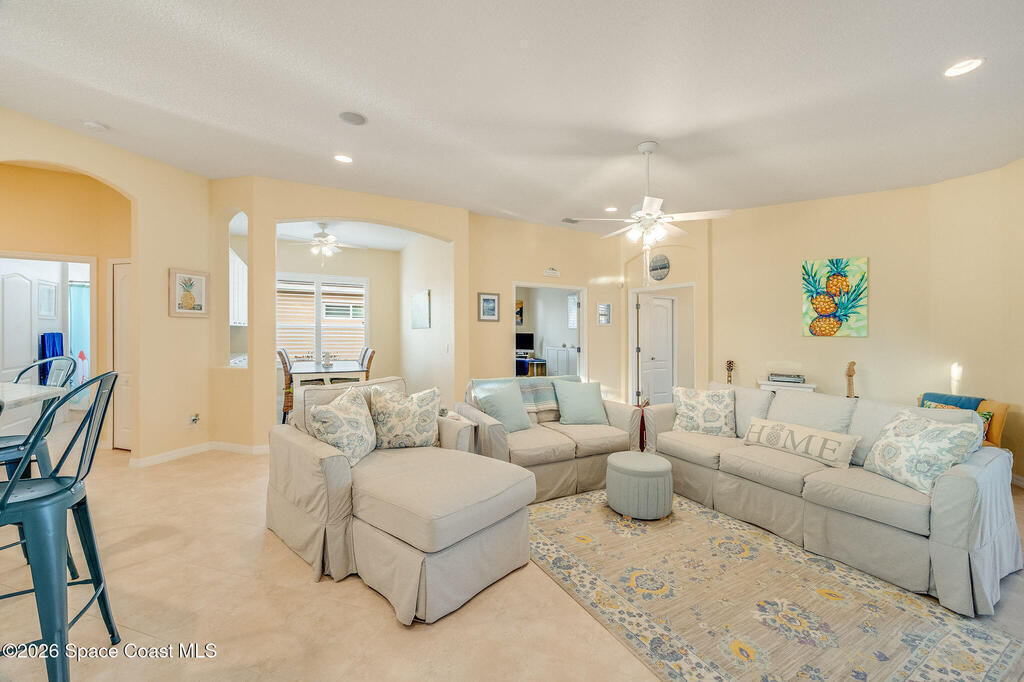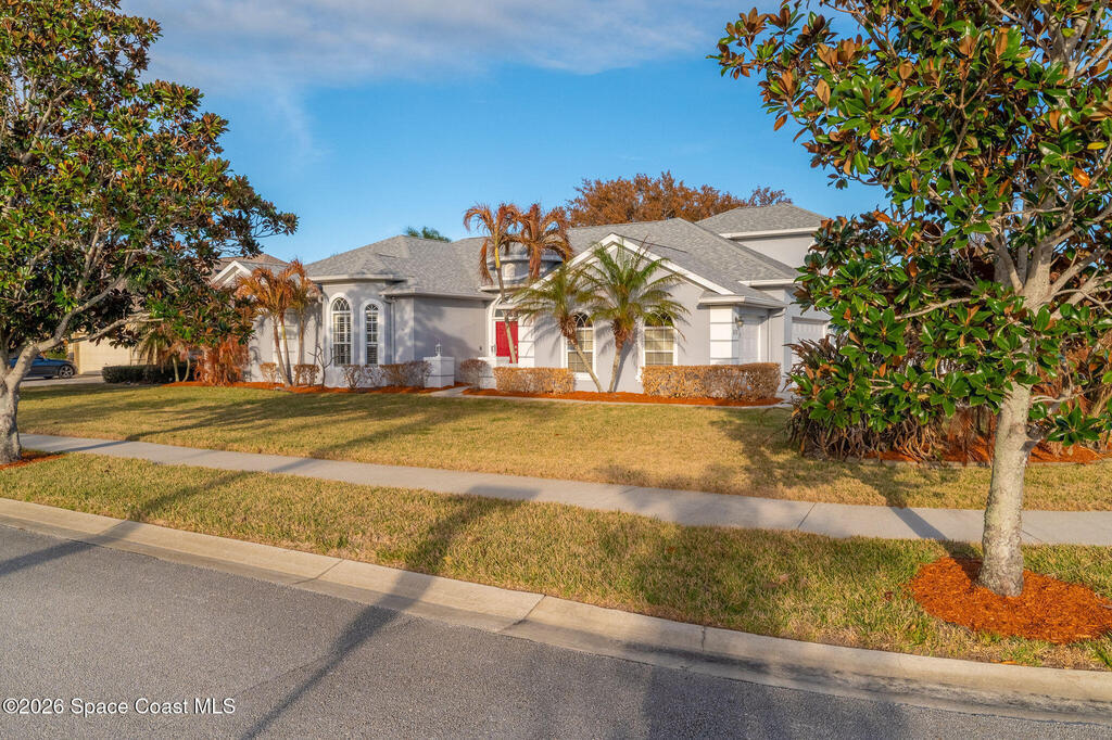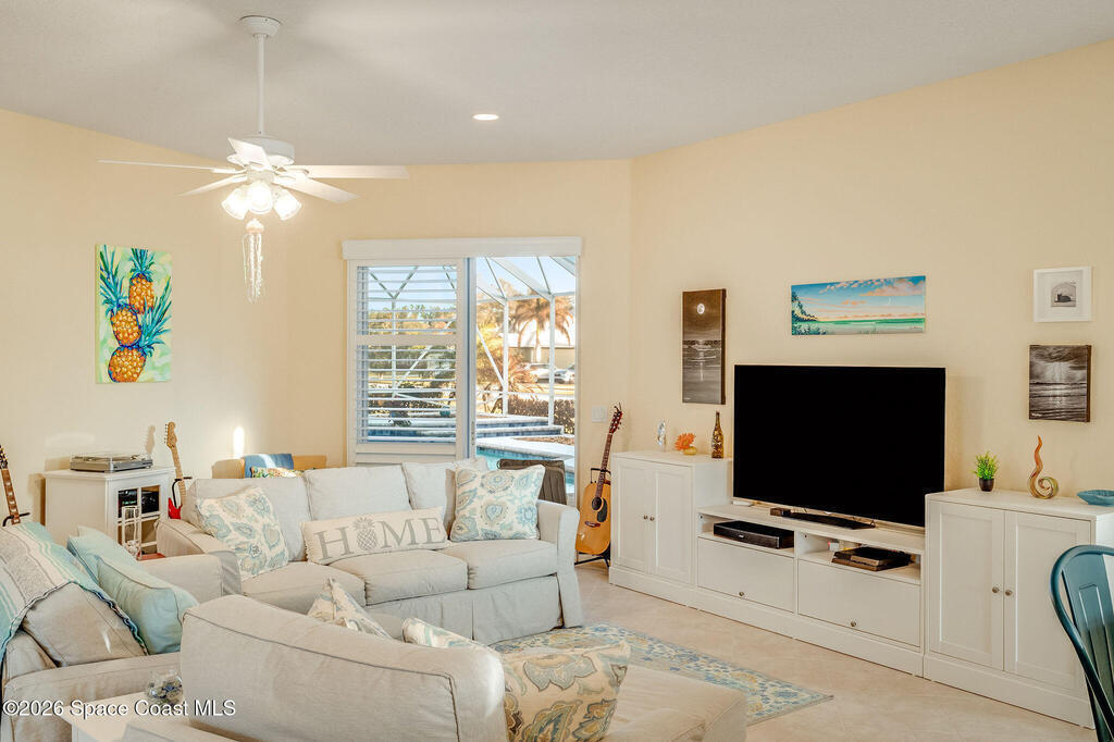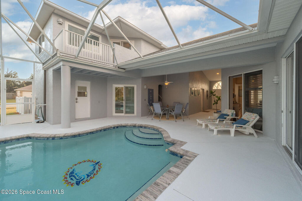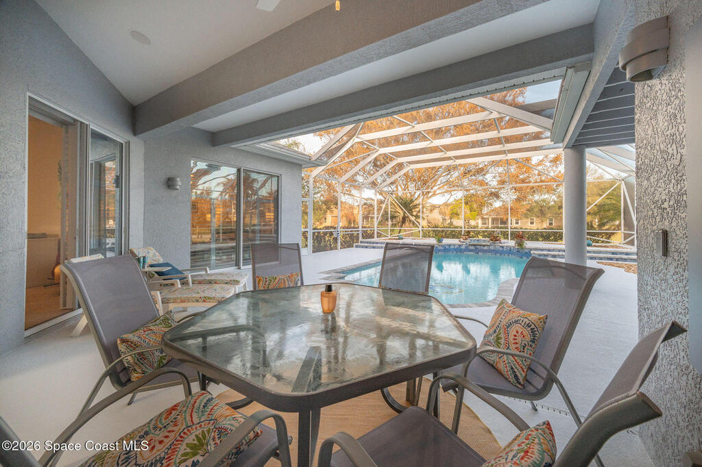 Embrace the Florida lifestyle in this light and bright 4-bedroom, plus office, 3-bath patio home featuring an open floor plan and a private courtyard-style pool that anchors the living spaces. Multiple rooms open directly to the patio, creating effortless indoor-outdoor flow. The kitchen showcases quartz countertops and generous prep space, ideal for everyday living and entertaining. The flexible layout is perfect for multi-generational living with a separate in-law suite that provides privacy for guests or extended family and a spacious bedroom or game room for hobbies or movie nights. Watch rocket launches from the balcony. Recent improvements include a resurfaced pool (2022), Roof approximately 8 years old, impact windows on the in-law suite and game room, plantation shutters, a 2020 deep irrigation well, and a new AC in 2025. Located in River Grove on the Trail with a private community dock and river access, this home offers comfort, versatility, and true Florida waterfront living.