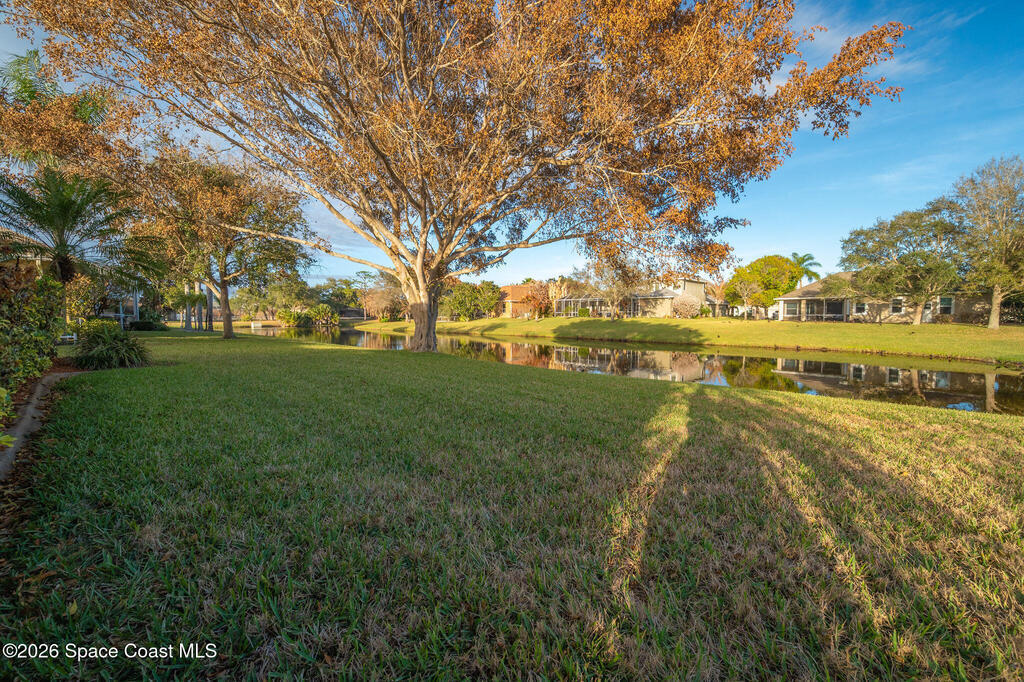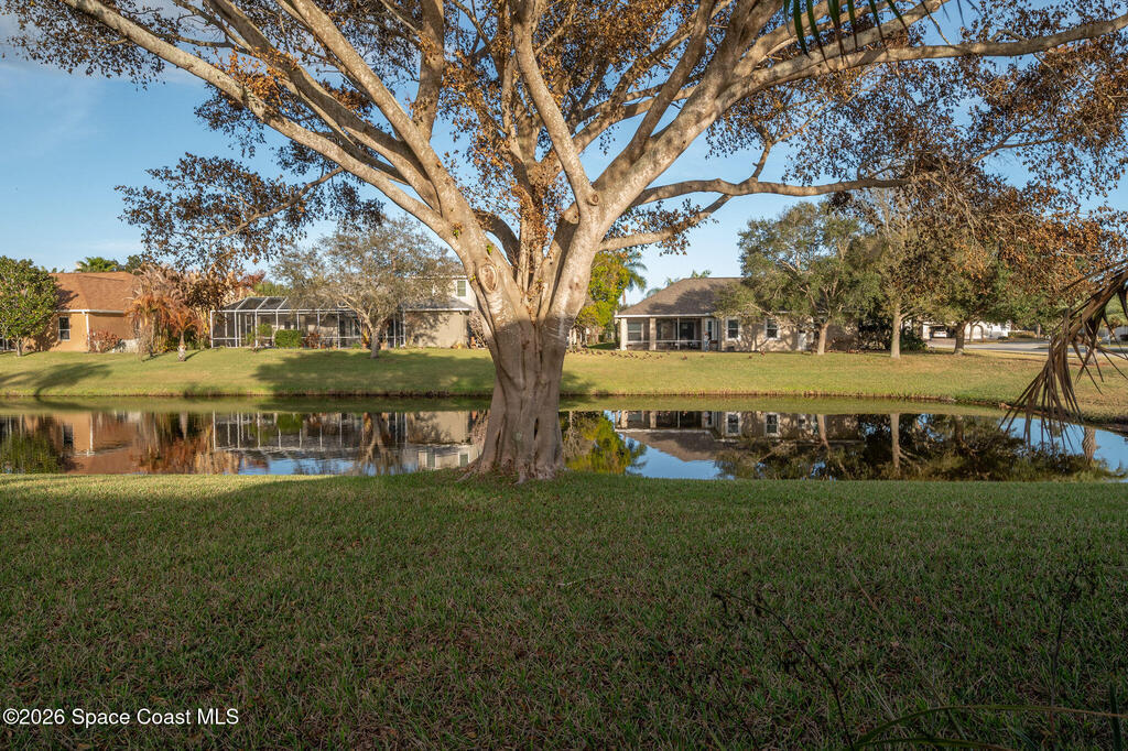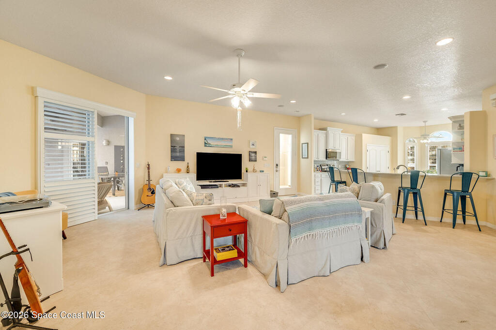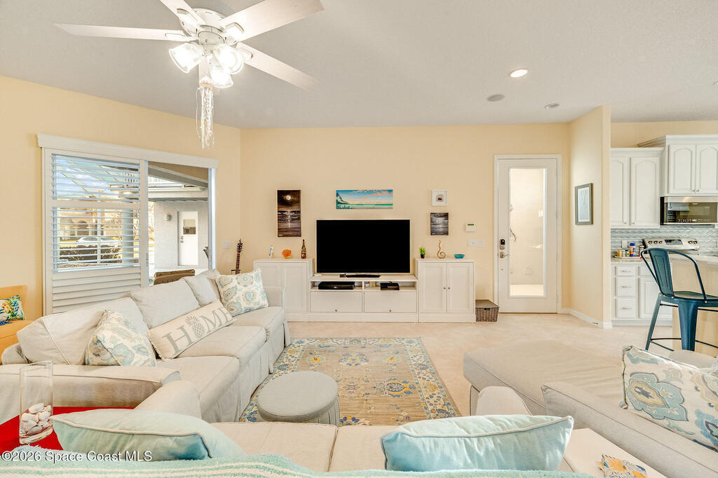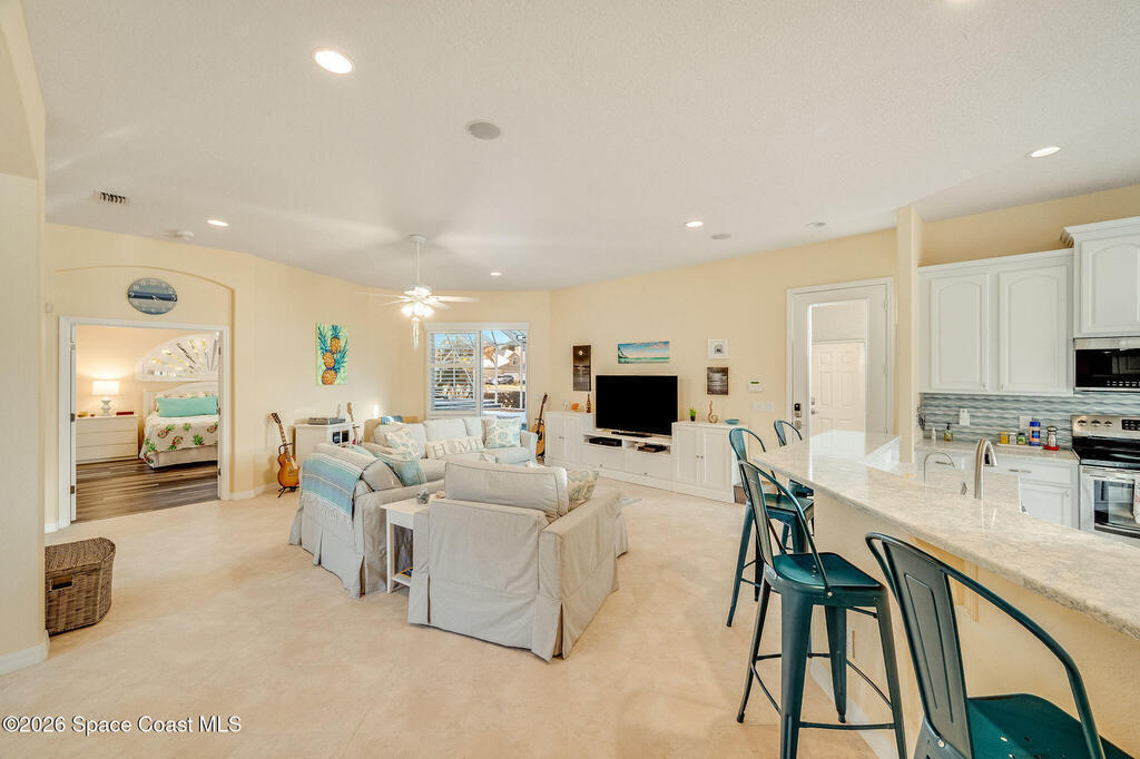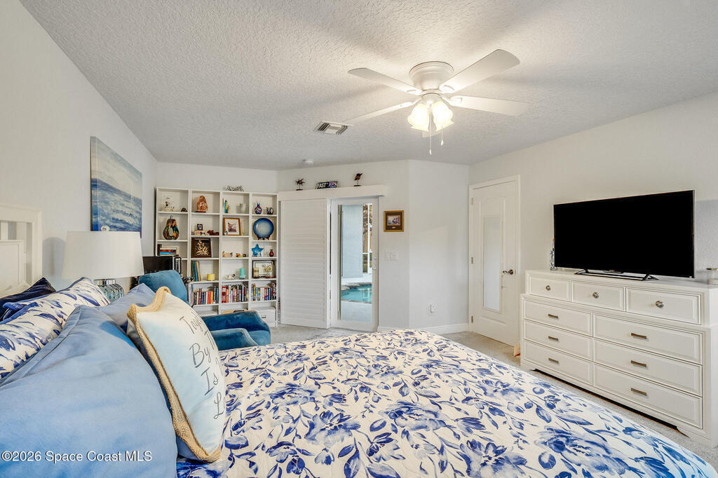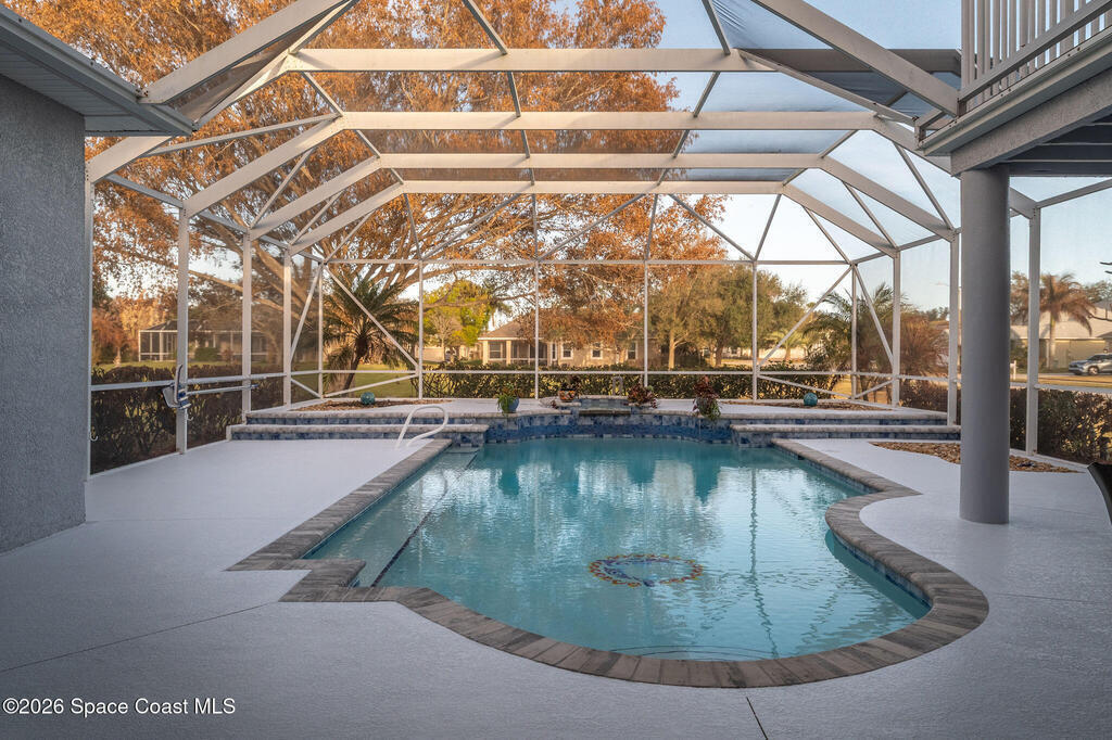 Embrace the Florida lifestyle in this light and bright 4-bedroom, plus office, 3-bath patio home featuring an open floor plan and a private courtyard-style pool that anchors the living spaces. Multiple rooms open directly to the patio, creating effortless indoor-outdoor flow. The kitchen showcases quartz countertops and generous prep space, ideal for everyday living and entertaining. The flexible layout is perfect for multi-generational living with a separate in-law suite that provides privacy for guests or extended family and a spacious bedroom or game room for hobbies or movie nights. Watch rocket launches from the balcony. Recent improvements include a resurfaced pool (2022), Roof approximately 8 years old, impact windows on the in-law suite and game room, plantation shutters, a 2020 deep irrigation well, and a new AC in 2025. Located in River Grove on the Trail with a private community dock and river access, this home offers comfort, versatility, and true Florida waterfront living.