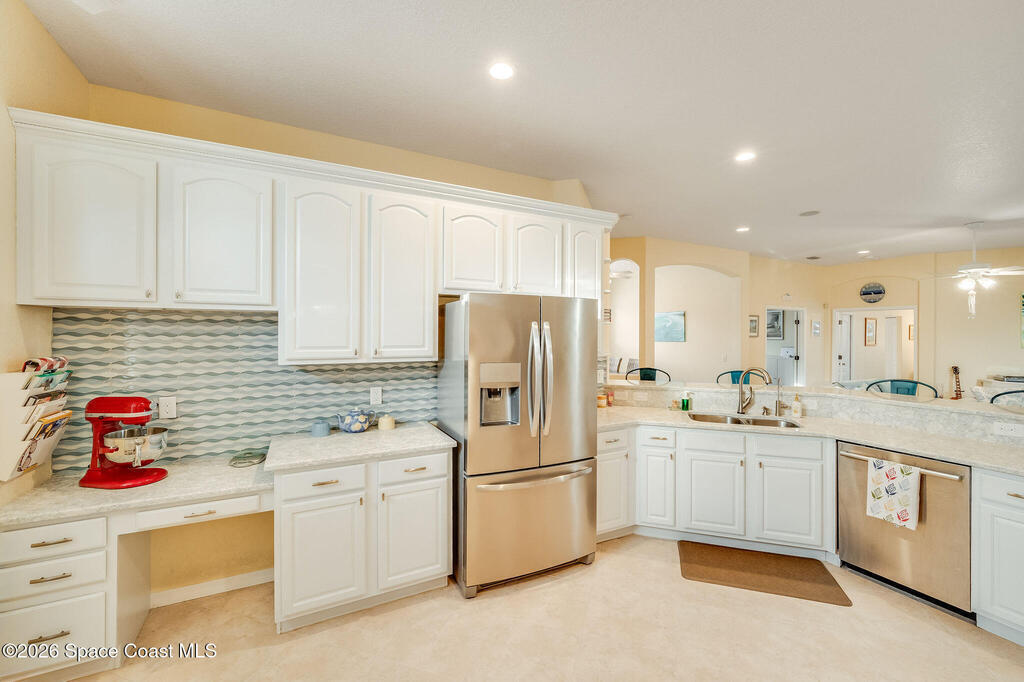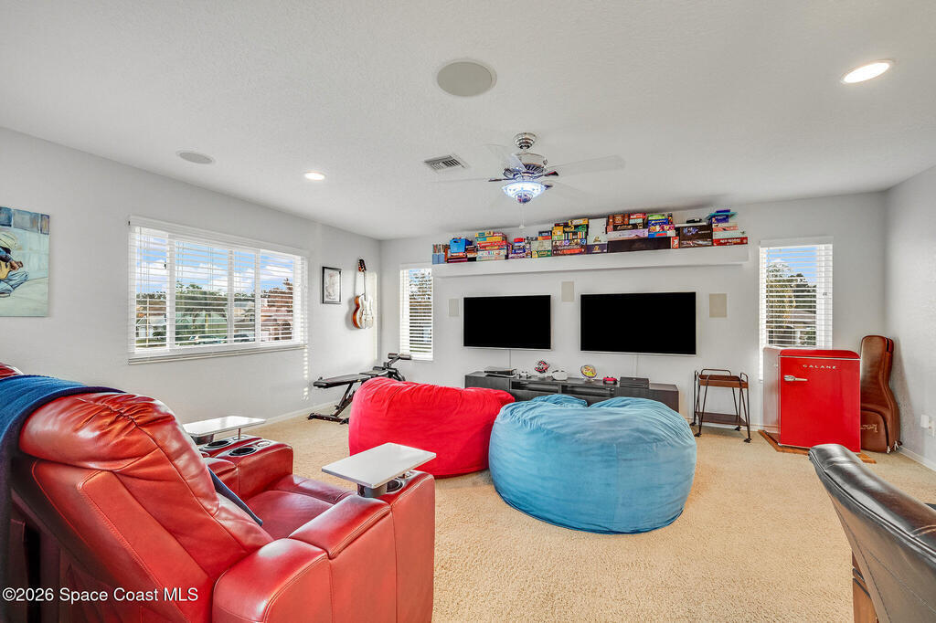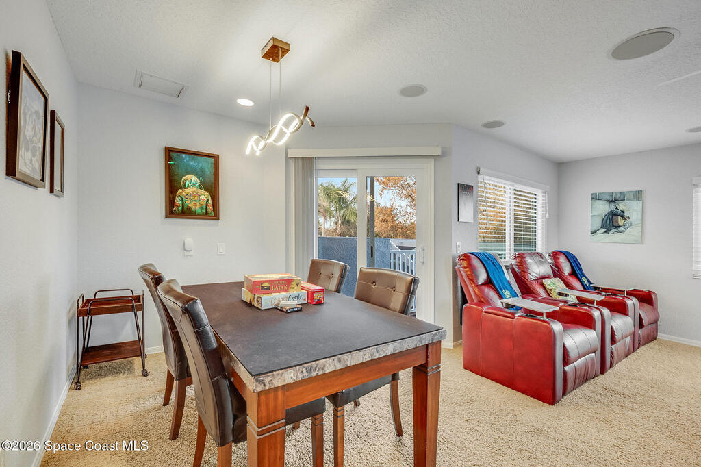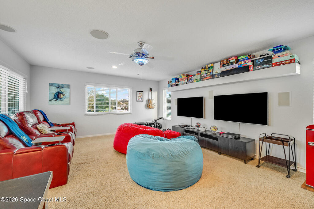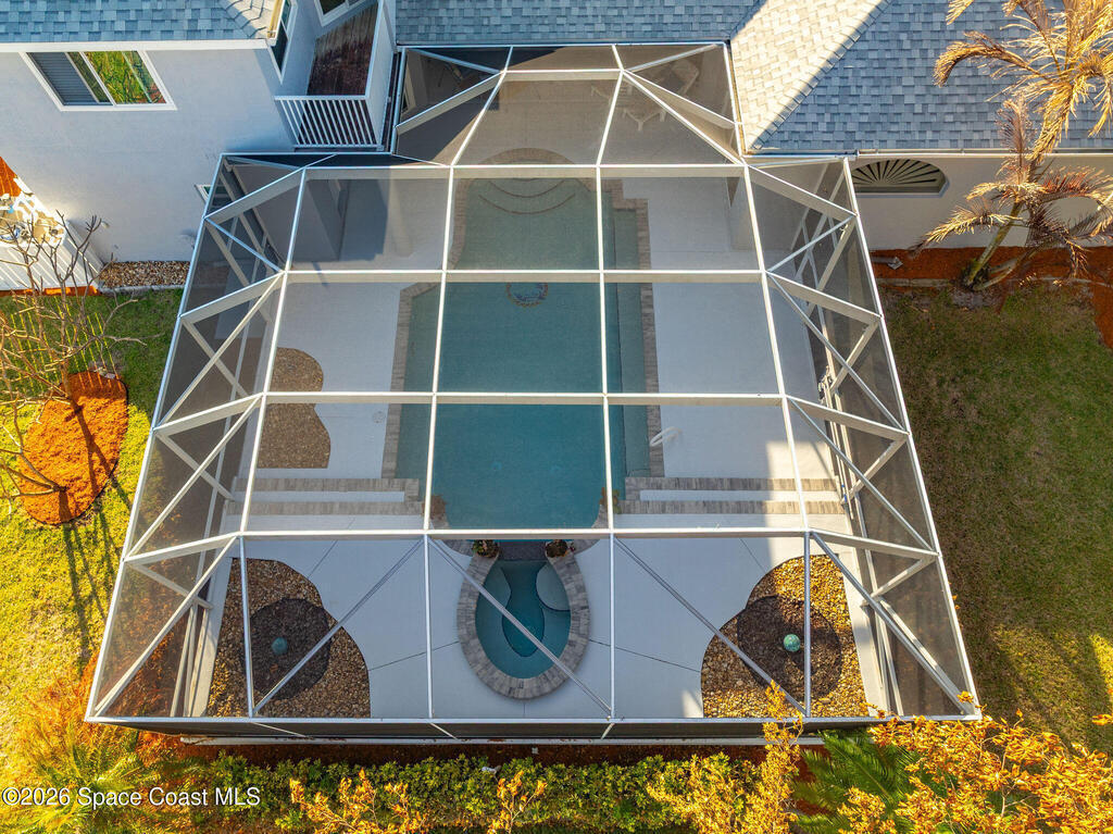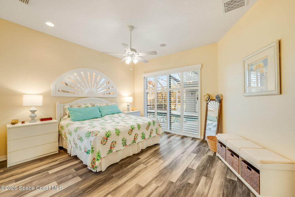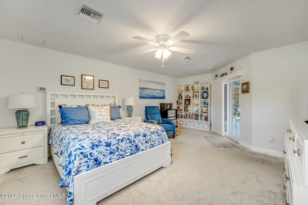 Embrace the Florida lifestyle in this light and bright 4-bedroom, plus office, 3-bath patio home featuring an open floor plan and a private courtyard-style pool that anchors the living spaces. Multiple rooms open directly to the patio, creating effortless indoor-outdoor flow. The kitchen showcases quartz countertops and generous prep space, ideal for everyday living and entertaining. The flexible layout is perfect for multi-generational living with a separate in-law suite that provides privacy for guests or extended family and a spacious bedroom or game room for hobbies or movie nights. Watch rocket launches from the balcony. Recent improvements include a resurfaced pool (2022), Roof approximately 8 years old, impact windows on the in-law suite and game room, plantation shutters, a 2020 deep irrigation well, and a new AC in 2025. Located in River Grove on the Trail with a private community dock and river access, this home offers comfort, versatility, and true Florida waterfront living.