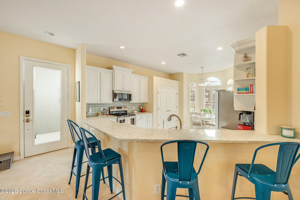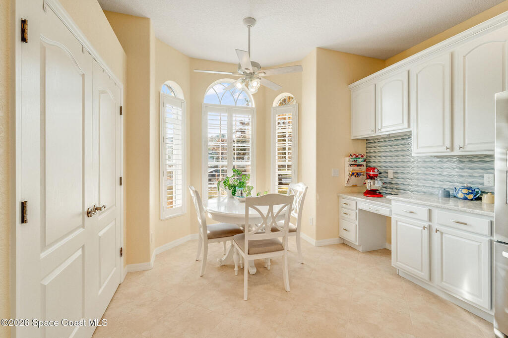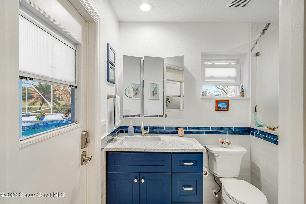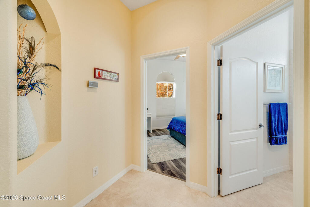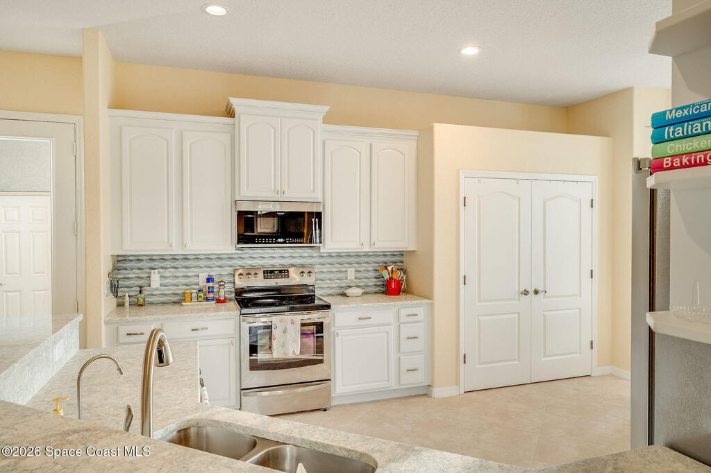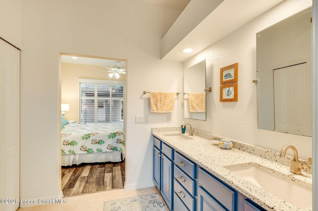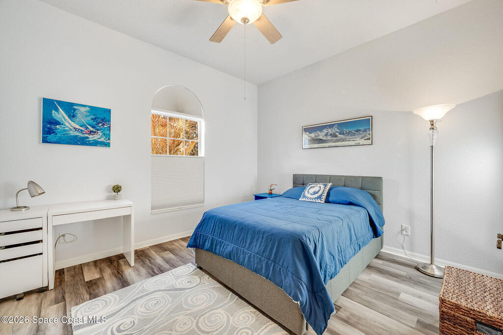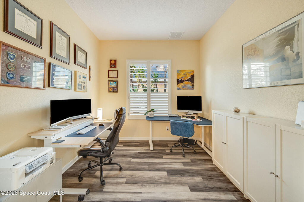 Embrace the Florida lifestyle in this light and bright 4-bedroom, plus office, 3-bath patio home featuring an open floor plan and a private courtyard-style pool that anchors the living spaces. Multiple rooms open directly to the patio, creating effortless indoor-outdoor flow. The kitchen showcases quartz countertops and generous prep space, ideal for everyday living and entertaining. The flexible layout is perfect for multi-generational living with a separate in-law suite that provides privacy for guests or extended family and a spacious bedroom or game room for hobbies or movie nights. Watch rocket launches from the balcony. Recent improvements include a resurfaced pool (2022), Roof approximately 8 years old, impact windows on the in-law suite and game room, plantation shutters, a 2020 deep irrigation well, and a new AC in 2025. Located in River Grove on the Trail with a private community dock and river access, this home offers comfort, versatility, and true Florida waterfront living.
