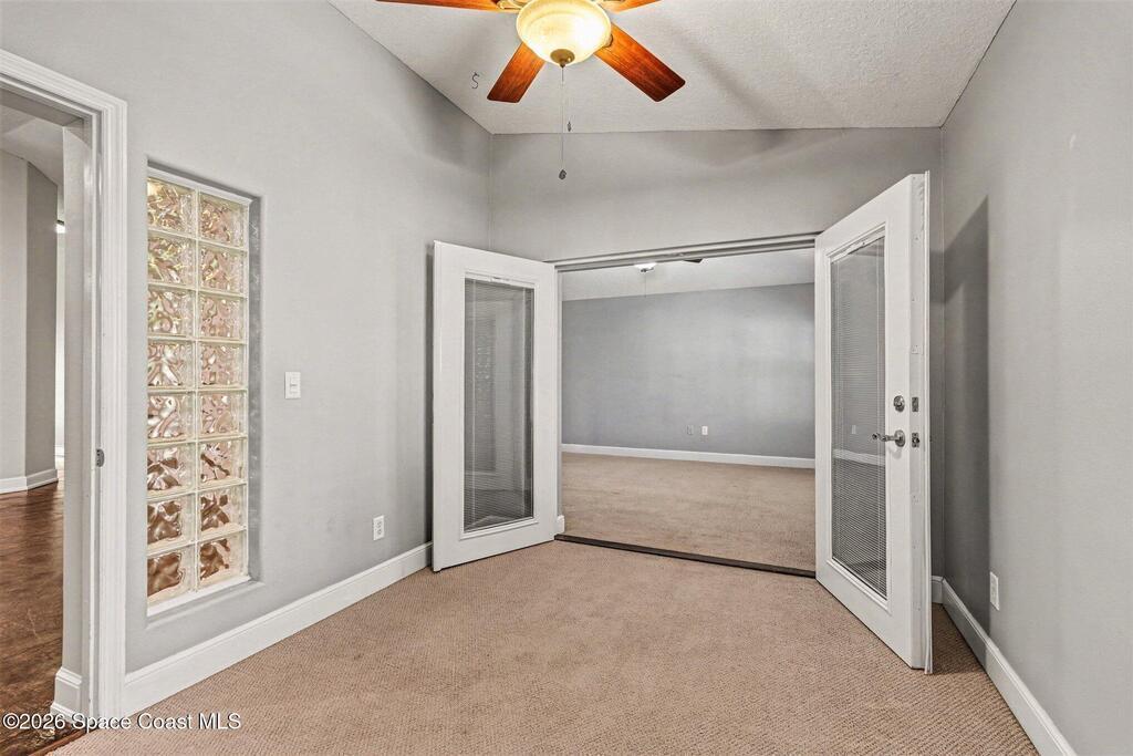 Spacious 3 bedroom, 2 bath townhome with private lot just steps from the beach, offering comfortable coastal living in a well-maintained 2006 construction. High vaulted ceilings and generous living areas create an open, airy feel, while the kitchen features granite countertops and wood cabinetry. Windows throughout include built-in wooden blinds for added style and convenience. The primary suite offers dual his-and-hers closets, an en-suite bath with a sunken tub, separate shower and vanity, plus an attached office ideal for remote work or flex space. Recent updates include 2021 HVAC, 2023 water heater. Built with comfort & resilience in mind, the home features a metal roof & hurricane shutters that adds peace of mind. The spacious backyard provides plenty of room for outdoor living with potential space for a future pool. No HOA. Connected only at the garage roofline with no shared interior walls.