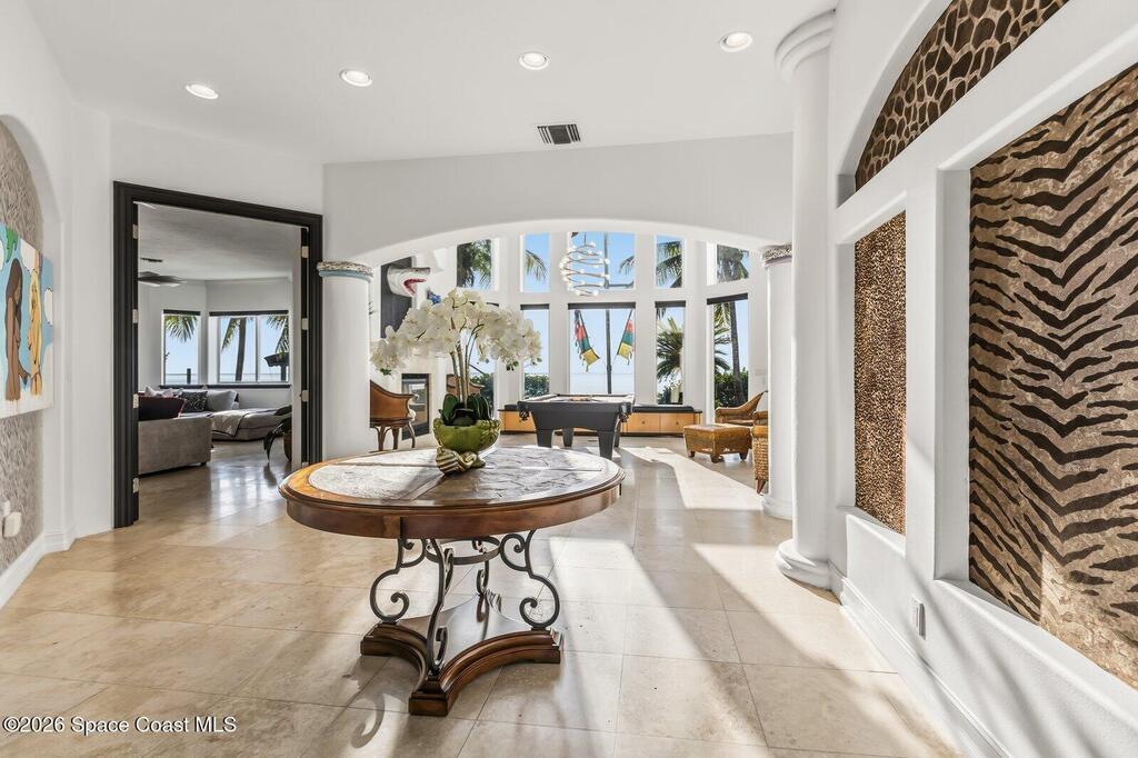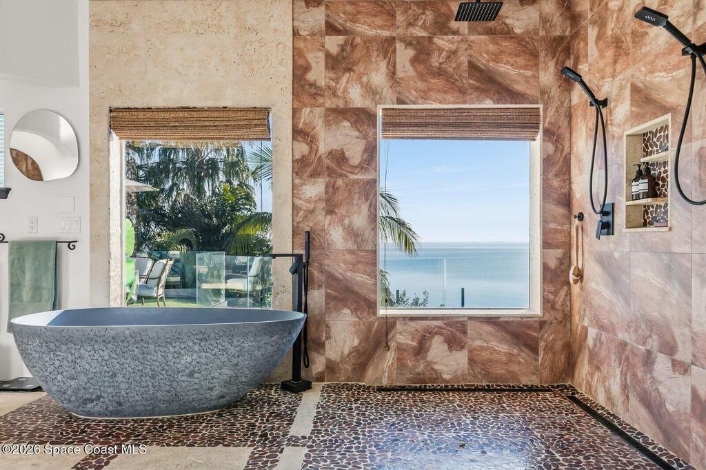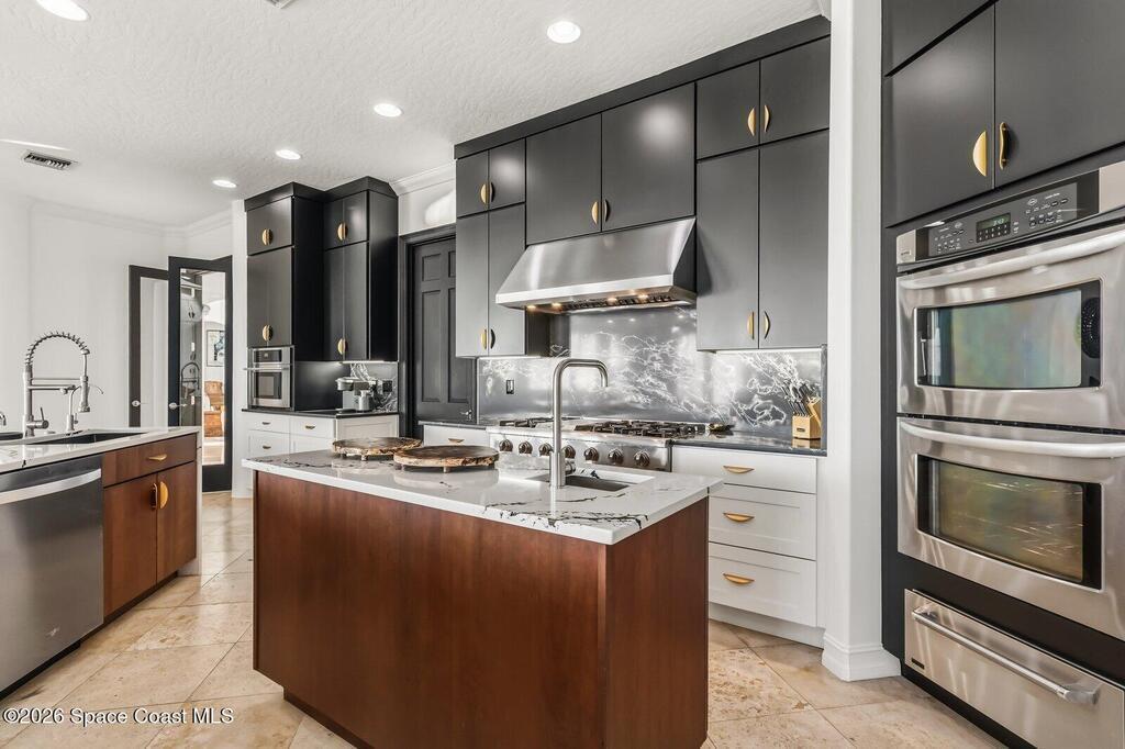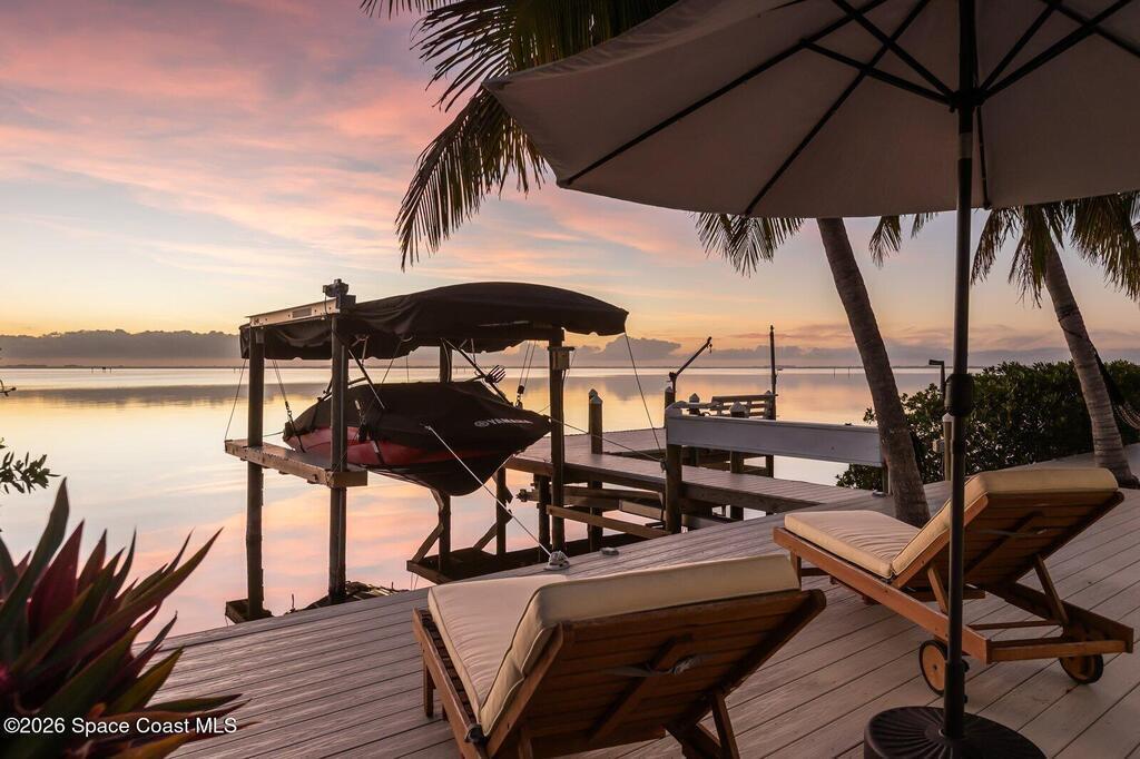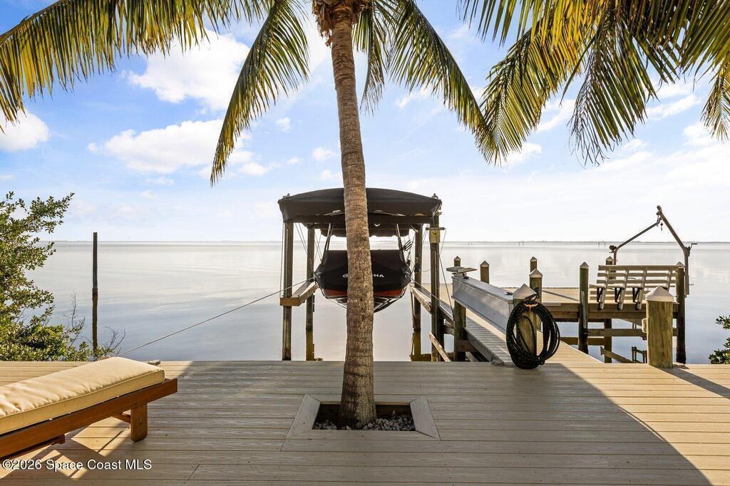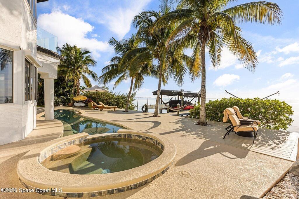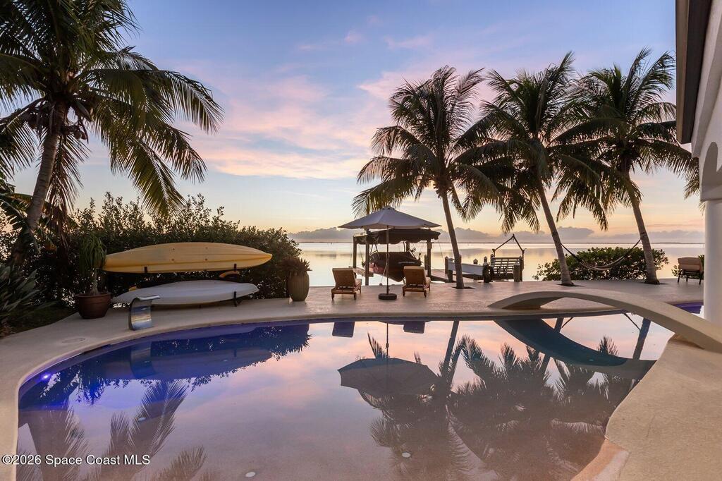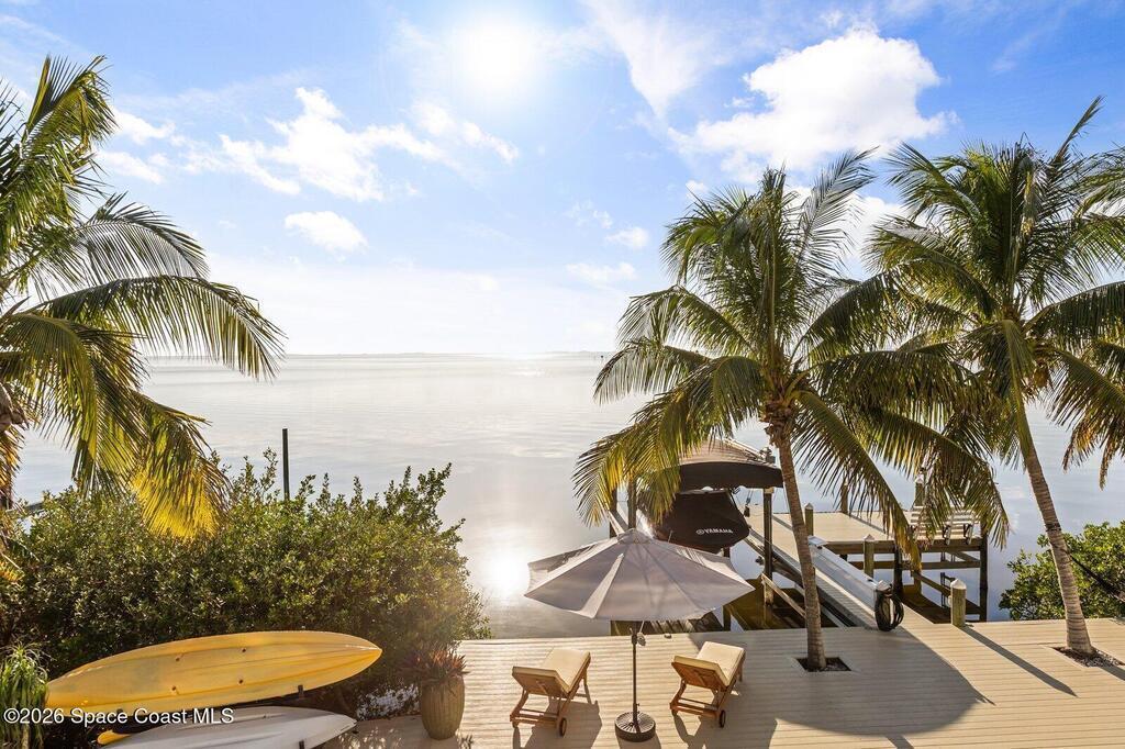 Luxurious waterfront custom estate with 5 bedrooms, 5.5 baths, and over 6,558 square feet exceptionally updated in 2022. Experience endless coastal paradise with 150 feet of Banana River frontage, breathtaking unobstructed views, dolphins swimming in your backyard, boat access to the Atlantic Ocean, nearby beaches in the Surf Capital of the East Coast and iconic rocket launches from Kennedy Space Center. This exquisite waterfront property offers a blend of luxury and comfort, and is designed to maximize natural light and stunning water views. The chef's kitchen is ideal for entertaining and features two islands, two dishwashers, three chef sinks, custom-designed stone countertops and backsplash, high-end appliances and cabinets, six-burner gas stove, wine cellar and a butler's pantry. Along with the gourmet kitchen, the private home office and gym are on the first floor.