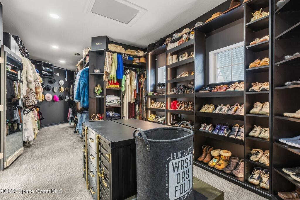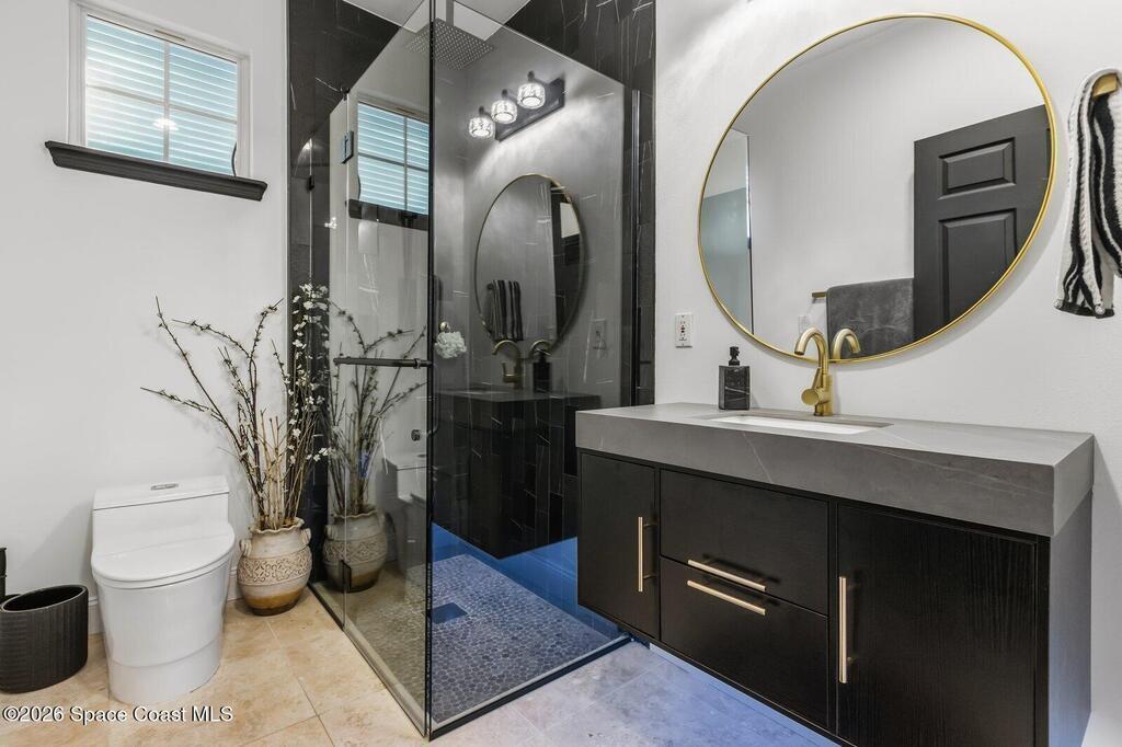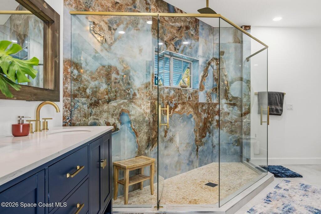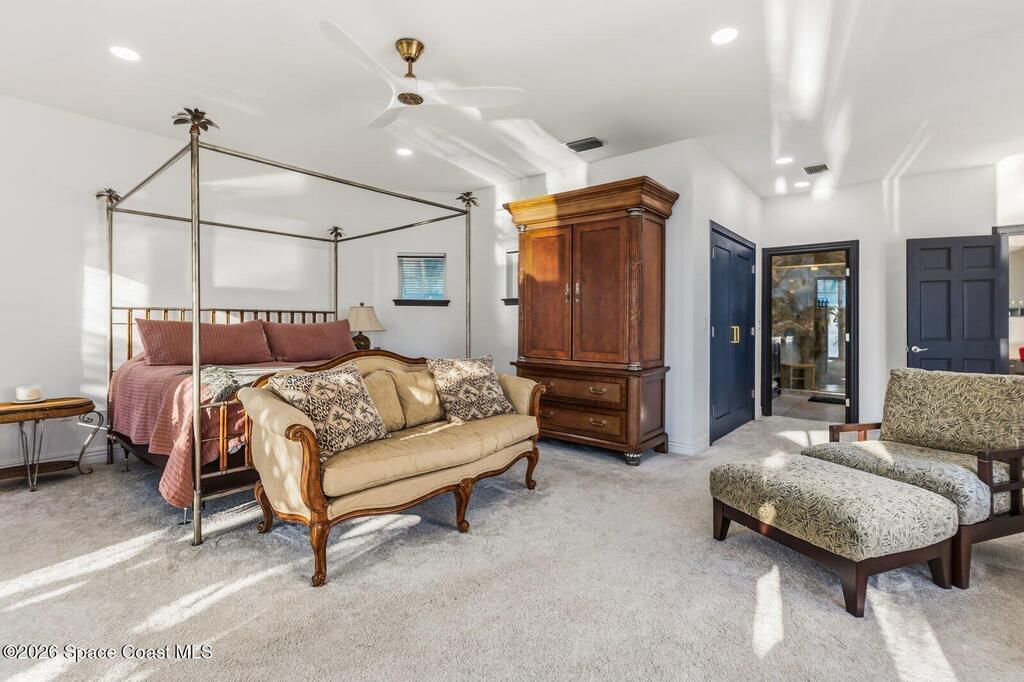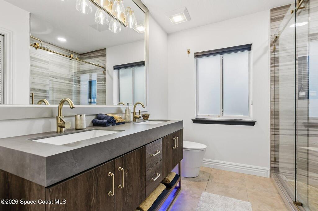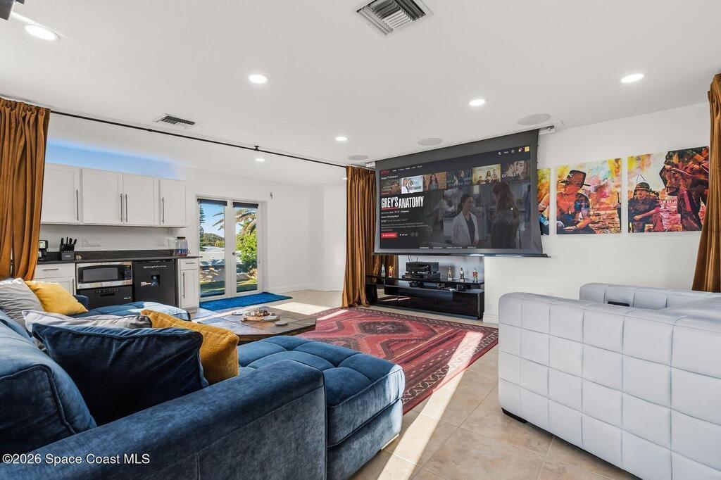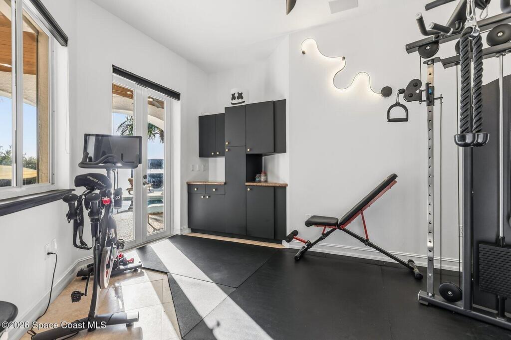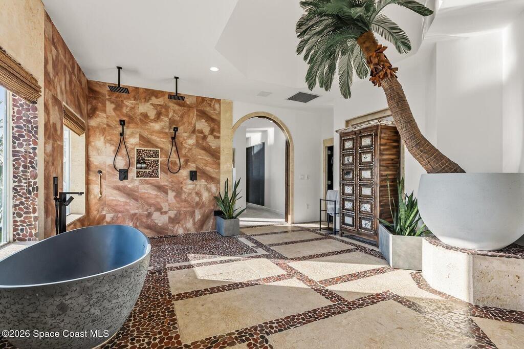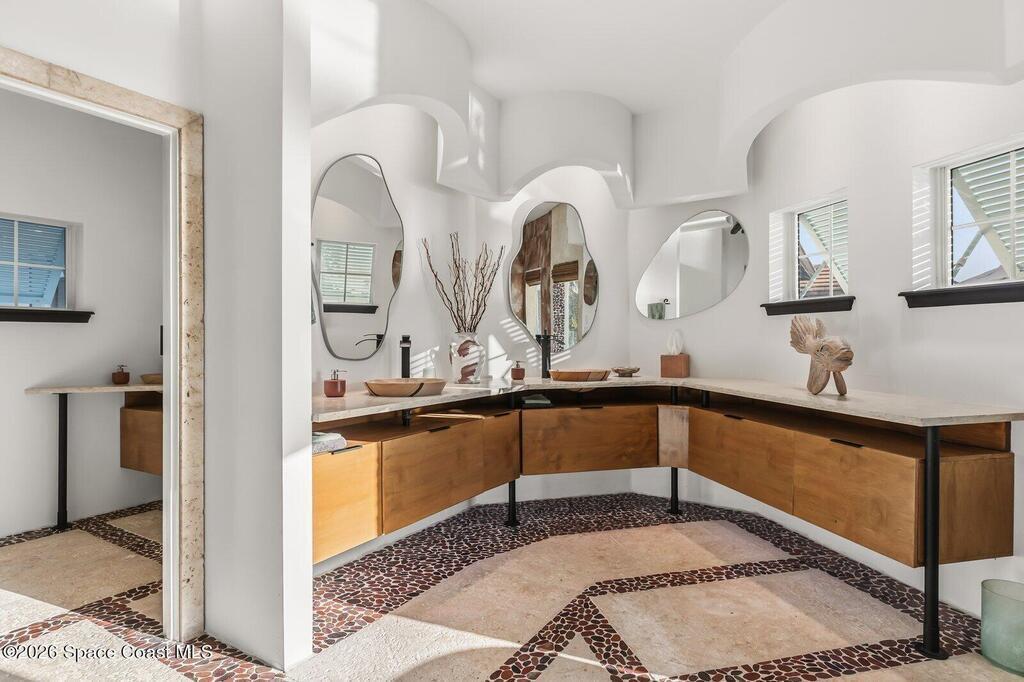 Luxurious waterfront custom estate with 5 bedrooms, 5.5 baths, and over 6,558 square feet exceptionally updated in 2022. Experience endless coastal paradise with 150 feet of Banana River frontage, breathtaking unobstructed views, dolphins swimming in your backyard, boat access to the Atlantic Ocean, nearby beaches in the Surf Capital of the East Coast and iconic rocket launches from Kennedy Space Center. This exquisite waterfront property offers a blend of luxury and comfort, and is designed to maximize natural light and stunning water views. The chef's kitchen is ideal for entertaining and features two islands, two dishwashers, three chef sinks, custom-designed stone countertops and backsplash, high-end appliances and cabinets, six-burner gas stove, wine cellar and a butler's pantry. Along with the gourmet kitchen, the private home office and gym are on the first floor.
