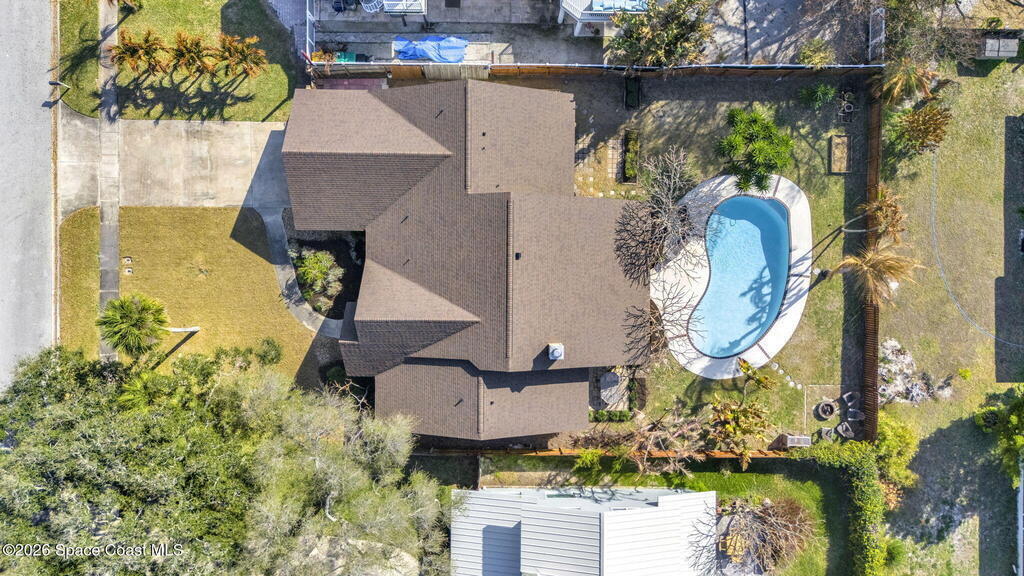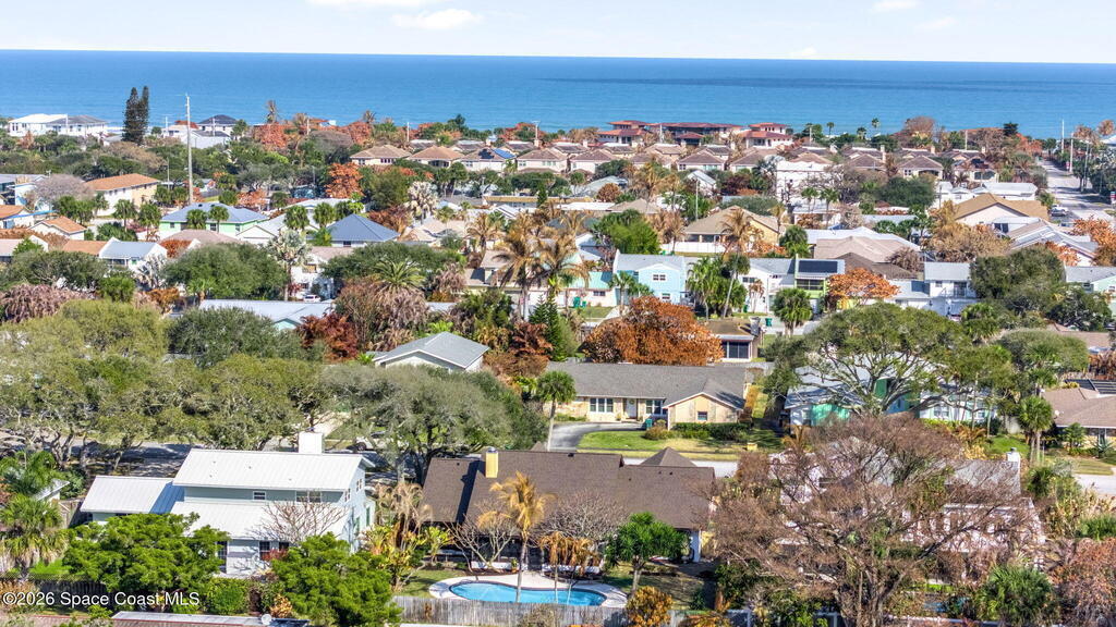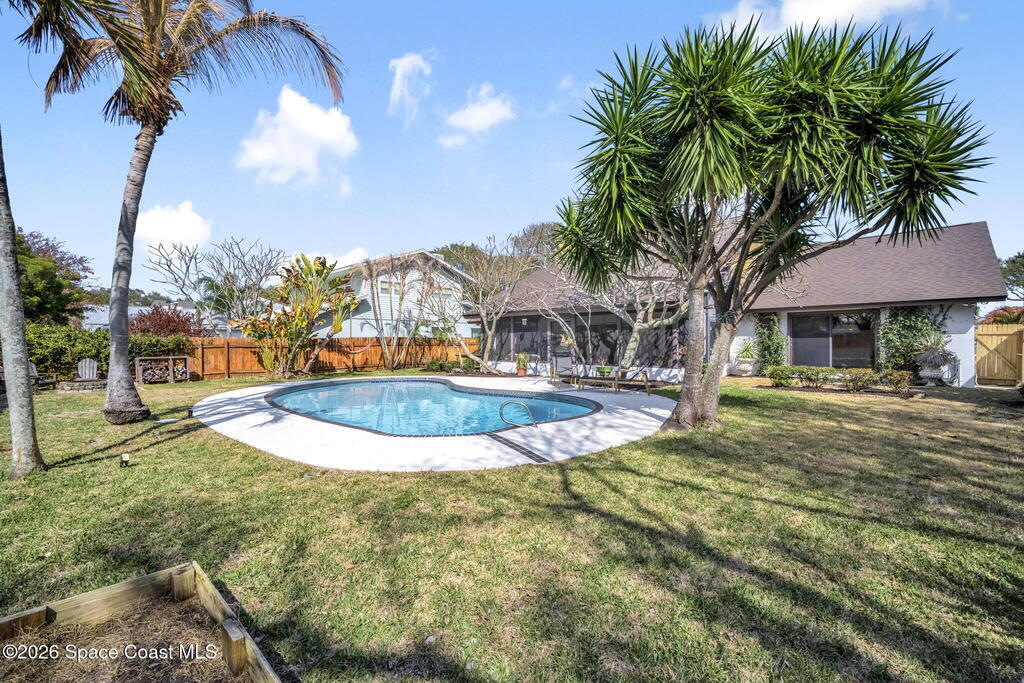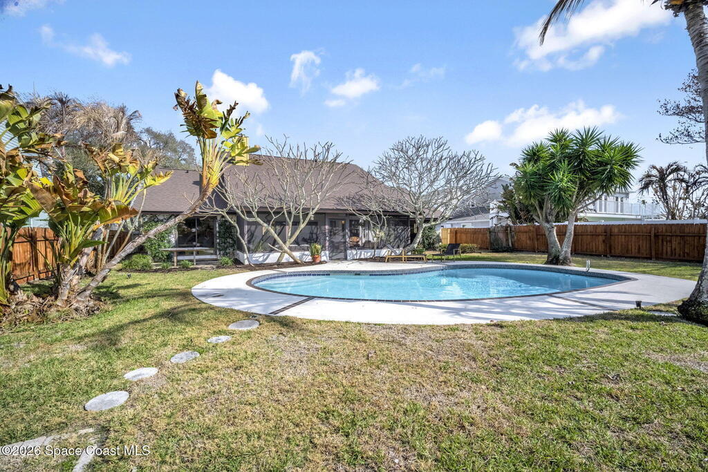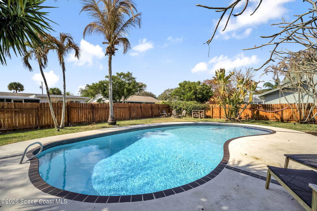 Still showing for backup offers . . .Beautifully built 3-bedroom, 2-bath pool home located on a quiet cul-de-sac, just four blocks from the beach and minutes from downtown Cocoa Beach. Zoned for top-rated schools, this home offers an ideal combination of comfort, location, and long-term value. A brand-new roof and fresh exterior paint provide peace of mind and a move-in-ready feel, while vaulted ceilings and a light-filled split floor plan create an open, functional layout designed for privacy and everyday living. Inside, the home features a stone fireplace, quality wood flooring, and tile throughout. The kitchen offers ample cabinet and counter space and opens to a breakfast nook with views of the pool and newly landscaped backyard. The primary suite includes a jetted tub, walk-in shower, and walk-in closet. With no HOA restrictions and included plans for an attached ADU, this property offers excellent flexibility for income.