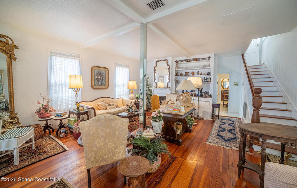 Experience timeless charm and modern comfort in this stunning Indian River waterfront home. Original wood floors blend beautifully with a thoughtfully updated kitchen, creating the perfect balance of character and convenience. Enjoy breathtaking river views and unforgettable rocket launches from your private dock or the primary bedroom balcony. This exceptional property features two fireplaces, high-impact storm shutters, a newer roof, 2 A/C units, and a sprinkler system. The spacious 3-car detached garage offers ample storage and workshop potential, while the dedicated laundry room adds everyday ease. A rare opportunity to own a true waterfront retreat in a premier location.