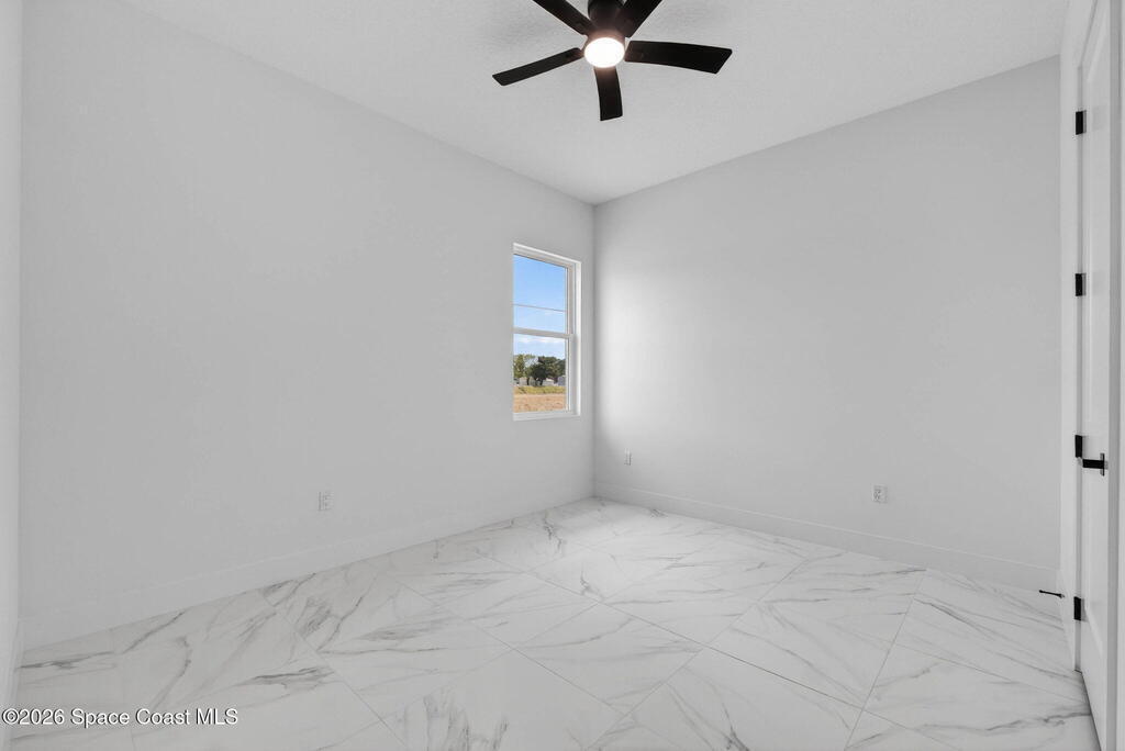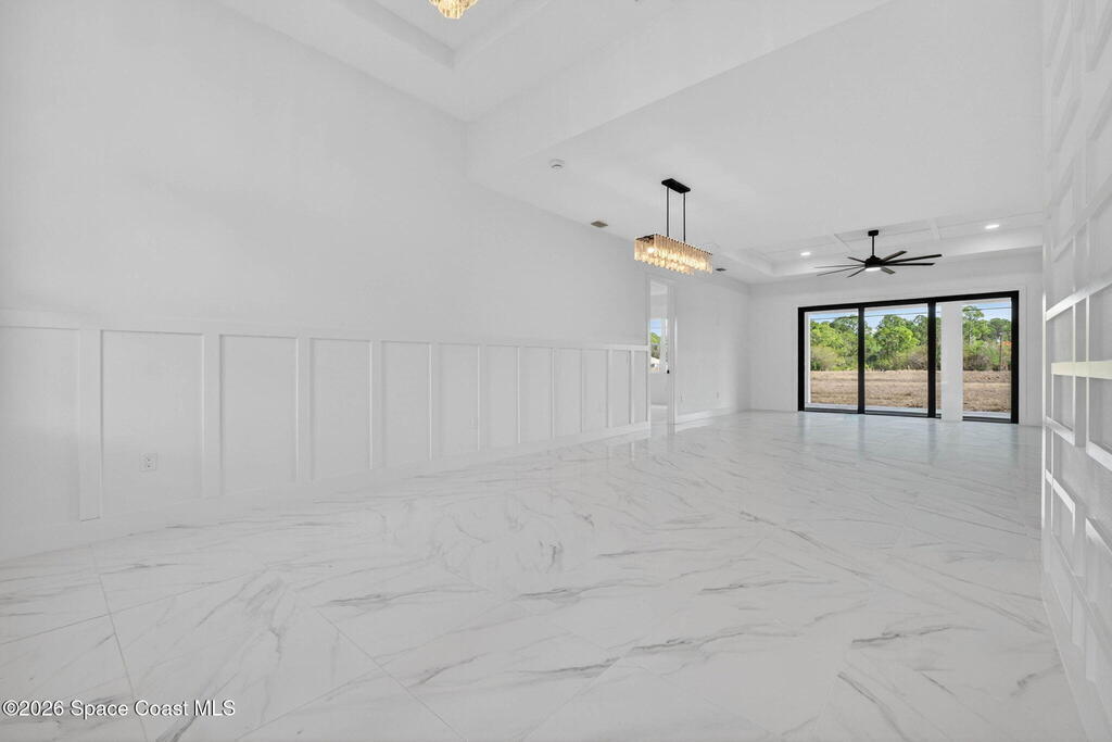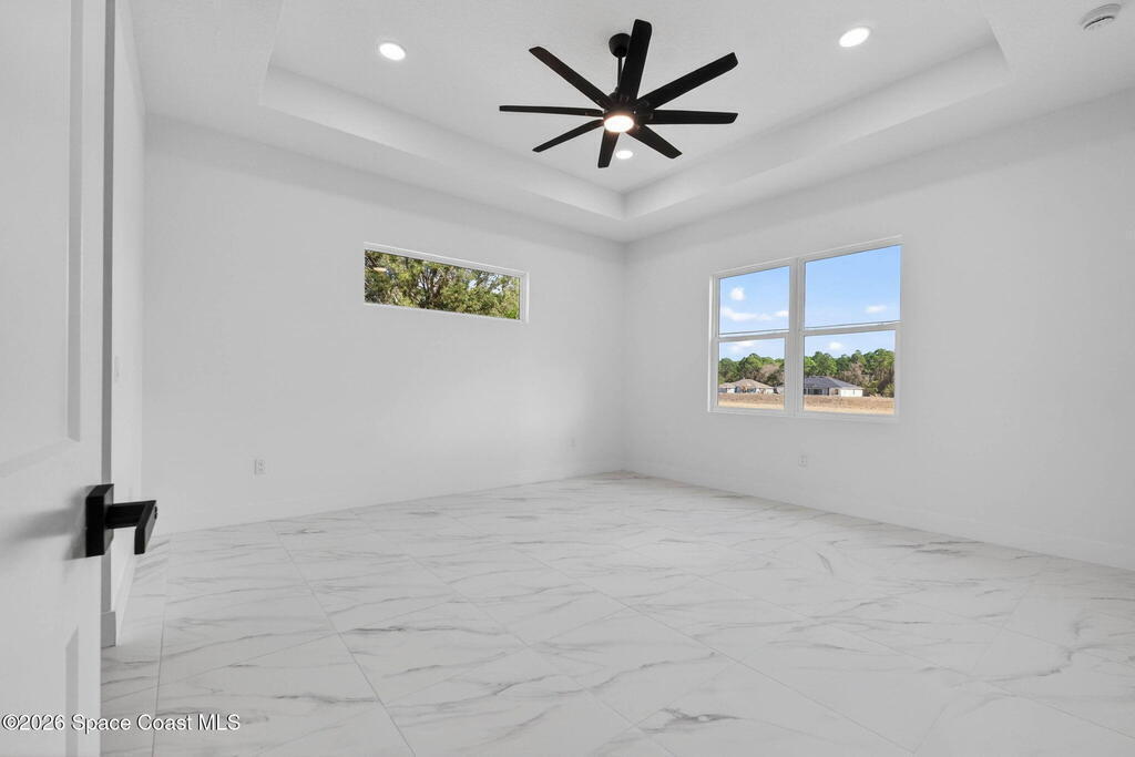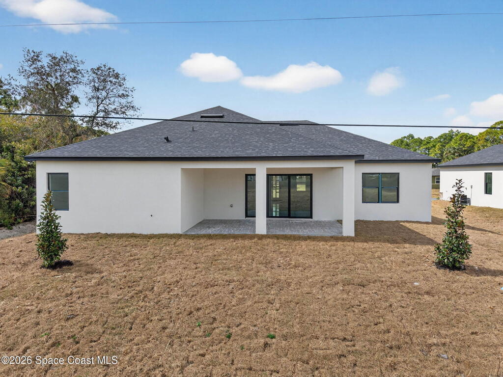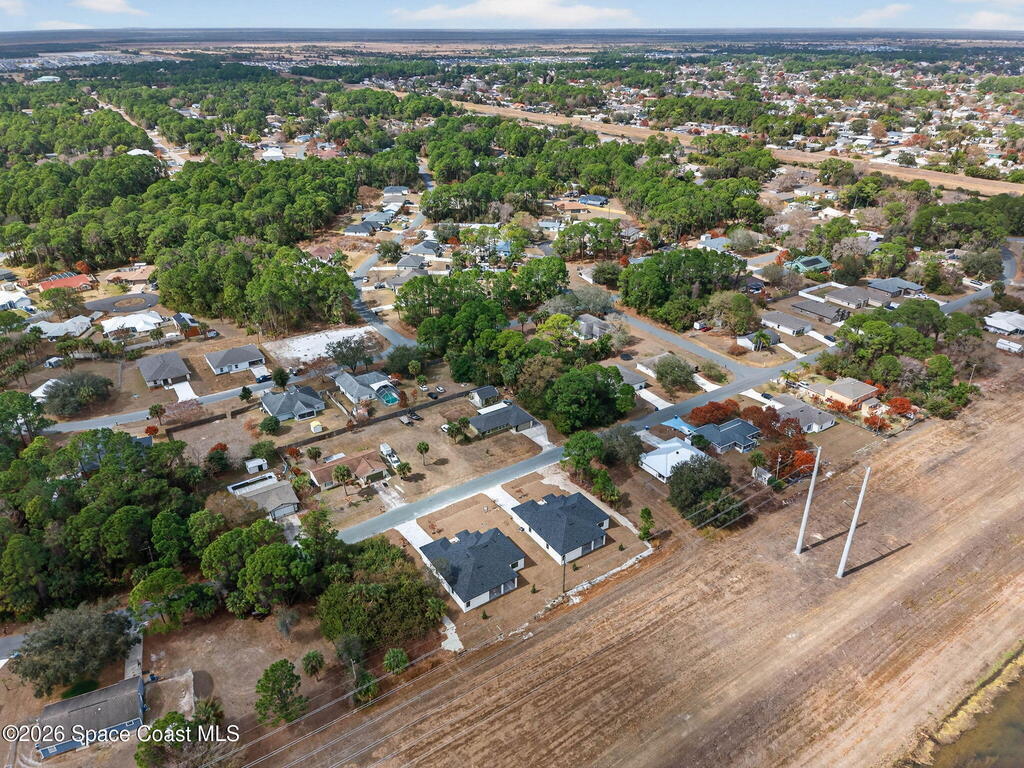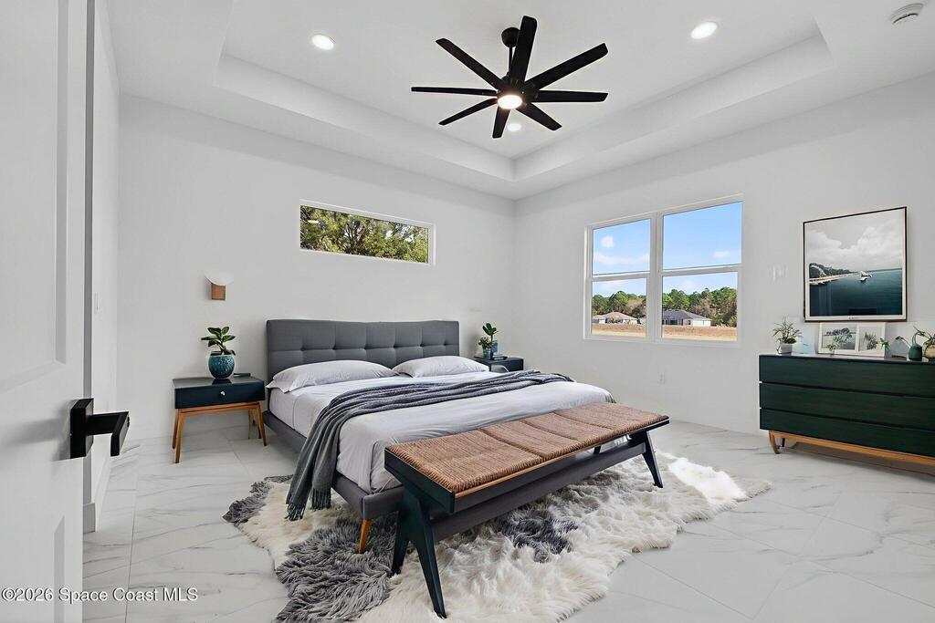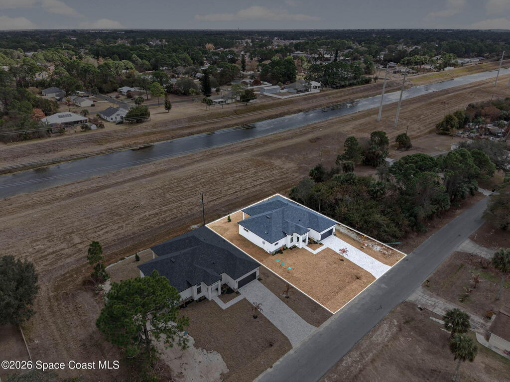 A rare canal-front new construction offering elevated modern living in Northwest Palm Bay. This 2,350 sq ft residence features true 10-foot ceilings with dramatic double tray details, creating a grand architectural presence. Designer 24'' x 24'' tile flooring flows seamlessly throughout, complementing the home's refined contemporary aesthetic.The gourmet kitchen features a wall oven and high end appliance package, ideal for entertaining and everyday living. The spa-inspired primary suite offers a freestanding soaking tub and spacious walk-in shower.Enjoy a covered patio overlooking the tranquil canal, providing privacy and a peaceful outdoor setting. Additional highlights include a luxury paver driveway, paver patio, smart lock system, Impact windows, and modern energy-efficient construction. A rare opportunity to own a thoughtfully designed canal-front residence built for comfort, prestige, and lasting value.