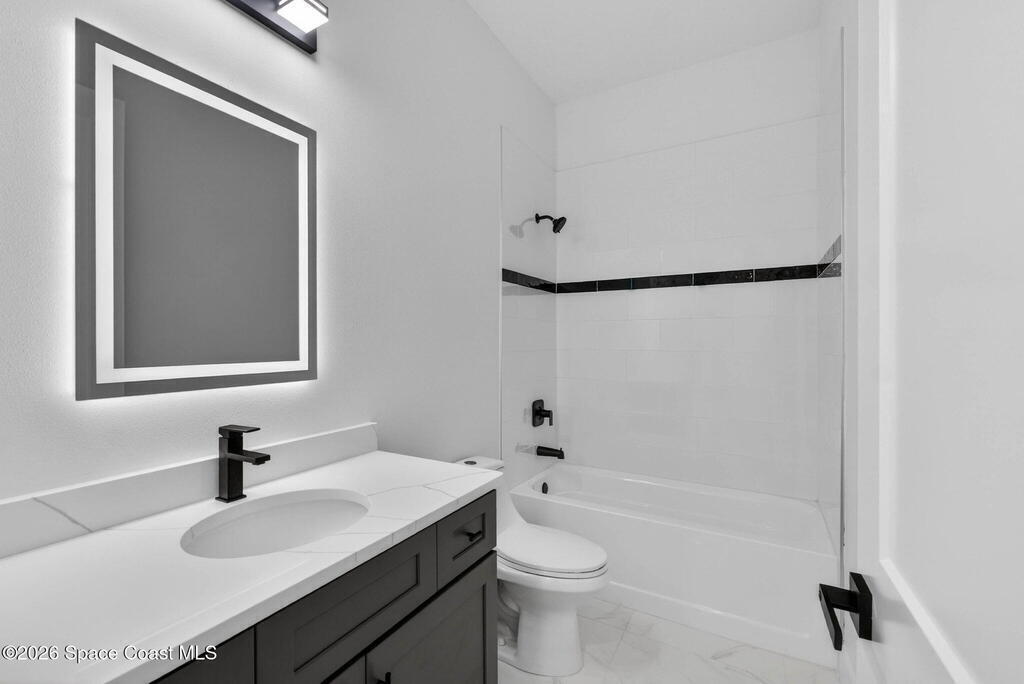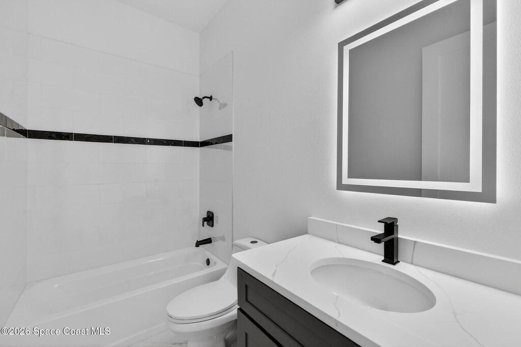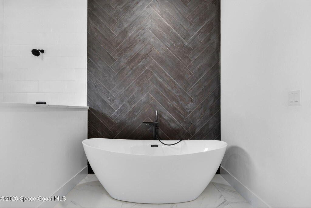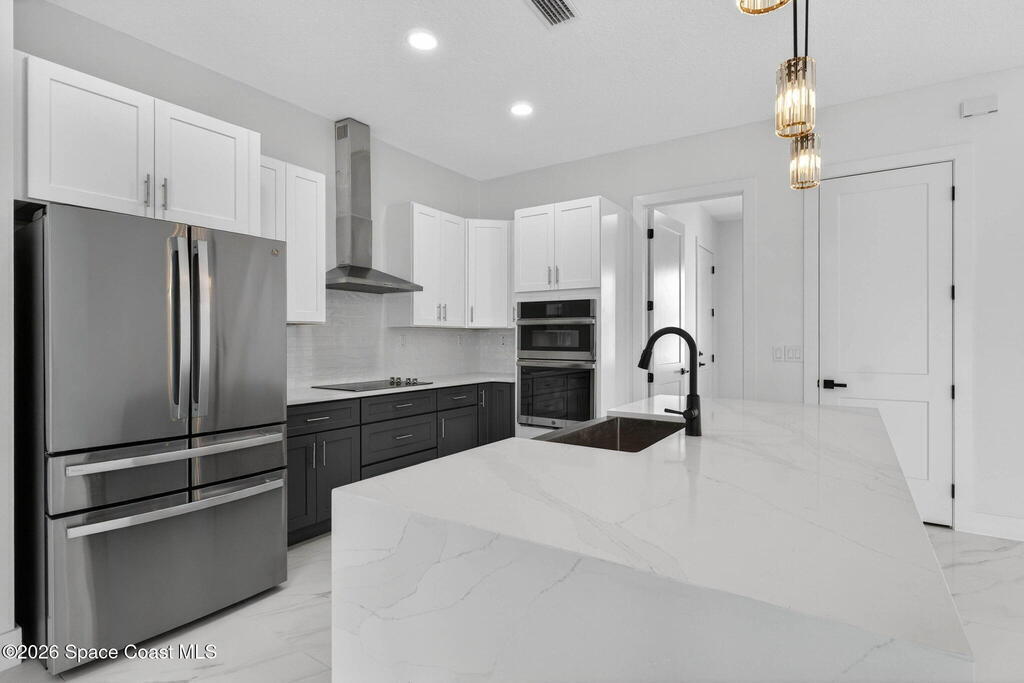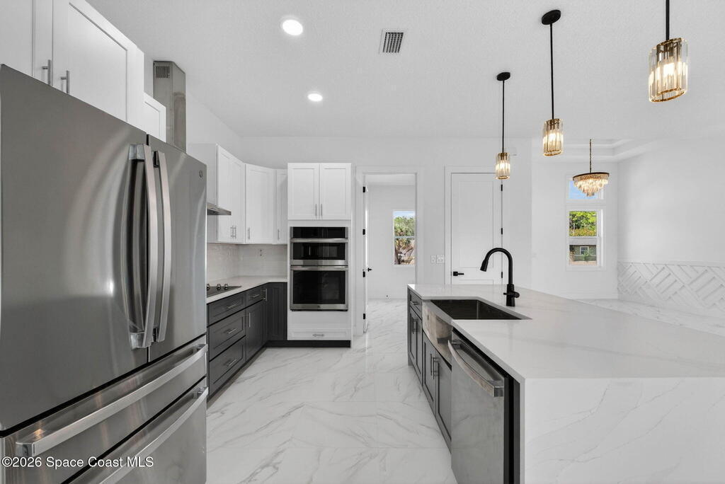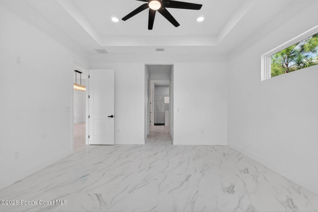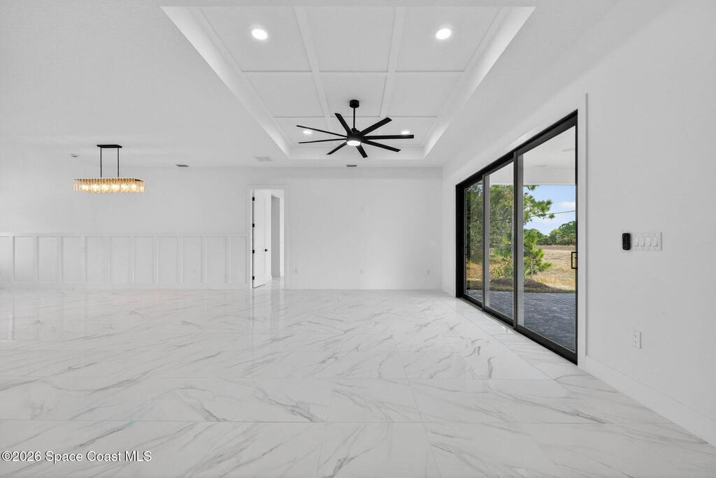 A rare canal-front new construction offering elevated modern living in Northwest Palm Bay. This 2,350 sq ft residence features true 10-foot ceilings with dramatic double tray details, creating a grand architectural presence. Designer 24'' x 24'' tile flooring flows seamlessly throughout, complementing the home's refined contemporary aesthetic.The gourmet kitchen features a wall oven and high end appliance package, ideal for entertaining and everyday living. The spa-inspired primary suite offers a freestanding soaking tub and spacious walk-in shower.Enjoy a covered patio overlooking the tranquil canal, providing privacy and a peaceful outdoor setting. Additional highlights include a luxury paver driveway, paver patio, smart lock system, Impact windows, and modern energy-efficient construction. A rare opportunity to own a thoughtfully designed canal-front residence built for comfort, prestige, and lasting value.