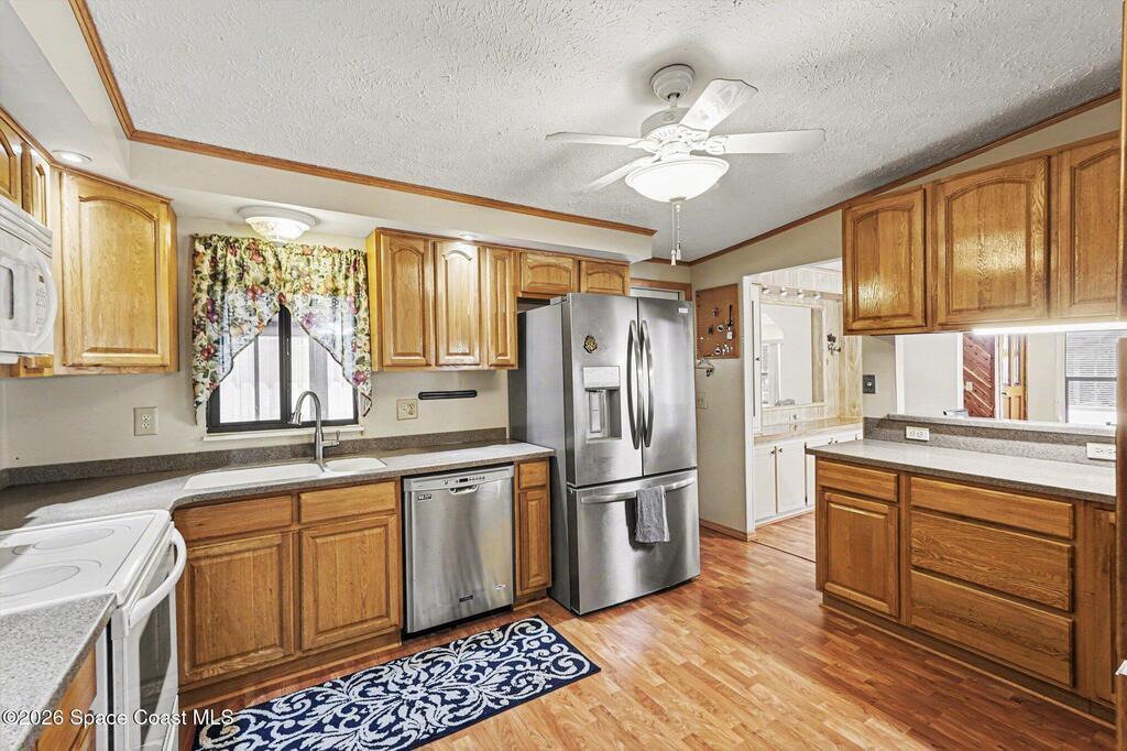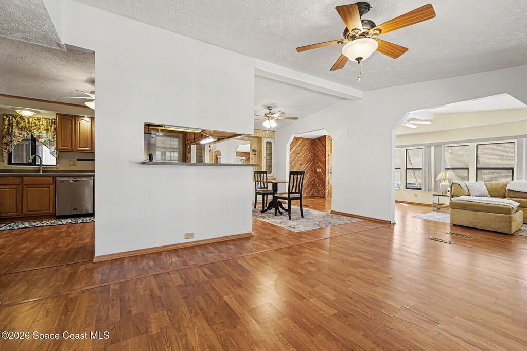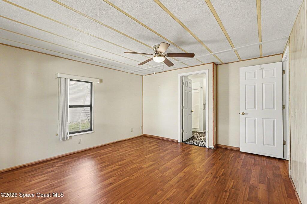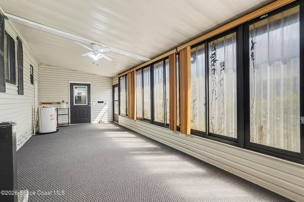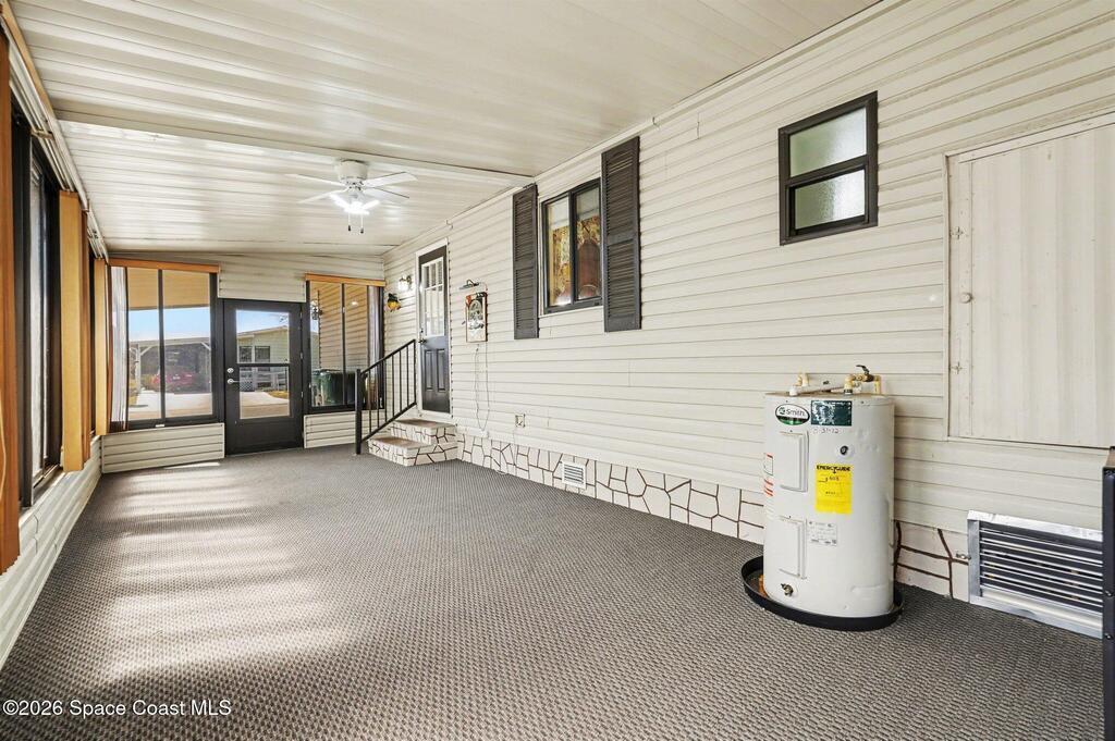 Bright and beautiful home, perfect for entertaining or enjoying the Florida lifestyle! This peaceful retreat features updated bathrooms and an updated kitchen, equipped with stainless steel refrigerator, dishwasher, and corian countertops. Natural light fills the large, open living rooms as you walk through your beautiful front door. The kitchen and dining area flow wonderfully for hosting. The layout includes a spacious master suite with walk in closet, 2nd bedroom and guest bathroom down the hall. The Laundry room is located in your sunroom off of the kitchen, great for indoor/outdoor living. The sunroom opens out to the carport, and fenced in back yard, ideal for pets! You will find your attached workshop right outback as well.Situated in the center of Barefoot Bay, enjoy the great amenities this community has to offer, including a 2-acre private beach, 3 pools, fishing pier, pickle ball courts, 18- hole golf course, restaurants, and so much more, with NO HOA