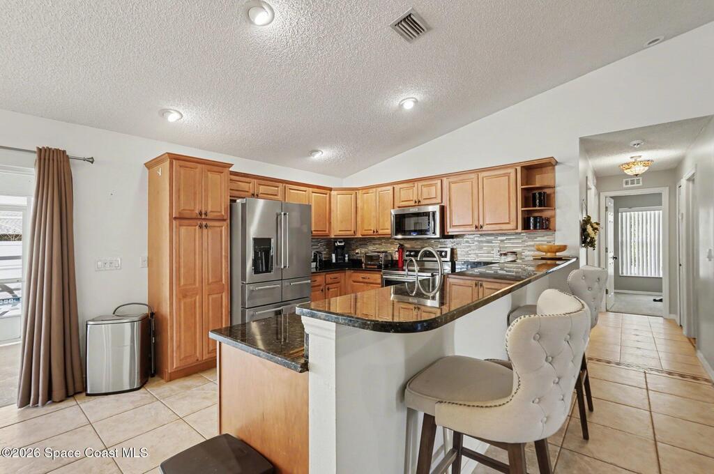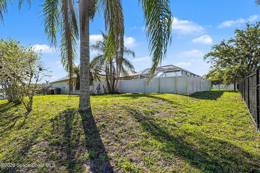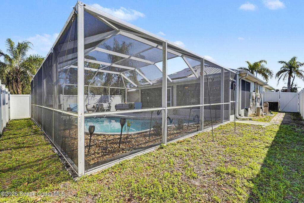 Move-in ready 3BR/2BA solar pool home in Palm Bay with extensive upgrades and energy-efficient features. Open-concept floor plan with vaulted ceilings and abundant natural light. Spacious living and dining areas ideal for entertaining. Split-bedroom layout offers private primary suite with en-suite bath; two additional bedrooms share full hall bath.Major updates include new whole-home solar system (paid off), newer metal roof (2013), newer AC (2023), newer pool heater, newer pool pump, whole-home water filtration system, and granite countertops.Enclosed four-seasons room provides additional flexible living space overlooking the screened pool oasis. Conveniently located near river and beach access, shopping, dining, and Patrick Space Force Base.Energy efficient, well maintained, and move-in ready.
