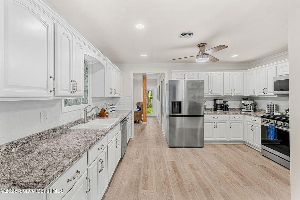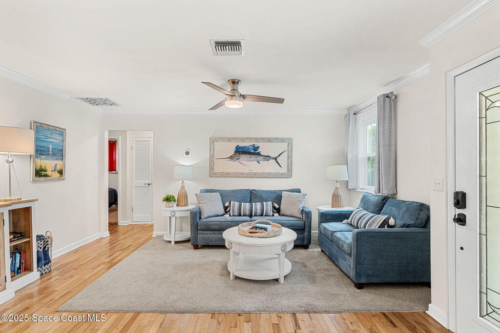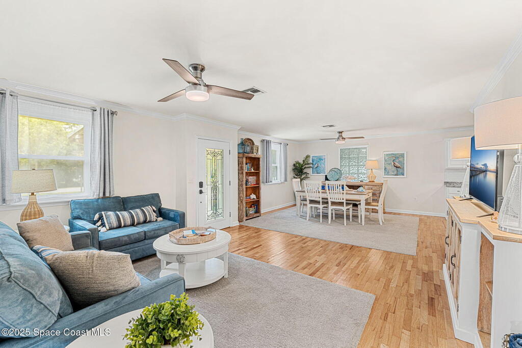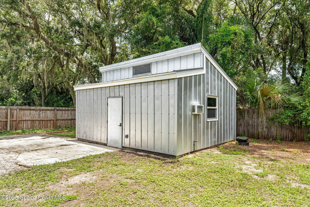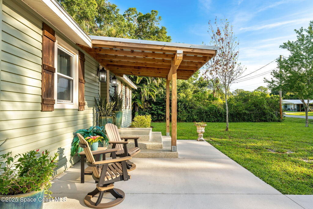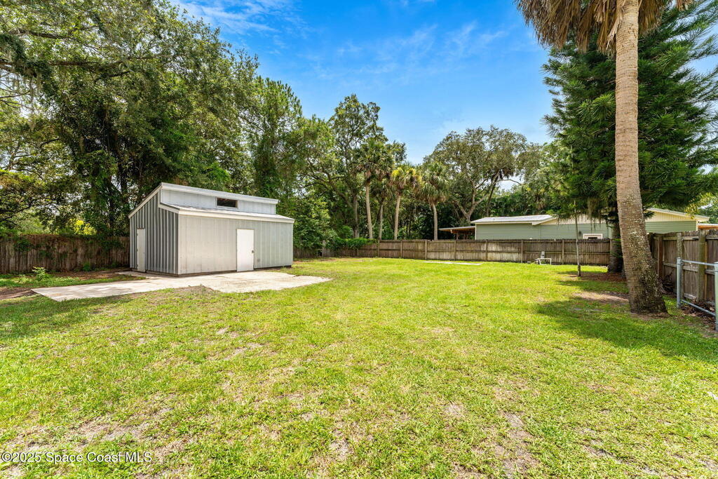 Beautifully renovated and fully furnished, this charming 4BD/2BA home rests on a spacious .52-acre lot w/ the unique opportunity to split the lot and construct an additional residence. Surveys on hand and city approval on setbacks! Loaded w/ updates, Incld crown molding, hardwood pine floors, and impact-rated windows! White cabinetry, SS appliances-2 yrs old, a gas cooktop & a stylish tile backsplash adorn the spacious kitchen. Updated Bathrooms! This split floor plan features a generous back patio, complete w/ a hot tub, perfect for unwinding. The fully fenced yard w/ natural foliage, space for RV/boat parking, plus a large metal shed w/ electricity. Major systems are updated w/ a Nest thermostat, Metal Roof- 2021, HVAC-2025, & New Septic System- 2025. No rental restrictions & the potential to separate the lots and build another home is HUGE! Prime Melbourne location minutes to I-95, Melbourne Int Airport, major employers & beaches! Move-in ready!