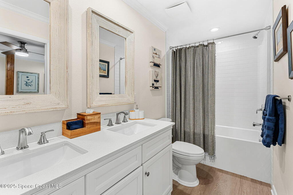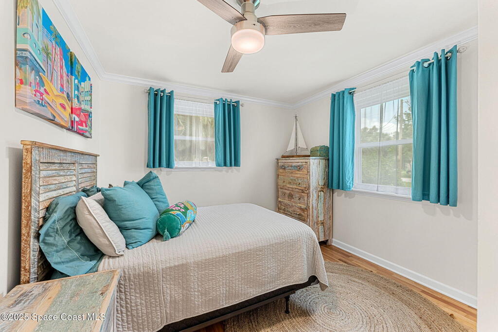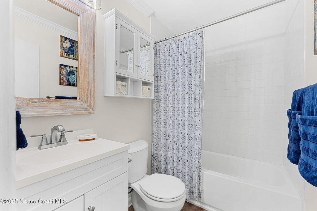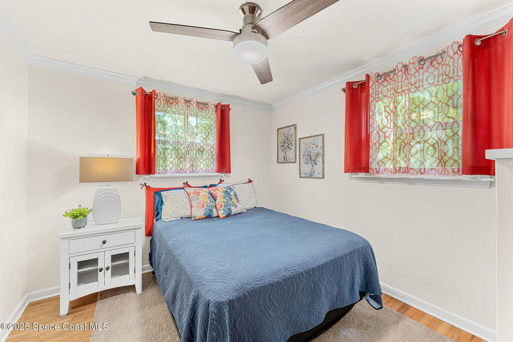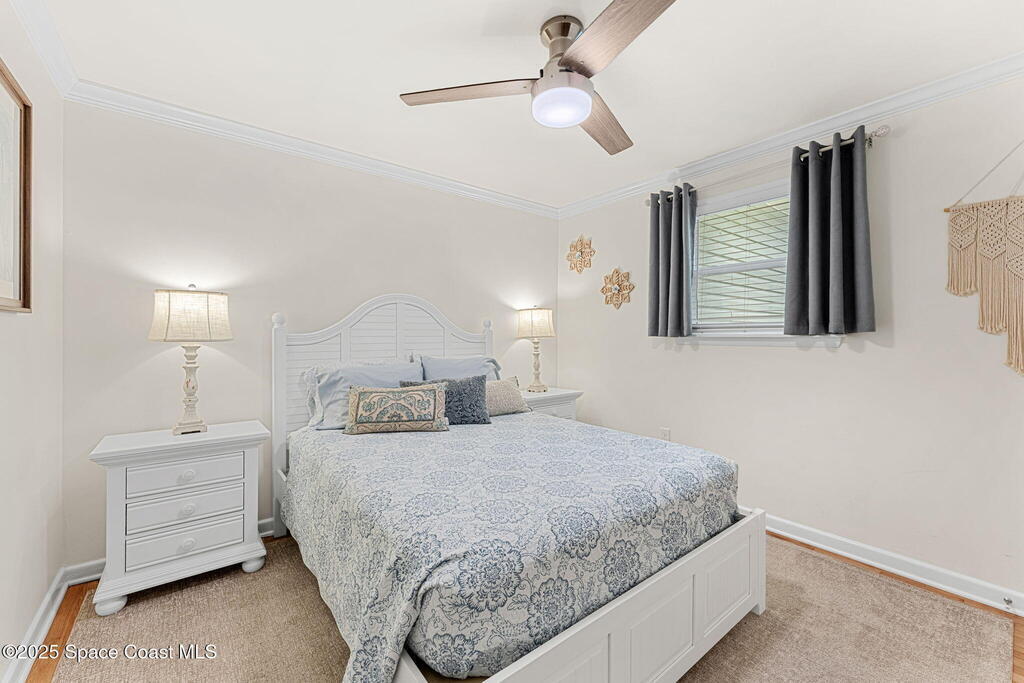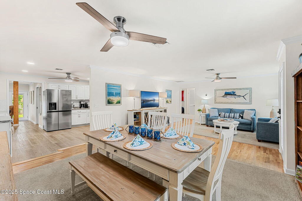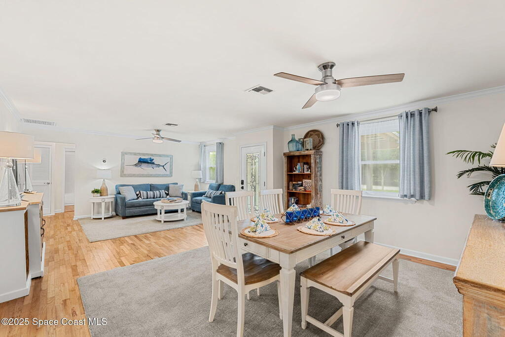 Beautifully renovated and fully furnished, this charming 4BD/2BA home rests on a spacious .52-acre lot w/ the unique opportunity to split the lot and construct an additional residence. Surveys on hand and city approval on setbacks! Loaded w/ updates, Incld crown molding, hardwood pine floors, and impact-rated windows! White cabinetry, SS appliances-2 yrs old, a gas cooktop & a stylish tile backsplash adorn the spacious kitchen. Updated Bathrooms! This split floor plan features a generous back patio, complete w/ a hot tub, perfect for unwinding. The fully fenced yard w/ natural foliage, space for RV/boat parking, plus a large metal shed w/ electricity. Major systems are updated w/ a Nest thermostat, Metal Roof- 2021, HVAC-2025, & New Septic System- 2025. No rental restrictions & the potential to separate the lots and build another home is HUGE! Prime Melbourne location minutes to I-95, Melbourne Int Airport, major employers & beaches! Move-in ready!